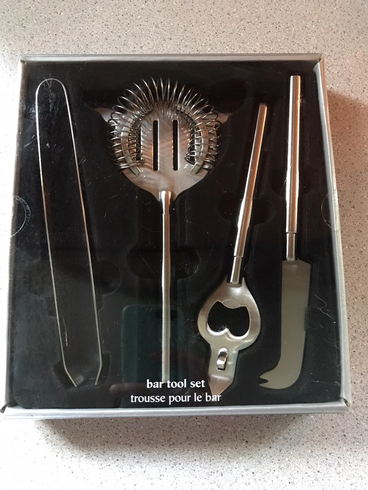 Pier 1 Imports 4 Piece Bar Tool Set: Tongs Strainer Bottle Opener Knife NIB.