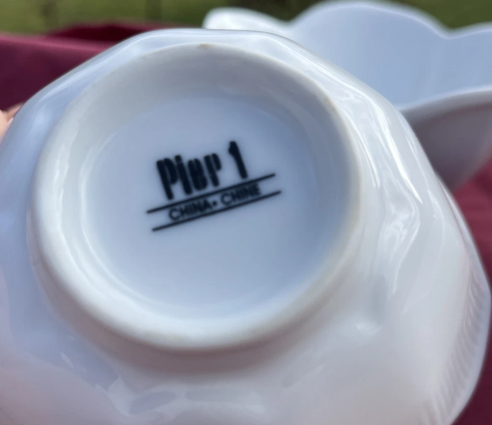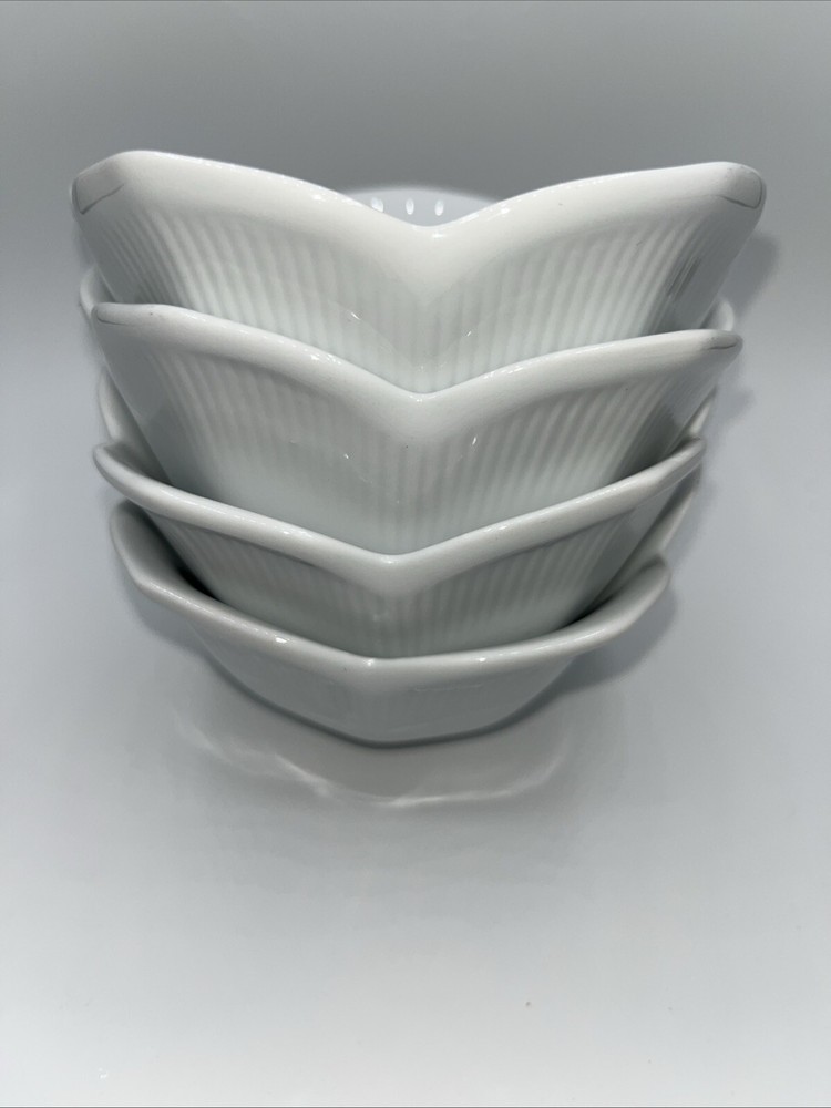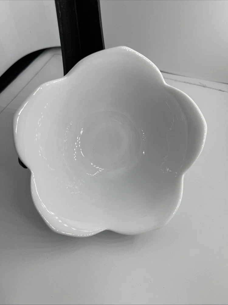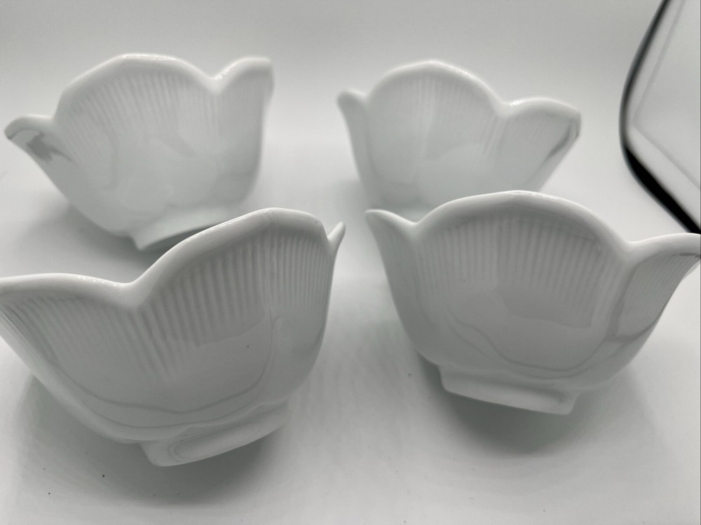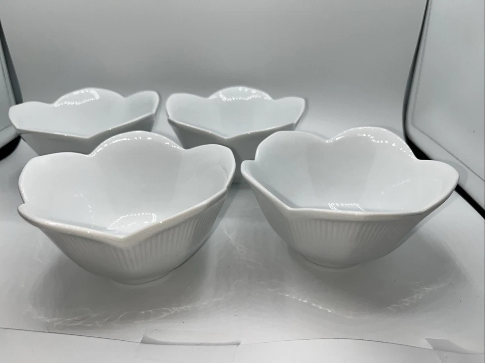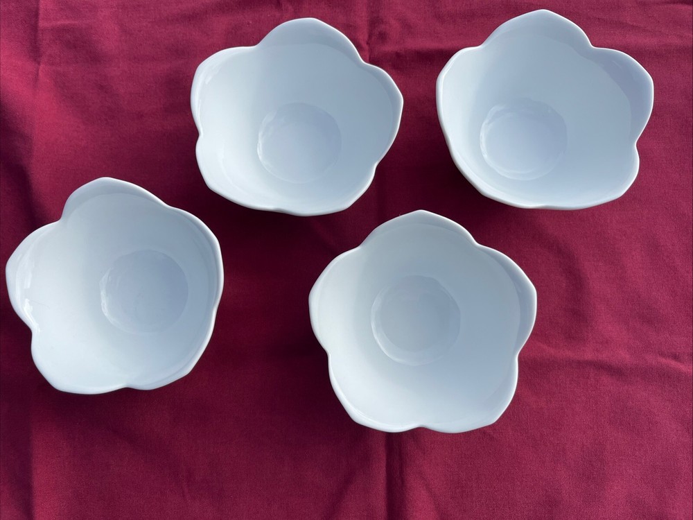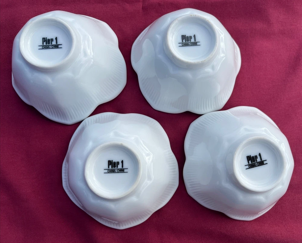 Pier 1 Imports presents a set of four elegant, white porcelain bowls with a Lotus pattern, measuring 4.25" in diameter and 2" in height. These contemporary bowls are suitable for all occasions, featuring a glossy finish and a printed backstamp from China. Ideal for serving various dishes and look great as table decorations serving nuts, mints or chocolates. The elegant flower-themed design adds a touch of art pottery to your tableware collection. Very clean and elegant. Condition is mint.