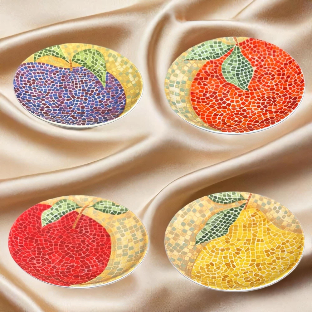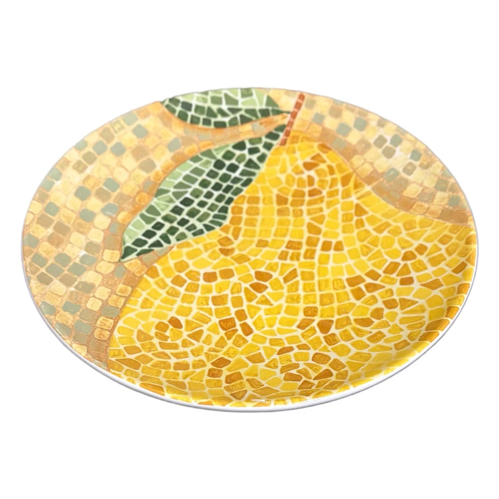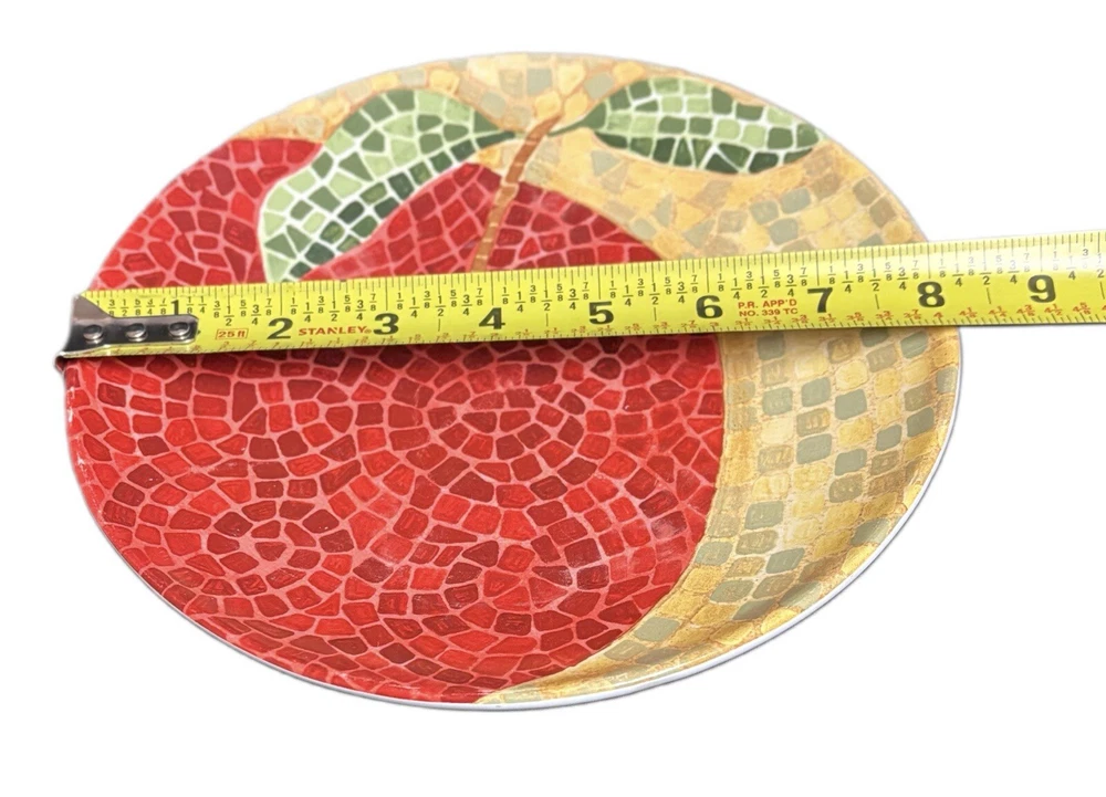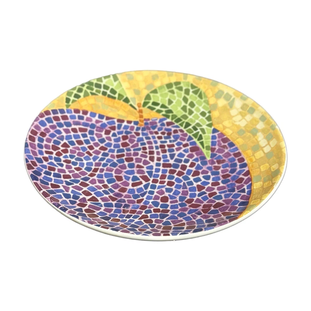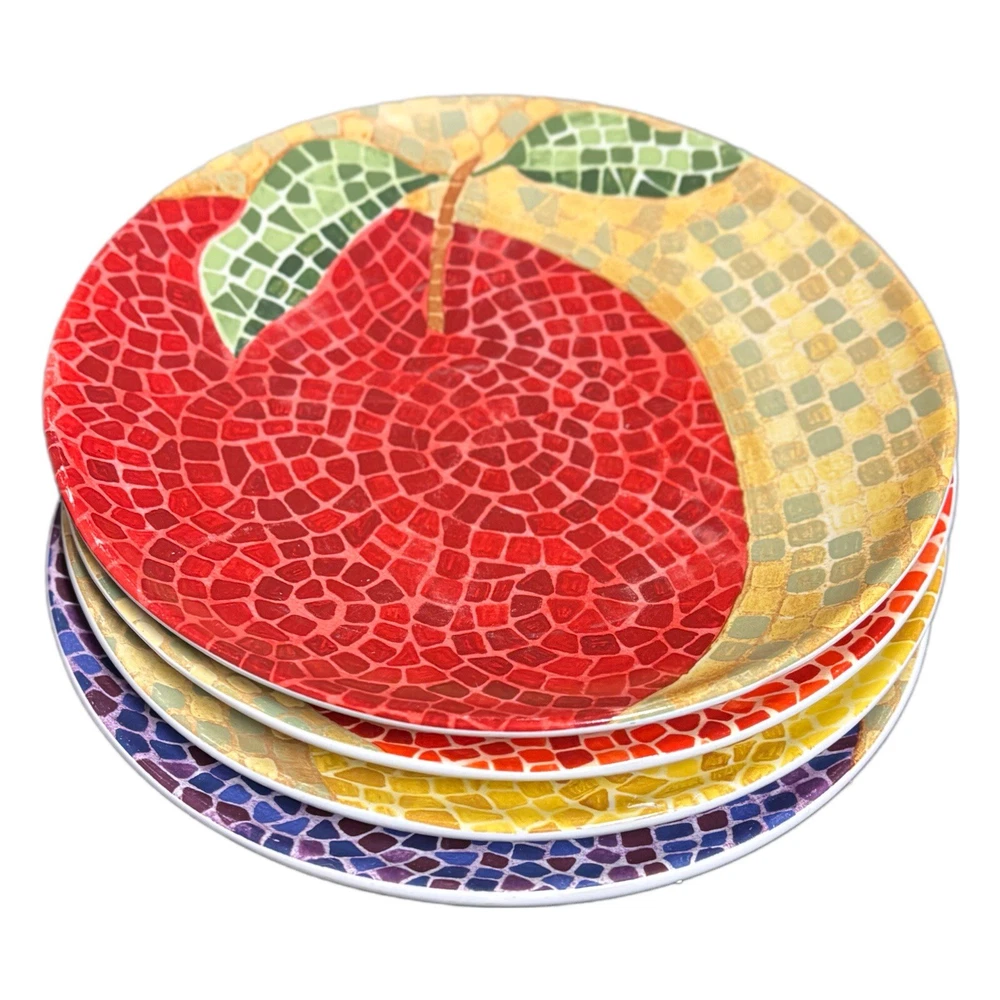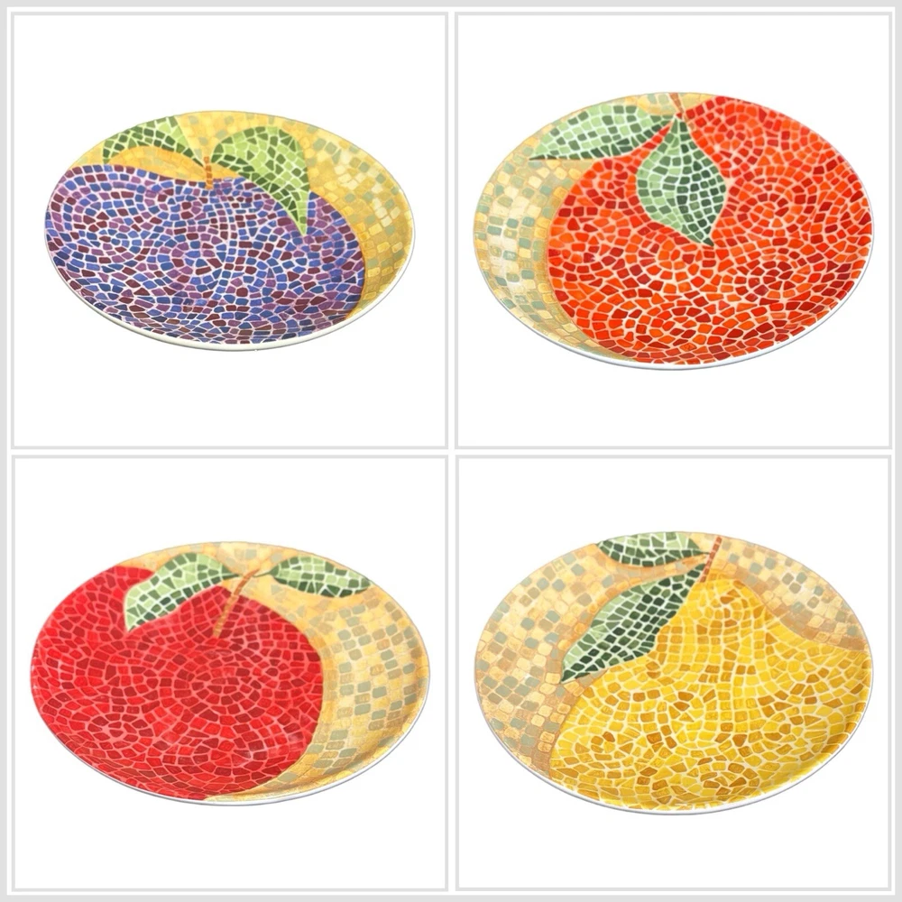 Add a touch of versatility and charm to your dining setting with this four-piece set of Pier 1 Imports Salad Plates. Each plate showcases a vibrant mosaic fruit pattern with an eclectic mix of apple, orange, plum, and pear designs, creating a delightful fruit orchard theme. The glossy stoneware plates are thoughtfully designed, stackable, and feature a round shape measuring 8 1/8 inches in diameter, perfect for a variety of occasions. Crafted with care, these plates are both dishwasher and microwave safe, ensuring easy maintenance and practical use. The set is an original production from Pier 1 Imports, bearing the distinctive Mosaic Fruit pattern that adds a decorative flair to any table. Whether for everyday use or special gatherings, these plates are sure to be a conversation starter. Very Good Condition Minor Light Scratch, Slight manufacture Flaws, No Cracks or Chips.No Original Box- Please View Item Pictures For Additional Detail Such As Condition, Colors, Designs, Or Styles. Let Me Know If You Have Any Questions Thank You For Visiting My Store Golden Gate Emporium And Have A Great Shopping Day!
