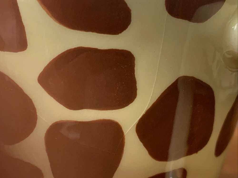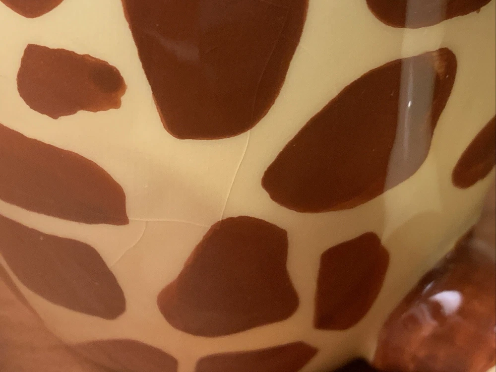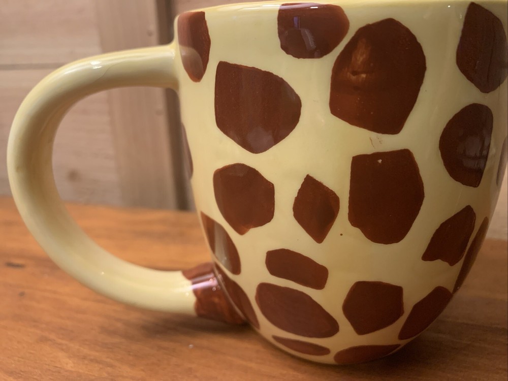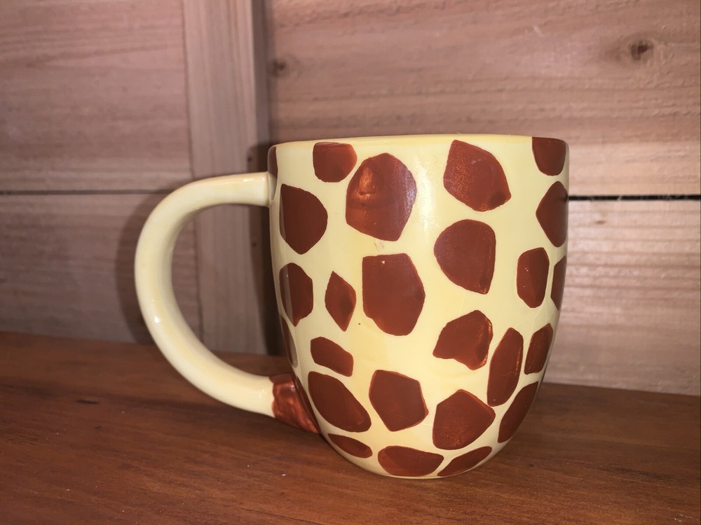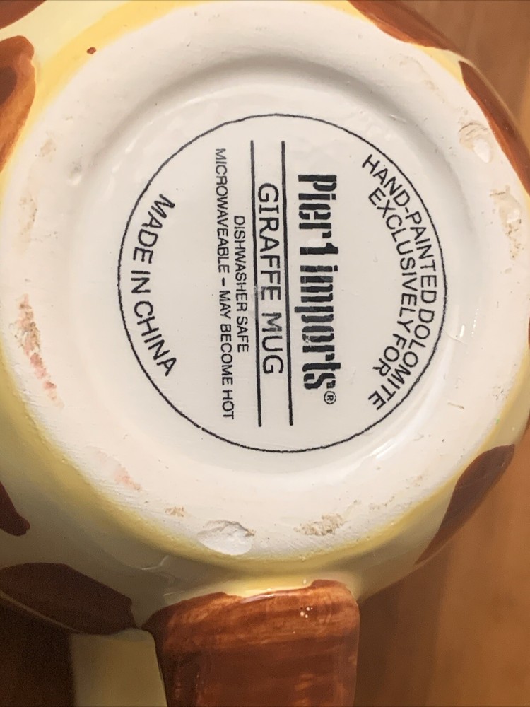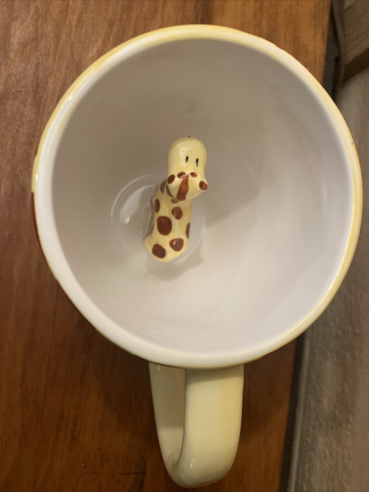 Add some surprise and fun to your morning coffee routine with this Pier 1 Imports coffee mug. The outside features a hand-painted yellow animal print of a giraffe with a baby inside, making it the perfect choice for those looking to add a touch of whimsy to their hot or cold beverage. This contemporary round ceramic and porcelain mug has a capacity of 8 oz and measures 4 inches in height and 5.5 inches in width. It also features convenient handle, and is both microwave and dishwasher safe. Some glazing, some imperfections in the hand painting, see pics.