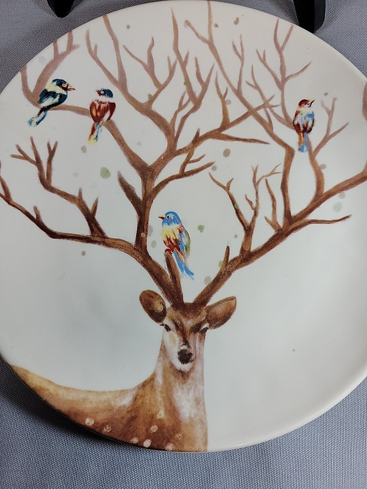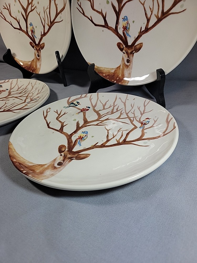 Bring a touch of nature to your dining table with this set of four Pier 1 Imports luncheon plates. Each plate features a beautiful deer and bird design, perfect for any occasion. The plates are made of high-quality ceramic and are dishwasher safe for easy cleaning. The plates measure 8.75 inches in diameter and have a round shape. They are original Pier 1 products and were manufactured in China between 2010 and 2019. These decorative plates are perfect for any winter or all-occasion dinner party.