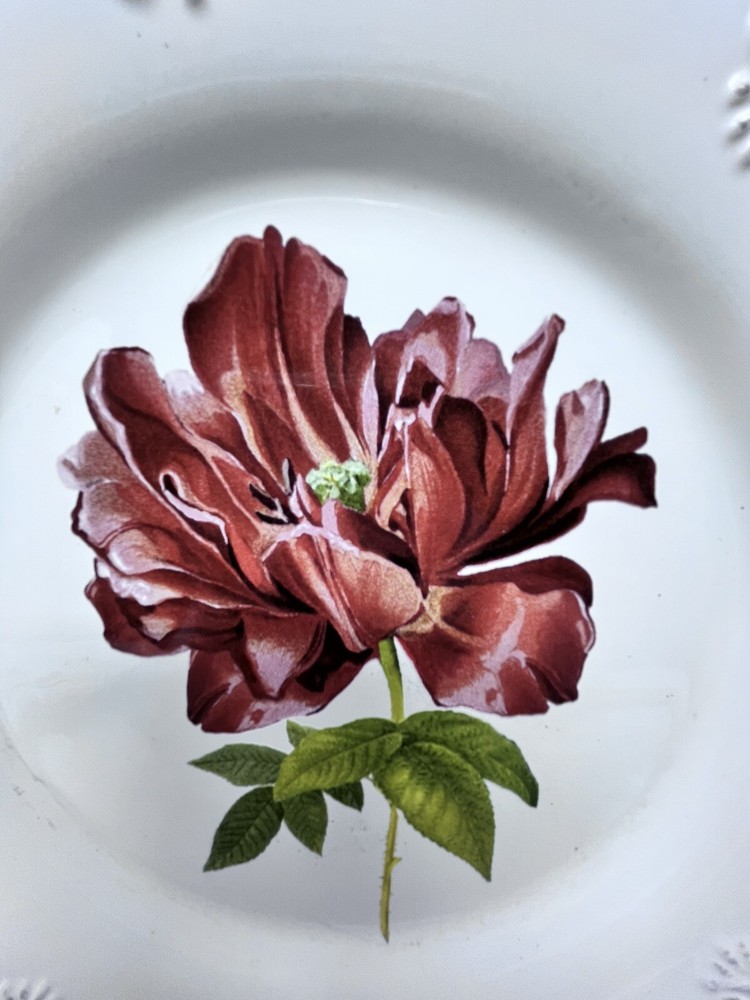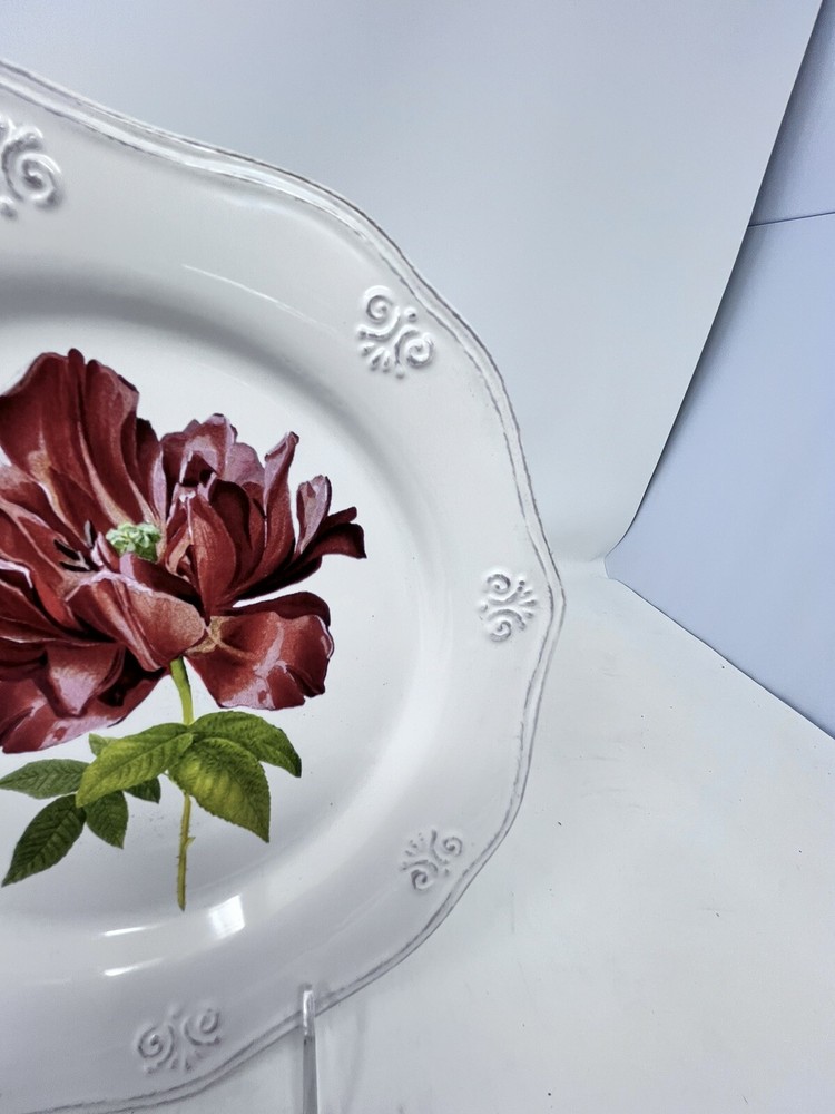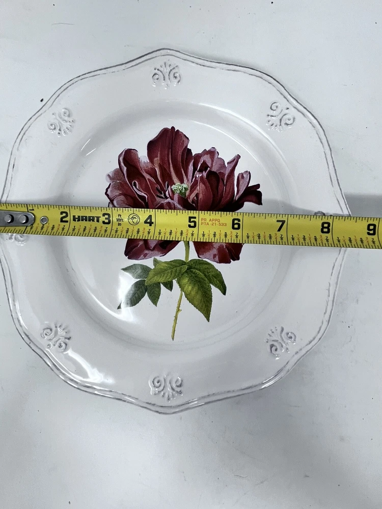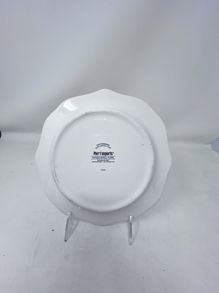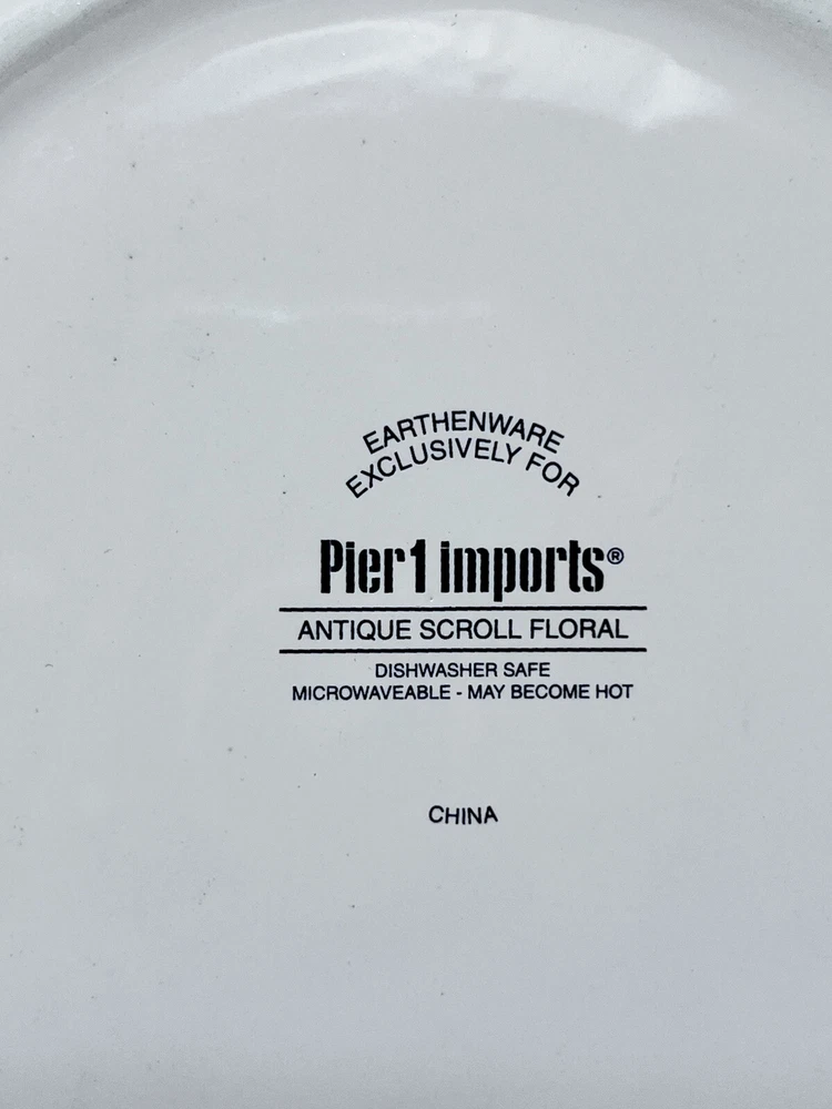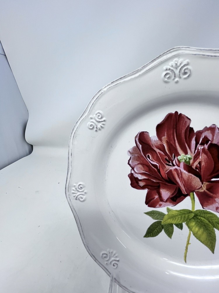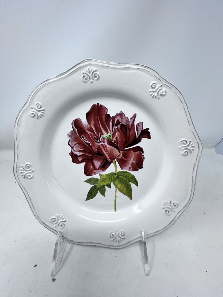 Add a touch of elegance to your dining table with this beautiful antique scroll floral red peony dessert/salad plate from Pier 1. The 8 1/2" round plate features a stunning multicolor design that is perfect for all occasions. Made of high-quality stoneware and ceramic materials, this contemporary original plate is manufactured using art pottery techniques. The plate has a glossy finish and is printed with the brand's backstamp. It weighs 15 oz and is an original production from the Pier One product line. This salad plate is perfect for serving your favorite desserts or salads and will make a great addition to your collection. Vintage items may have flaws in glazing or minor crazing due to age. All are in great condition with no chips or cracks. Please check out my other listings for coordinating item. Price is per piece or set as described.