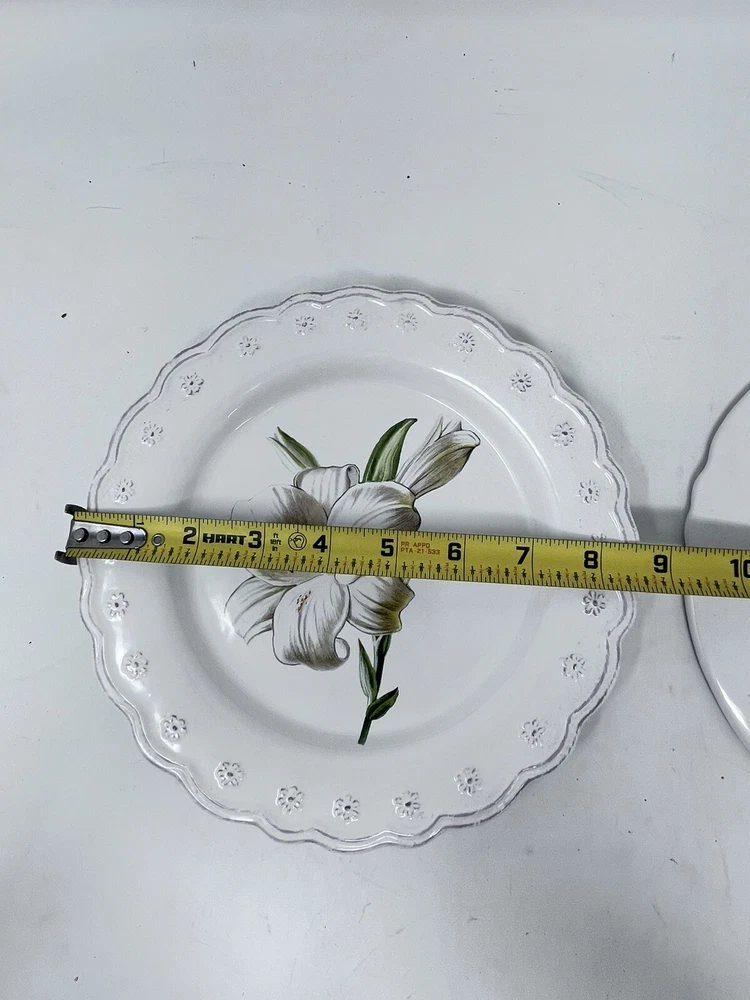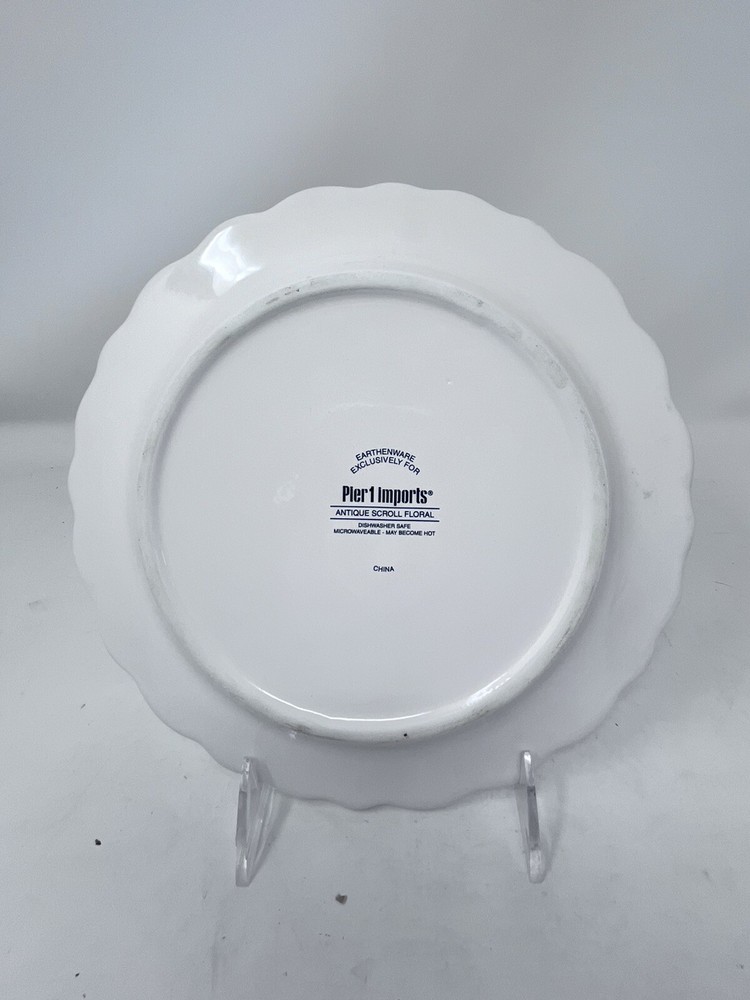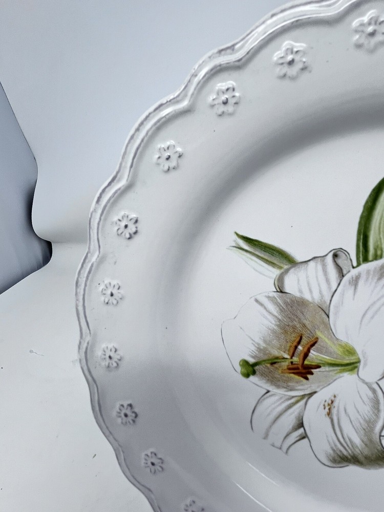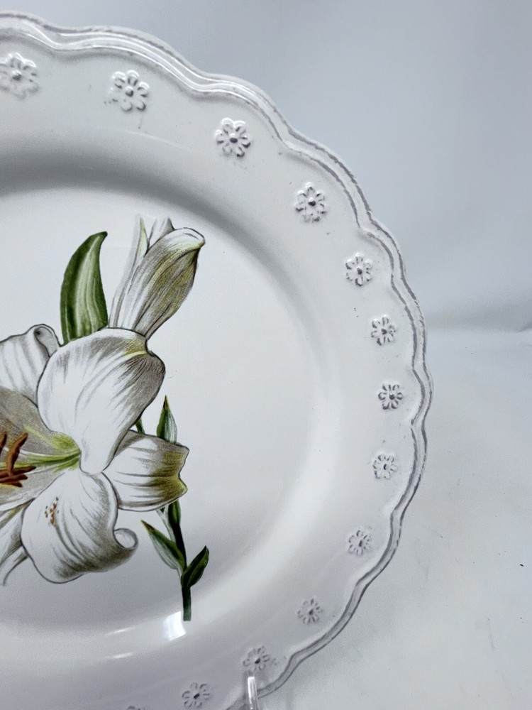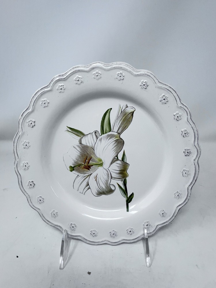 Add a touch of elegance to your dining table with this beautiful antique scroll floral white lily dessert/salad plate from Pier 1. The plate has a round shape and measures 8 1/2 inches in diameter. It features a stunning multicolor design that is perfect for all occasions. Crafted from high-quality stoneware and ceramic materials, this contemporary original salad plate is an ideal addition to your collection. The plate is printed with the Pier 1 backstamp and has a glossy finish. It weighs 15 oz and is an original licensed reproduction. Use it to serve your favorite salad or dessert and impress your guests with its stylish design. Vintage items may have flaws in glazing or minor crazing due to age. All are in great condition with no chips or cracks. Please check out my other listings for coordinating item. Price is per piece or set as described.