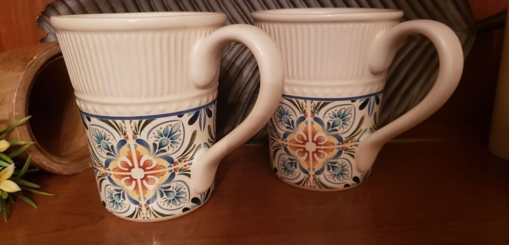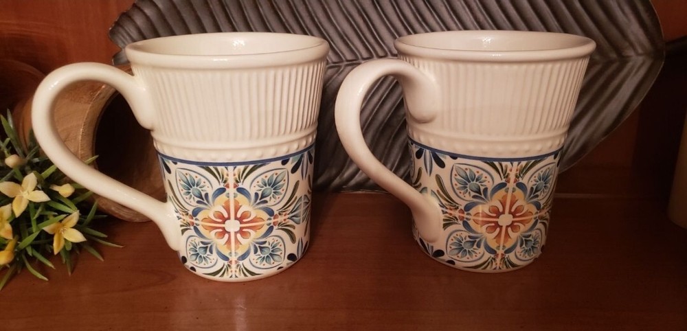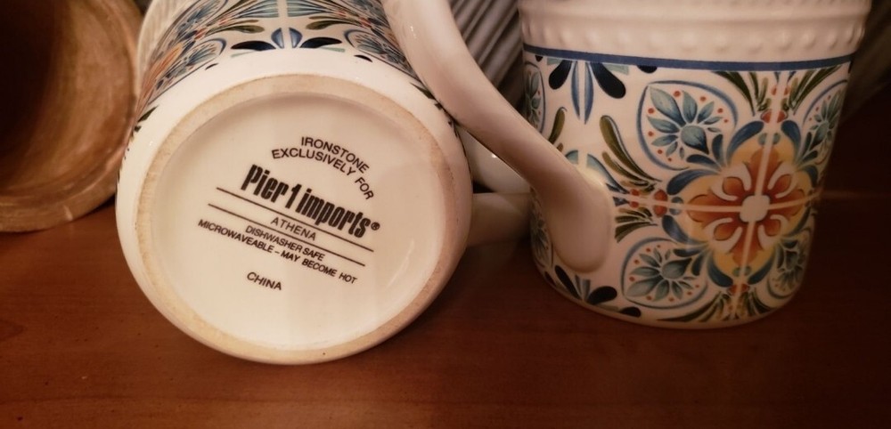 Pier 1 Imports "Athena" Ironstone Mugs Set Of 2 As pictured, Set of 2 Pier 1 Athena Coffee Mugs. They are new, never used. I purchased these a few years back and they have been on display in my China hutch ever since. I have a 12 piece set , im just downsizing to accommodate a few more treasures If you are interested in other coordinating pieces I also have listed matching salad plates, soup / cereal bowls and dinner plates