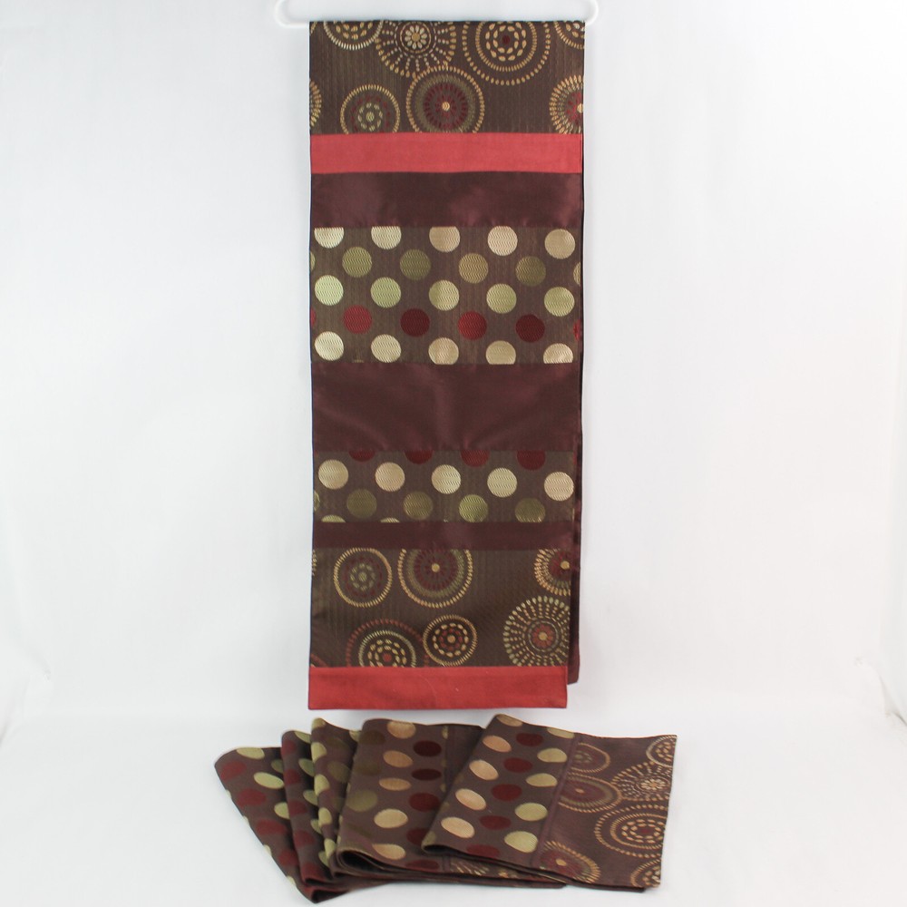 Add a playful touch to your dining experience with these Pier 1 Imports polka dot placemats and table runner. This set includes 6 placemats measuring 14x20" and a matching table runner of 14x71". In good pre-owned condition, these vibrant textiles are perfect for entertaining or everyday use.