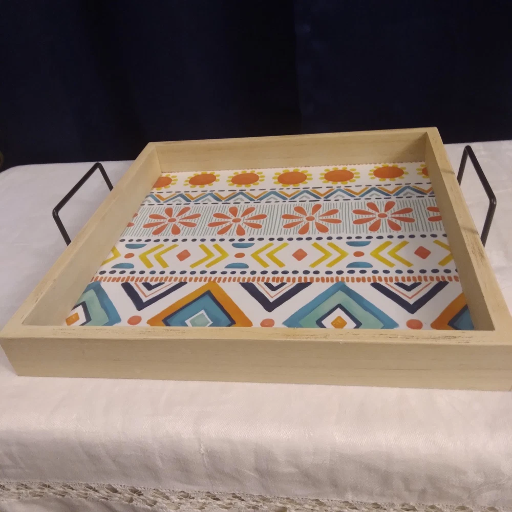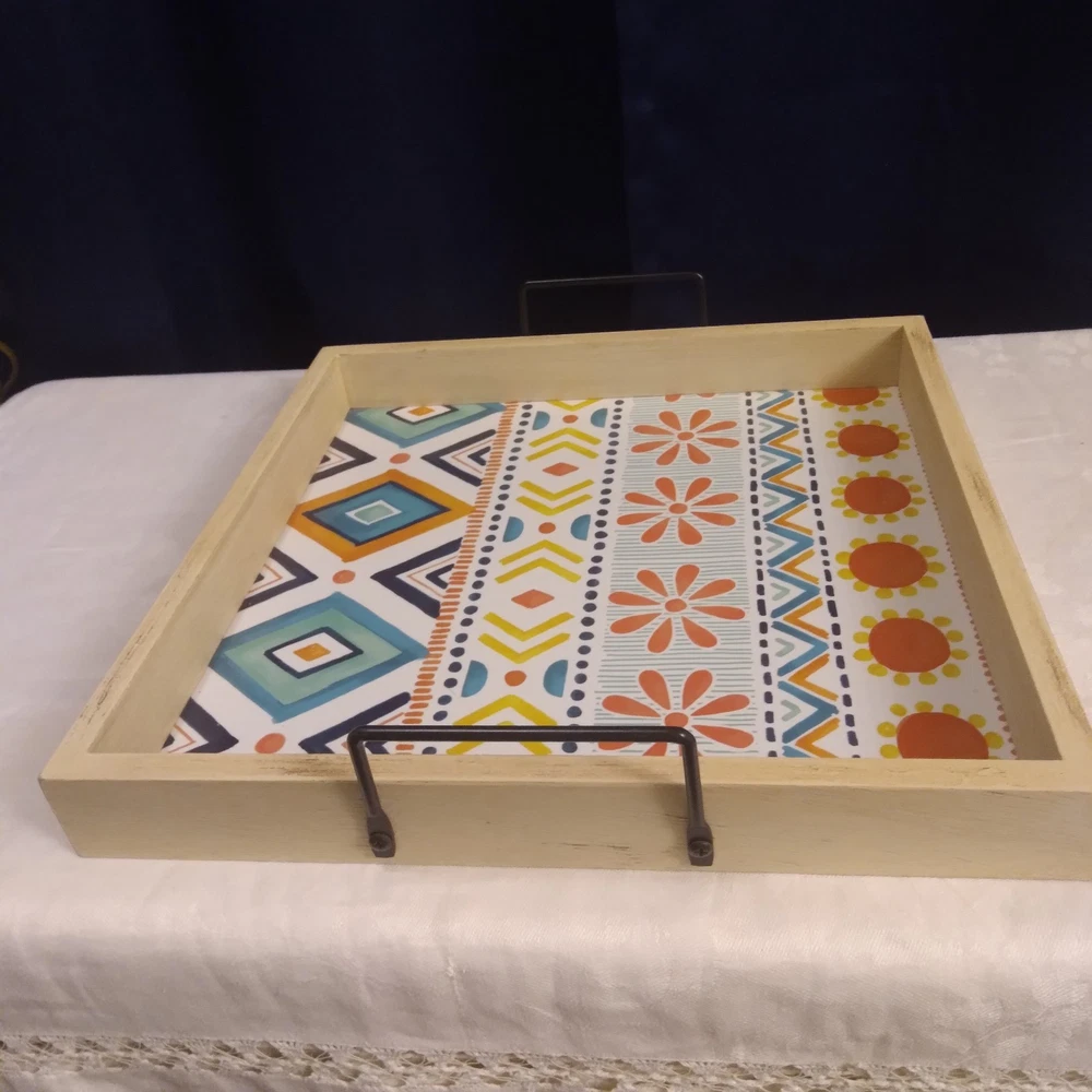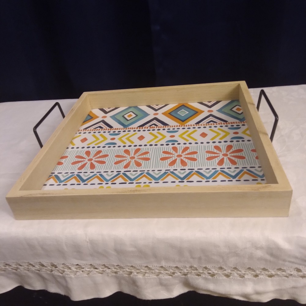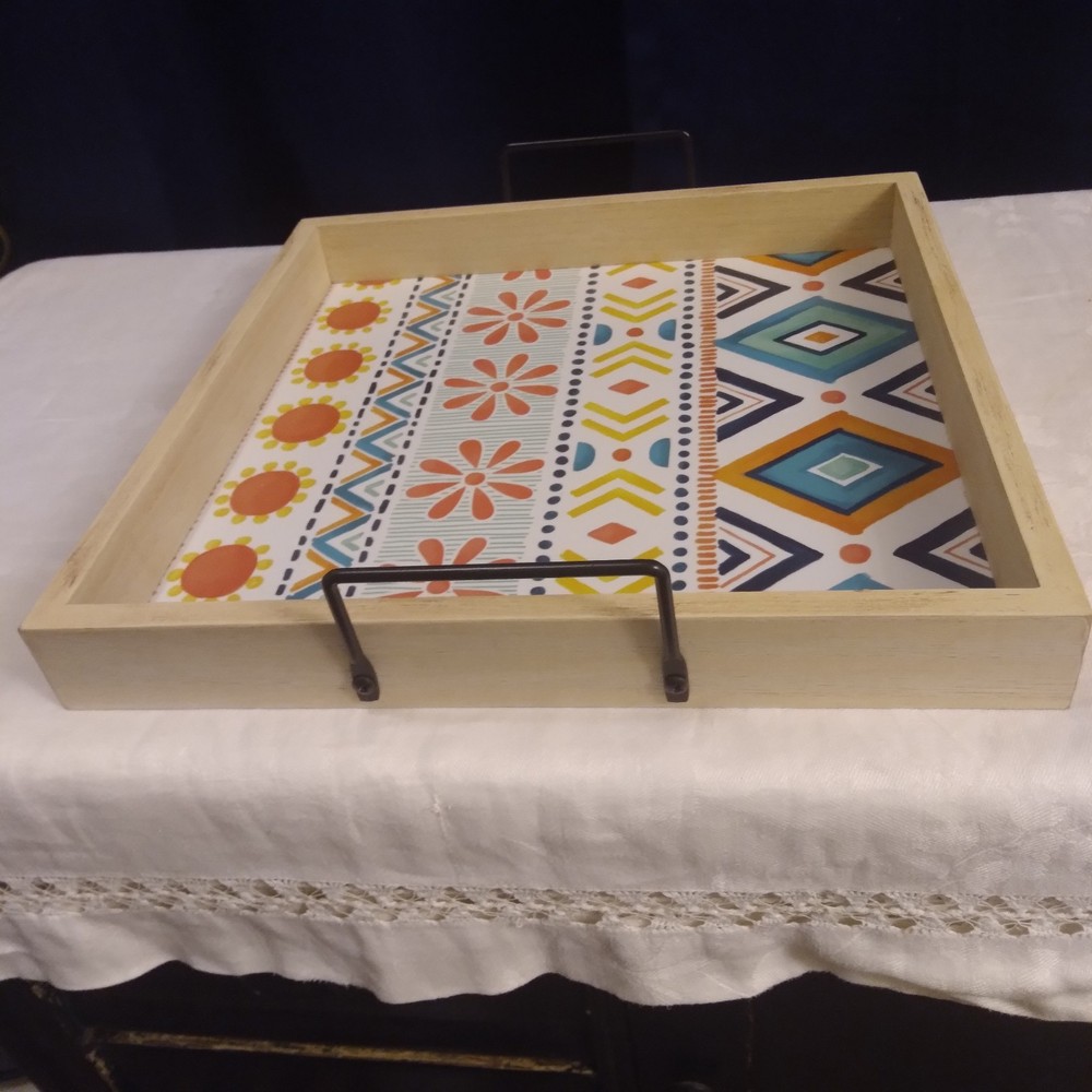 VERY NICE SERVING TRAY CAN USE OUTSIDE OR INSIDE, FOR HOME DECOR, YOU COULD ALSO SAY IT HAS A BOHO STYLE, MANY USES...