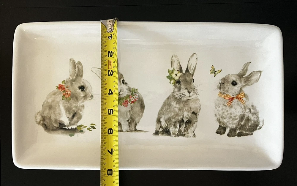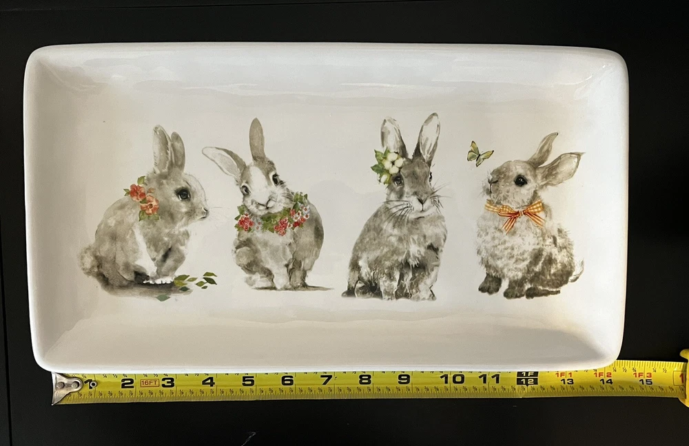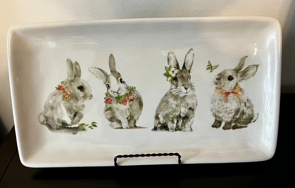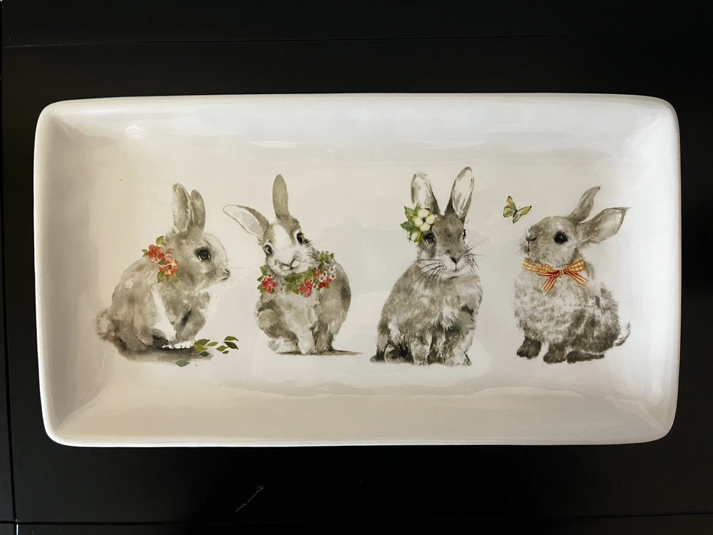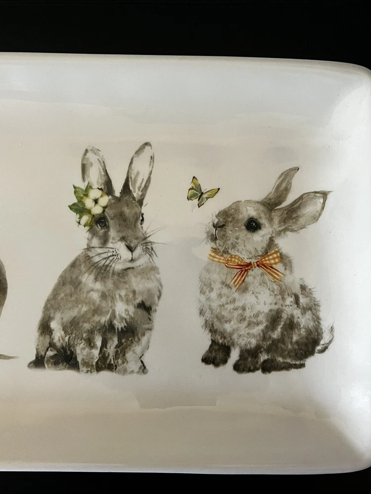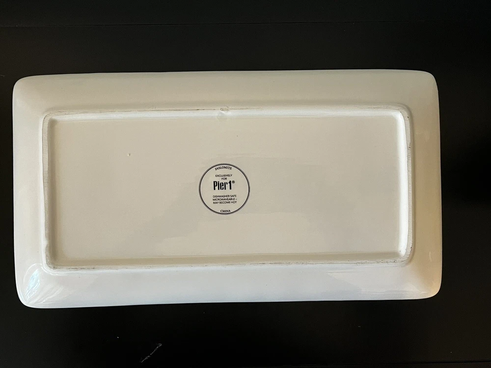 Add a touch of Easter to your dining table with this Pier 1 Imports Bunny Pals 14" platter. The rectangular shape and ivory dolomite material make it the perfect medium-sized snack platter for any occasion. The platter features a cute bunny rabbit, flower, and butterfly design that is sure to impress your guests. This microwave and dishwasher safe platter is the ultimate addition to your dinnerware and serveware collection. Made in China, it measures 14 inches in length and 8 inches in width. Get ready to serve your favorite treats in style with this adorable Bunny Pals platter. **No Box