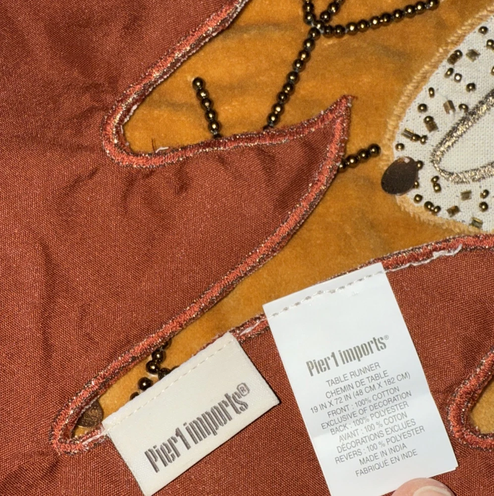Pier1 imports® TABLE RUNNER CHEMIN DE TABLE 19 IN X 72 IN (48 CM X 182 CM) FRONT: 100% COTTON EXCLUSIVE OF DECORATION BACK: 100% POLYESTER AVANT : 100 % COTON DÉCORATIONS EXCLUES REVERS: 100 % POLYESTER MADE IN INDIA FABRIQUÉ EN INDE Like new condition, comes from a smoke free home 🖤