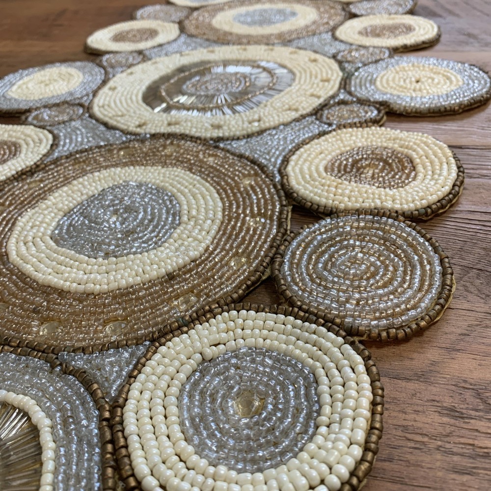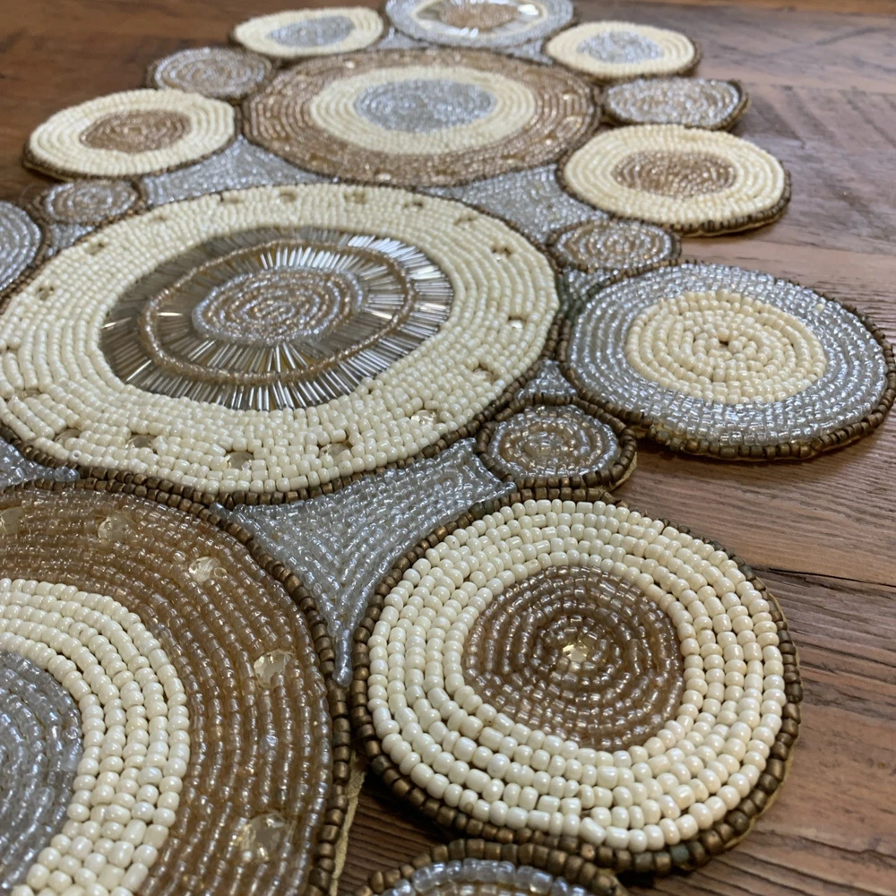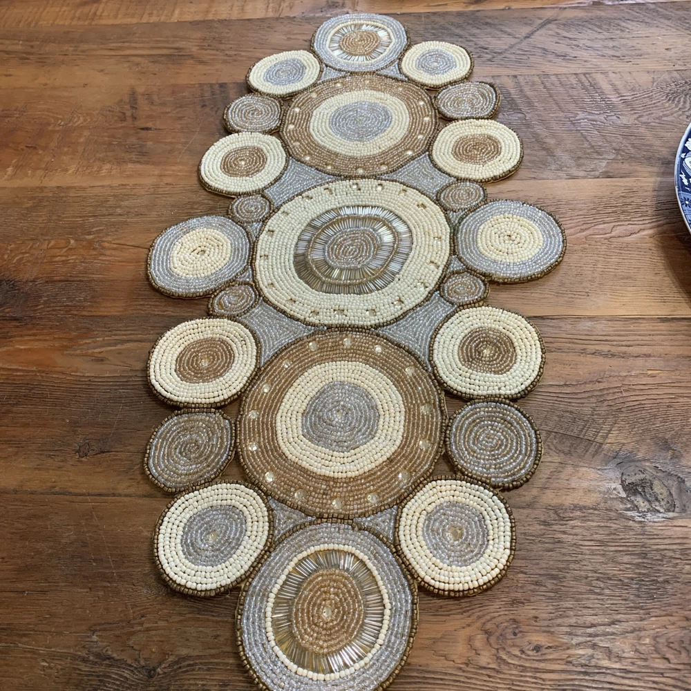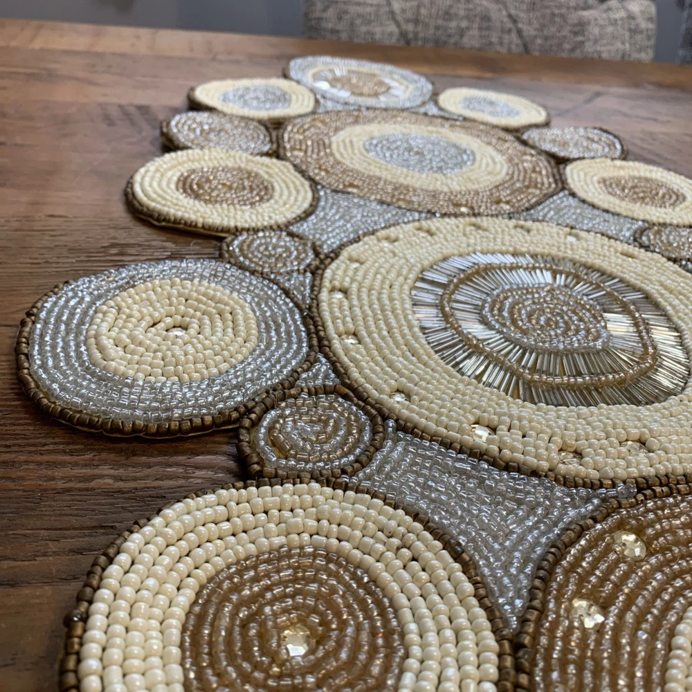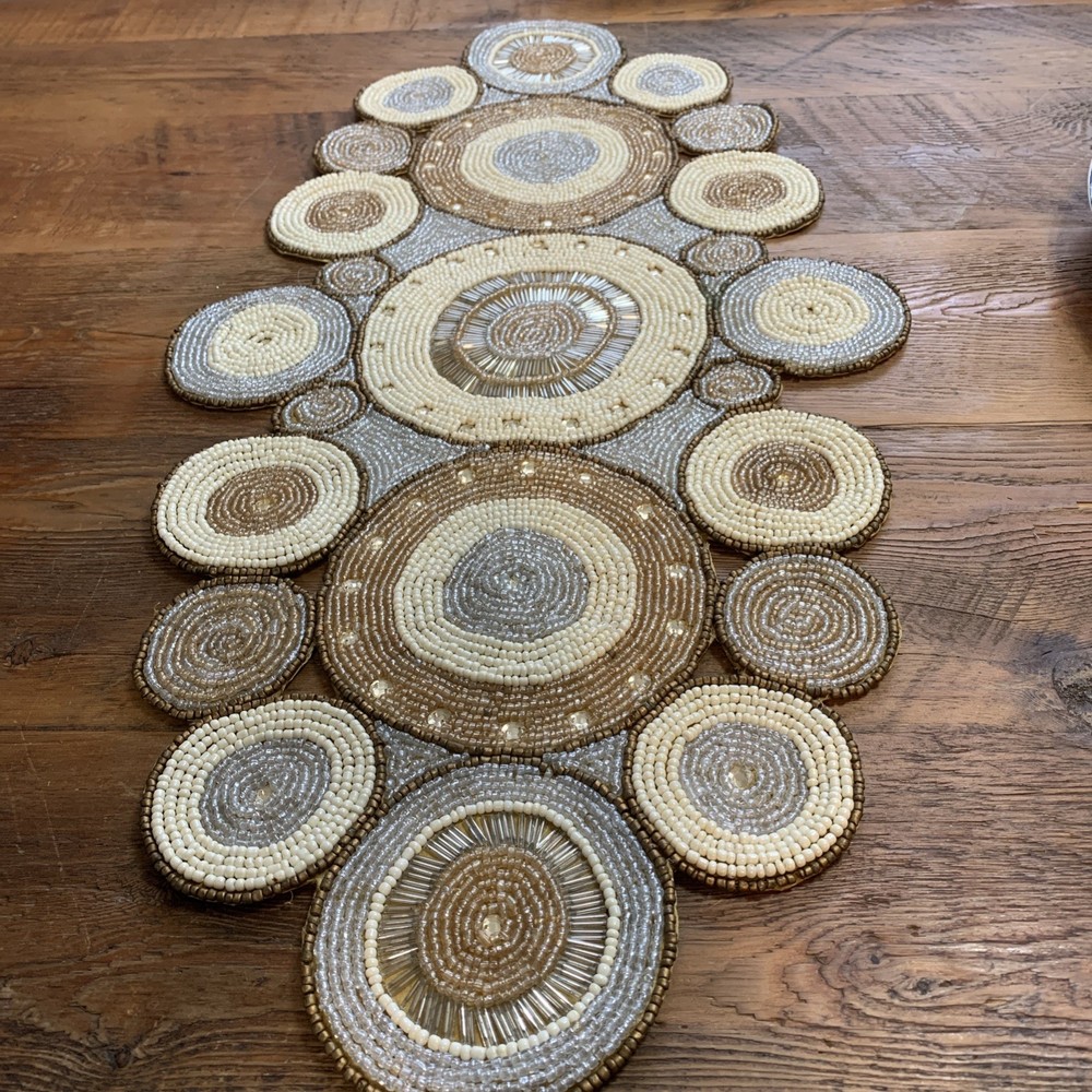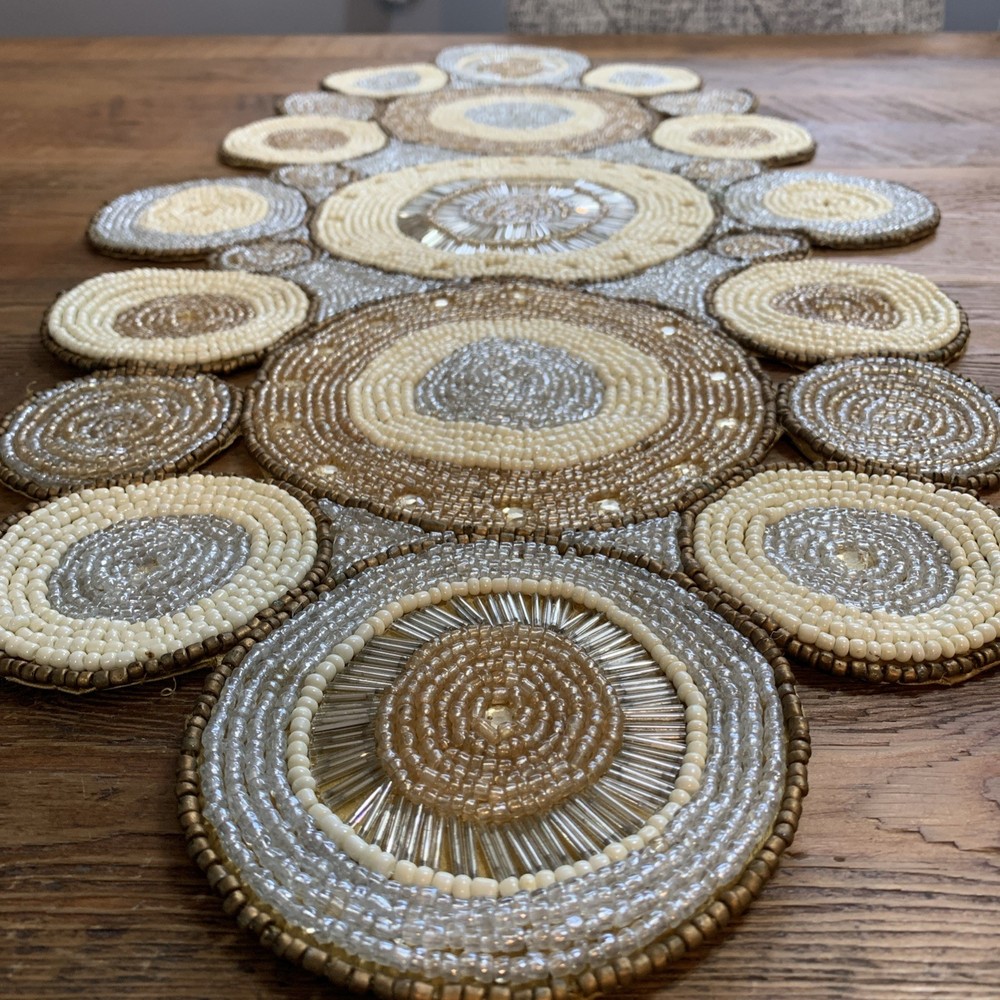 Add a touch of elegance to your holiday table settings with this exquisite Pier 1 Imports Beaded Table Runner. Its stunning geometric pattern and oblong shape are perfectly suited for a variety of occasions, whether you're celebrating Christmas, fall, or hosting a special event. The intricate beading provides a luxurious texture that enhances the runner's classic style. Crafted from high-quality 100% polyester, this table runner measures less than 40 inches in length and ranges from 10 to 15 inches in width, making it a versatile choice for your dining or living space. The rich gold color complements a multitude of décor themes and adds a sophisticated finish to any table arrangement. Proudly made in India, this piece is a timeless addition to your home.