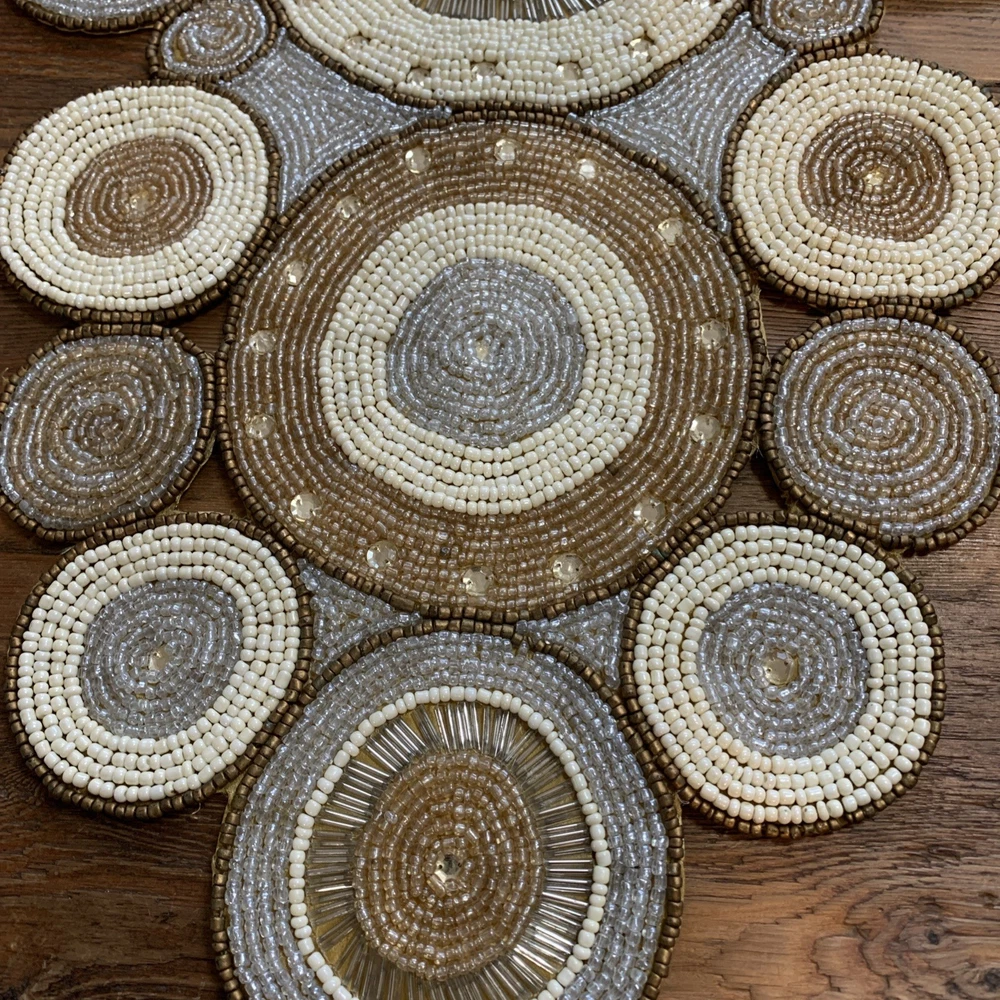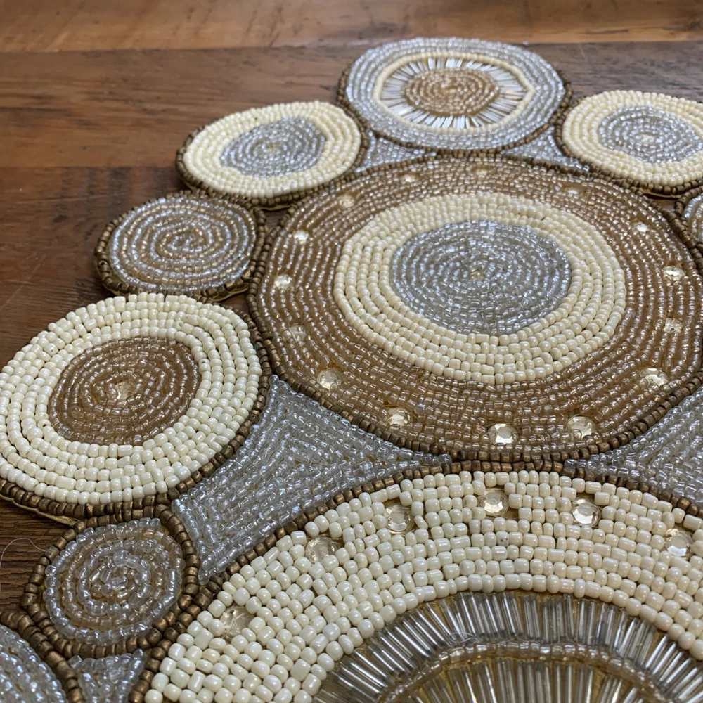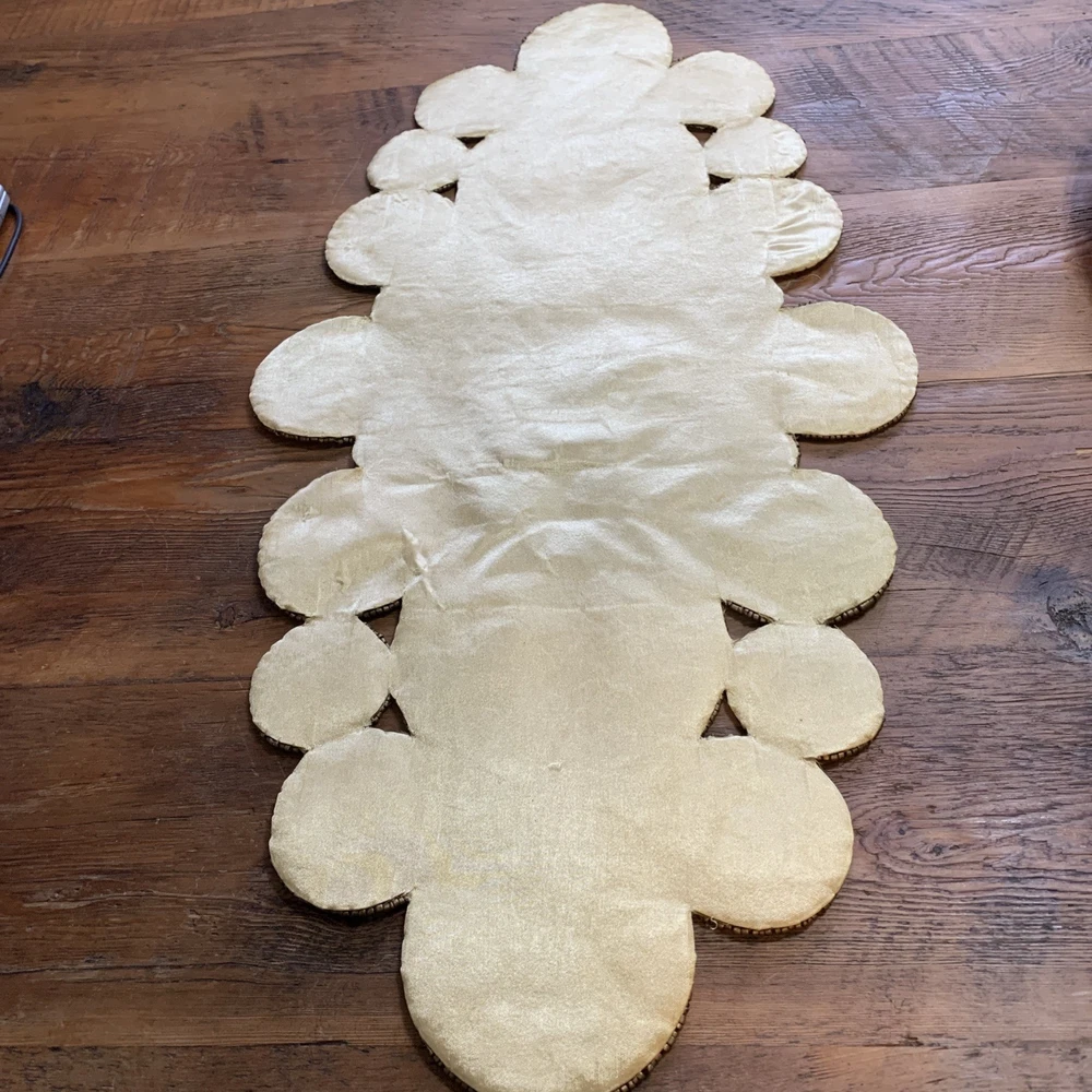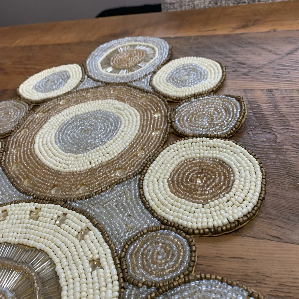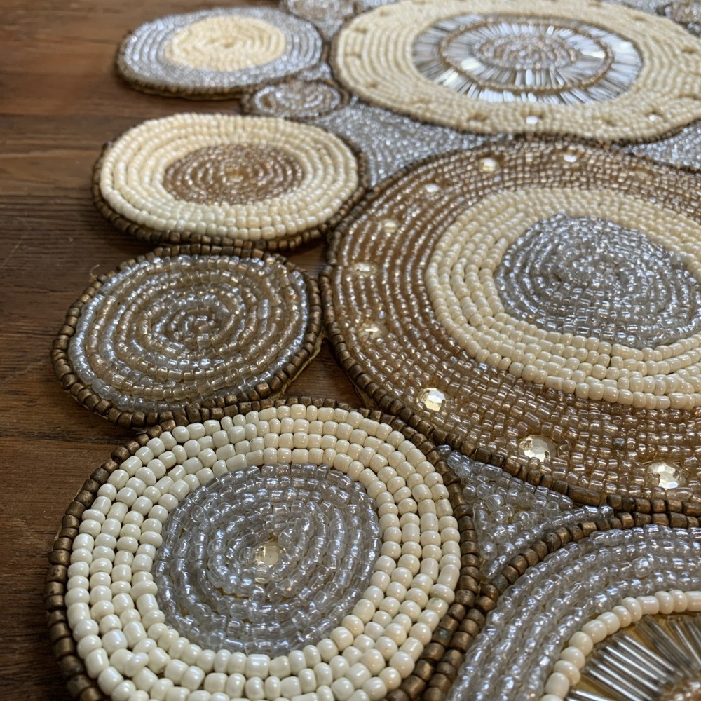 Add a touch of elegance to your holiday table settings with this exquisite Pier 1 Imports Beaded Table Runner. Its stunning geometric pattern and oblong shape are perfectly suited for a variety of occasions, whether you're celebrating Christmas, fall, or hosting a special event. The intricate beading provides a luxurious texture that enhances the runner's classic style. Crafted from high-quality 100% polyester, this table runner measures less than 40 inches in length and ranges from 10 to 15 inches in width, making it a versatile choice for your dining or living space. The rich gold color complements a multitude of décor themes and adds a sophisticated finish to any table arrangement. Proudly made in India, this piece is a timeless addition to your home.