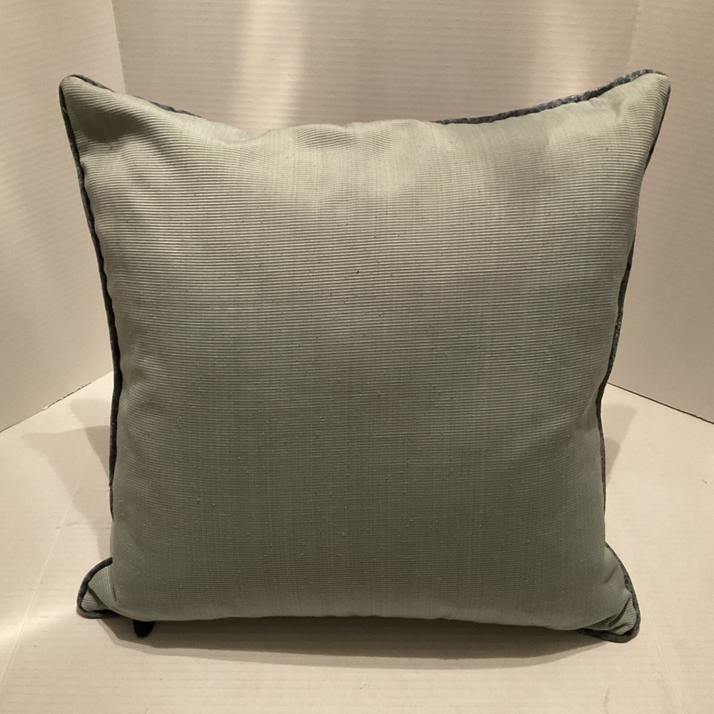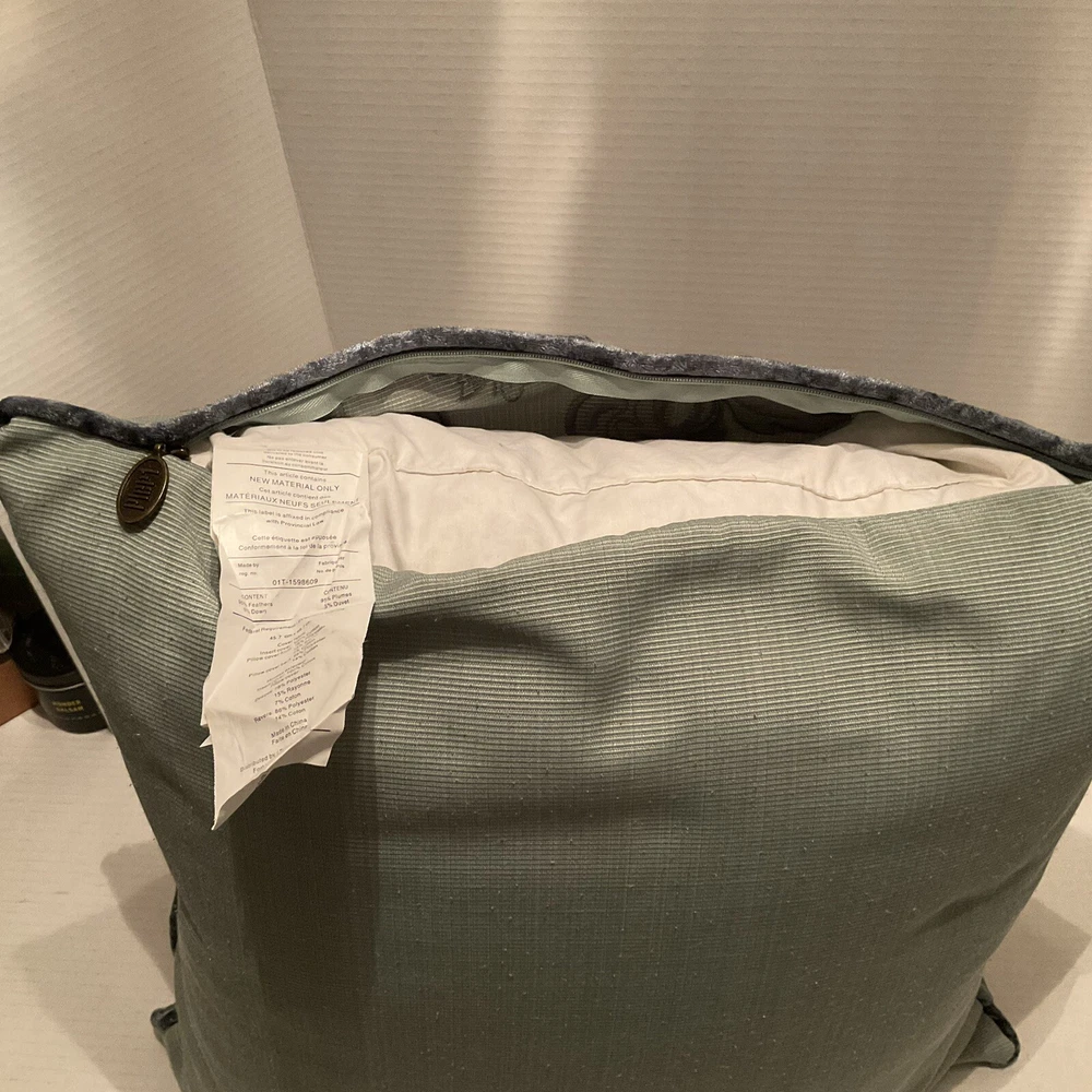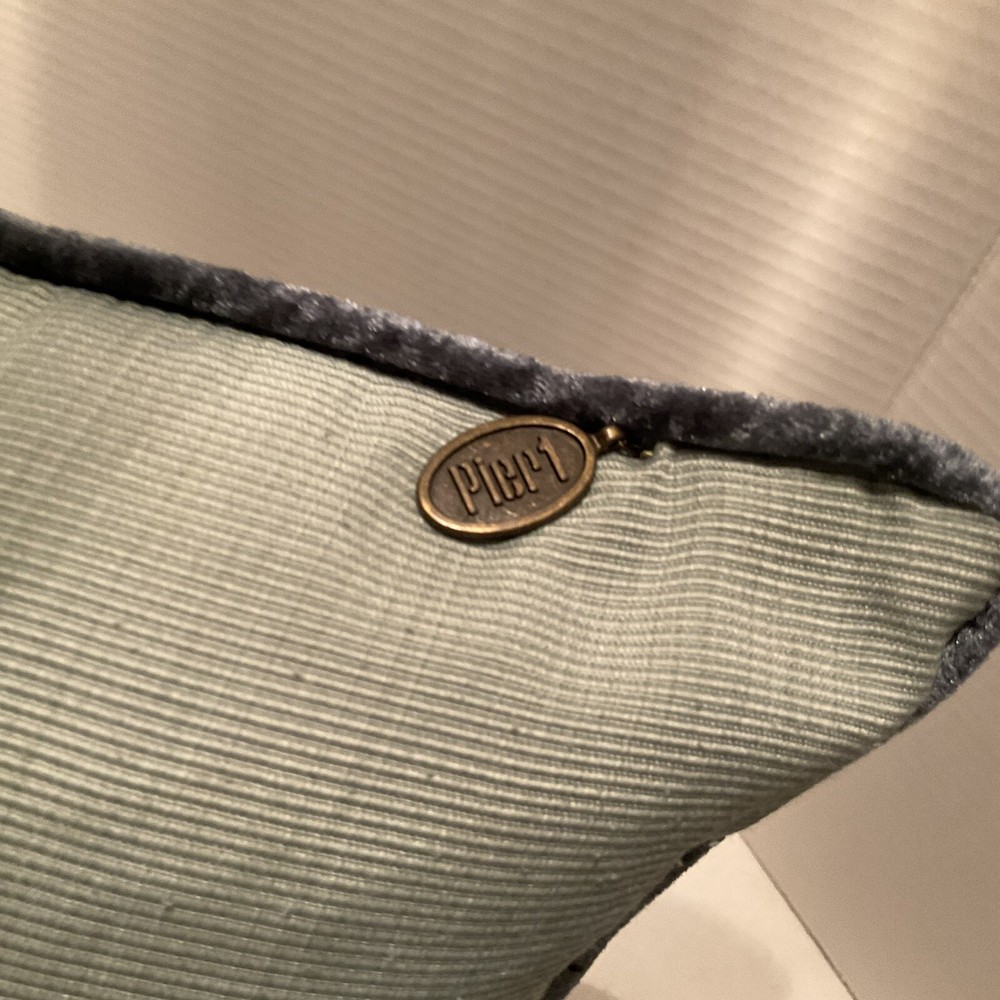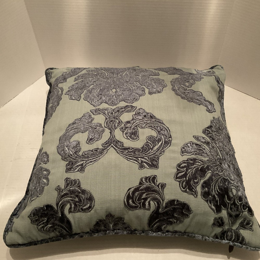 This Pier 1 Imports throw pillow features a vibrant blue and green floral design in a luxurious brocade material. Measuring 18 x 18 inches, it is filled with a mix of down and feathers for a comfortable feel. The pillow is adorned with a beautiful floral pattern, making it a stylish decorative piece for the living room, bedroom, or guestroom. The pillow is designed with a zip closure for easy maintenance and is made in China by Pier 1 Imports. Outer pillow casing has been cleaned.