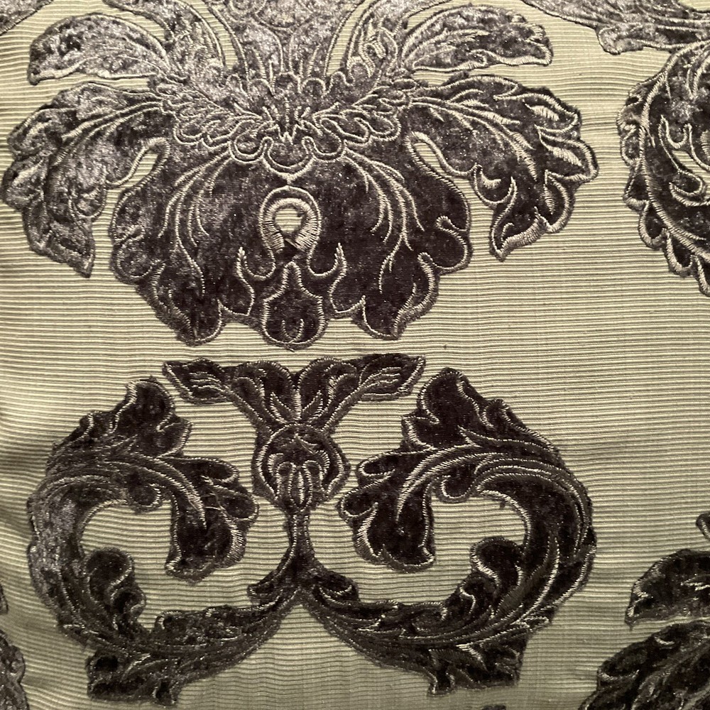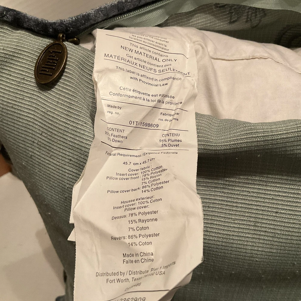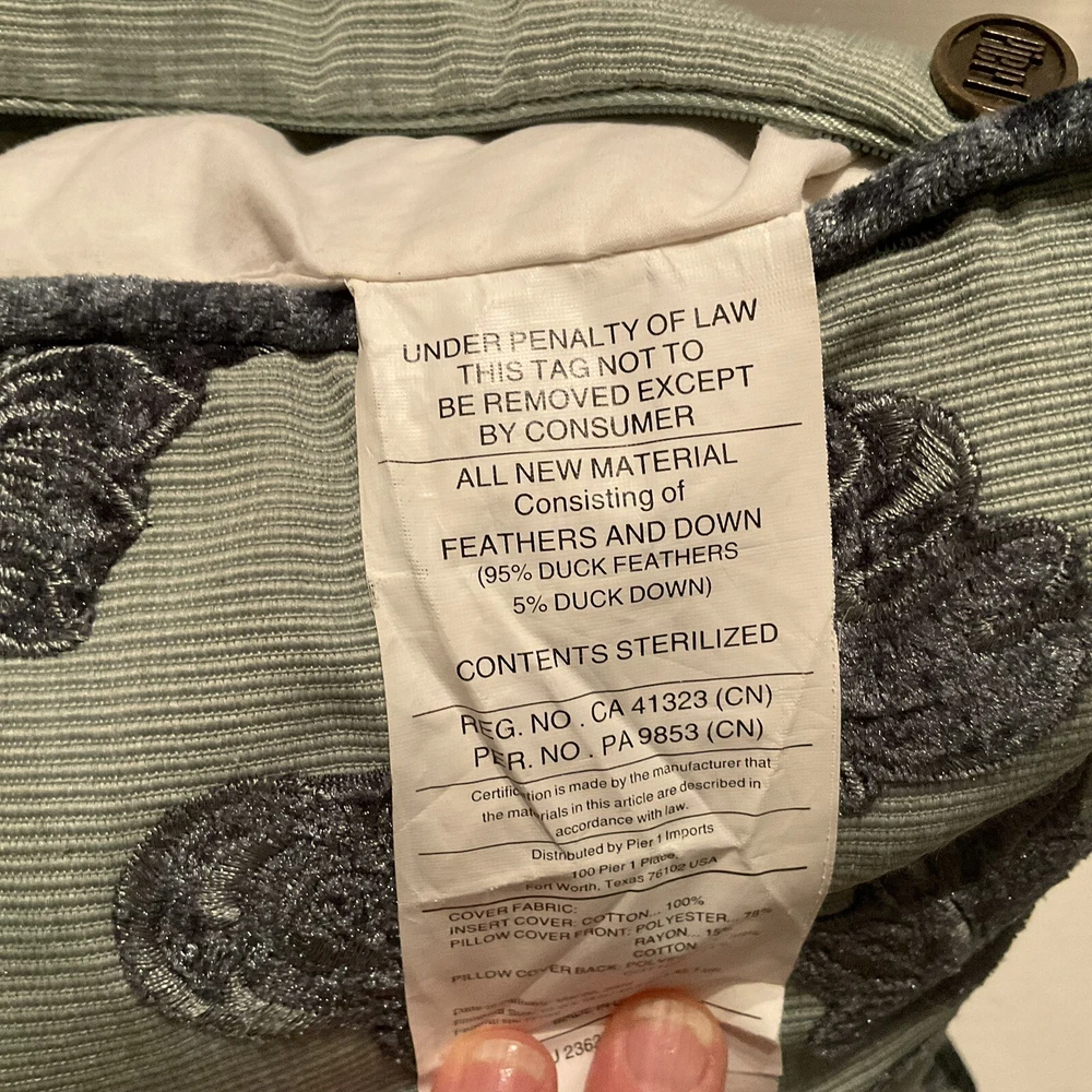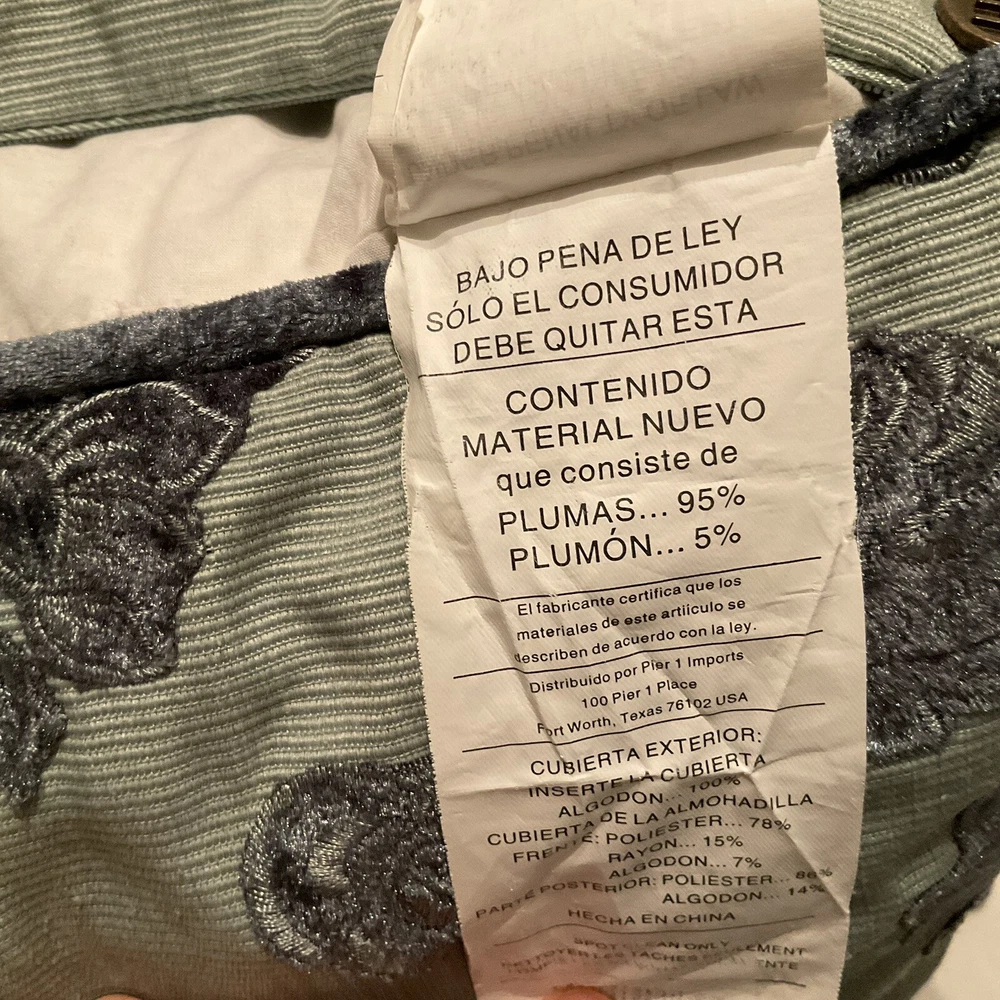 This Pier 1 Imports throw pillow features a vibrant blue and green floral design in a luxurious brocade material. Measuring 18 x 18 inches, it is filled with a mix of down and feathers for a comfortable feel. The pillow is adorned with a beautiful floral pattern, making it a stylish decorative piece for the living room, bedroom, or guestroom. The pillow is designed with a zip closure for easy maintenance and is made in China by Pier 1 Imports. Outer pillow casing has been cleaned.