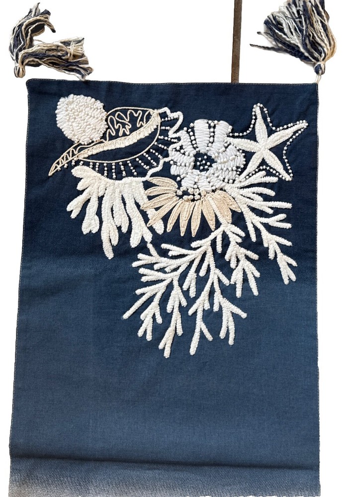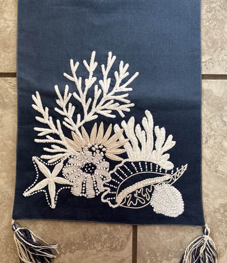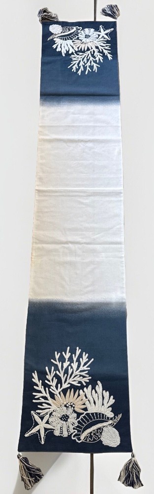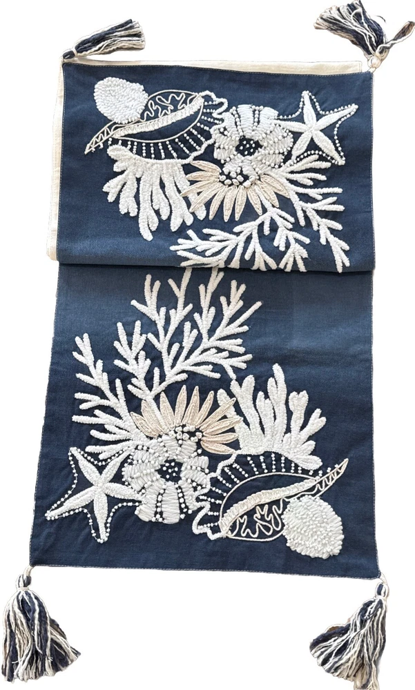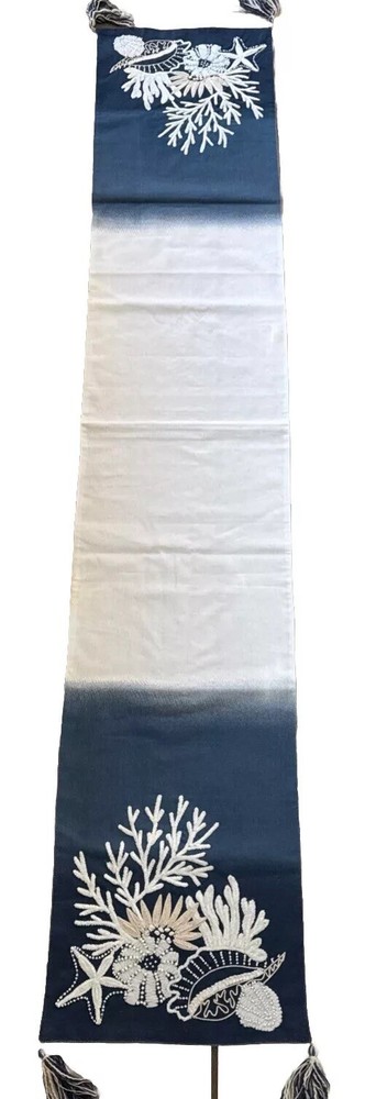 Pier 1 Imports Blue White Table Runner Sea Shell Nautical Beaded 71x13 In Beautiful In nice condition