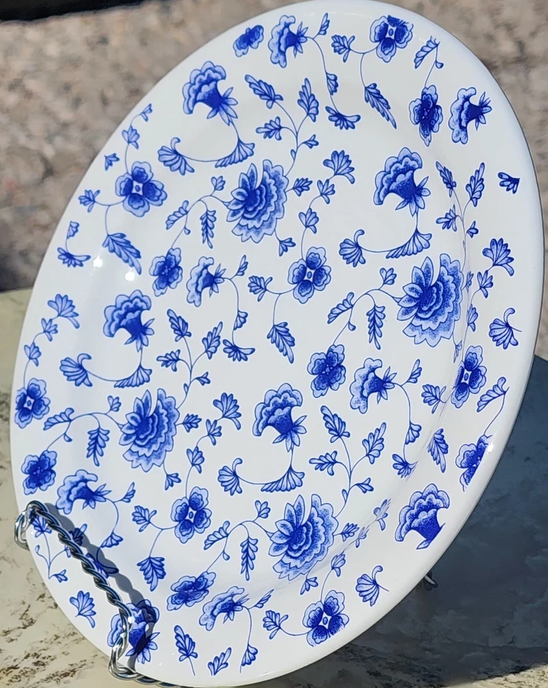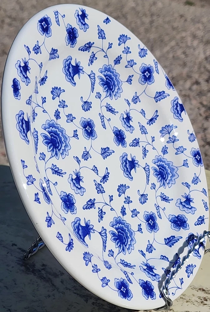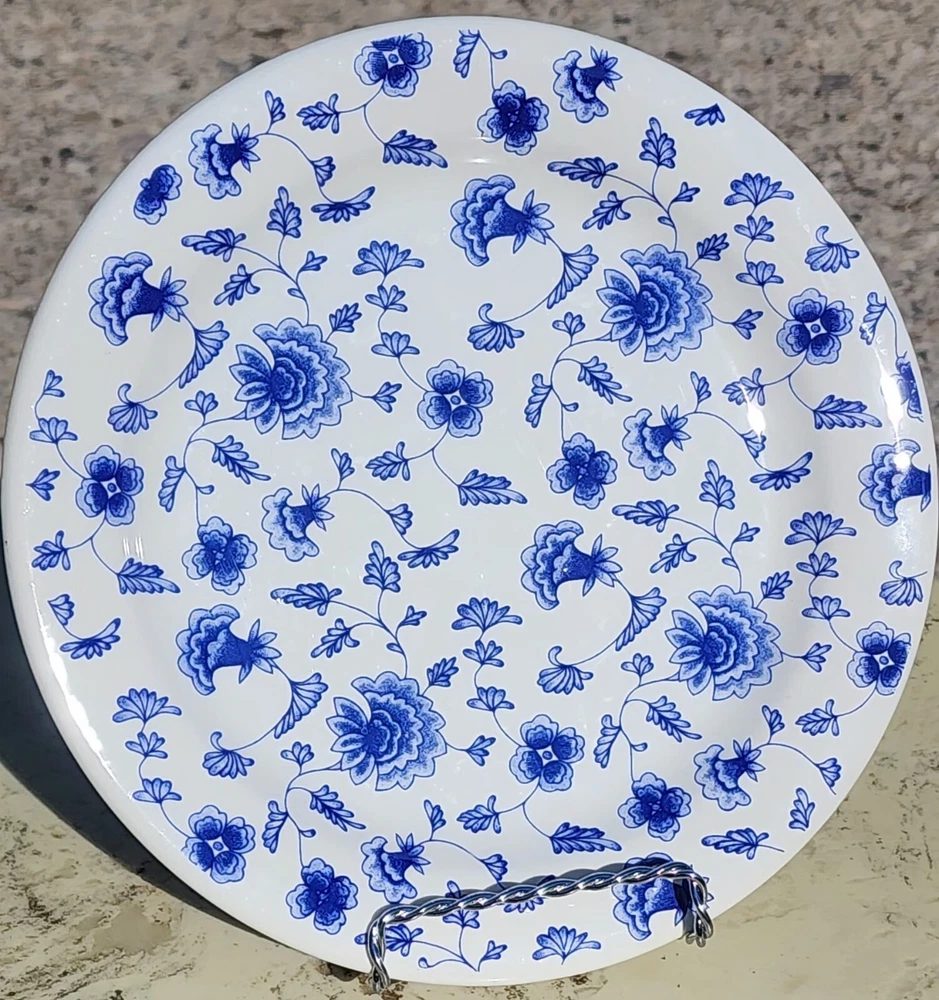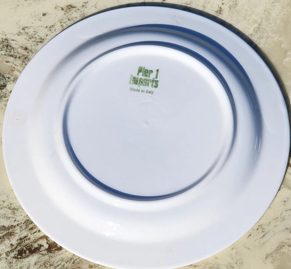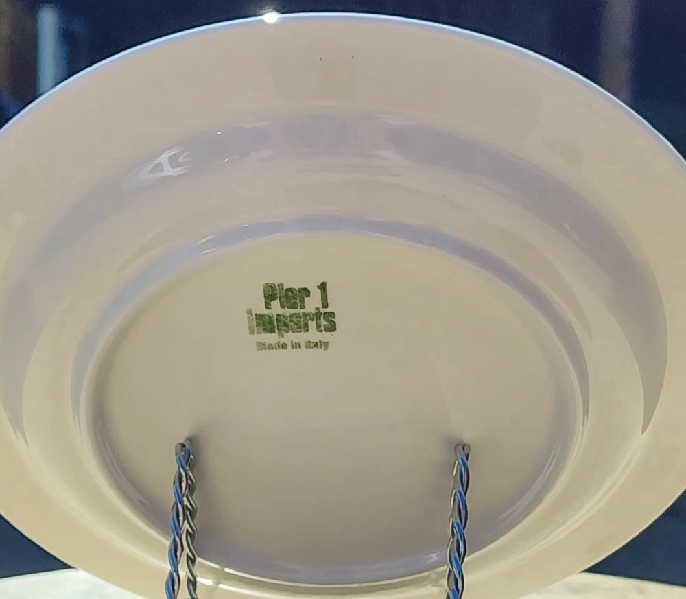 Add a touch of elegance to your dining table with this beautiful Pier 1 Imports salad plate. The plate features a stunning blue and white floral pattern that is perfect for any occasion. Crafted from high-quality stoneware and ceramic, this round plate has a diameter of 7.75 inches and is designed to hold your favorite salad. This vintage plate is an original and comes with a printed backstamp. The brand, Pier 1 Imports, is known for its high-quality home decor products. The plate is perfect for all occasions, whether you are hosting a formal dinner party or a casual get-together with friends and family. Add this beautiful flower-themed plate to your collection today! These are like new condition, no chips or cracks, and they are $12.99 each. Thanks for looking.