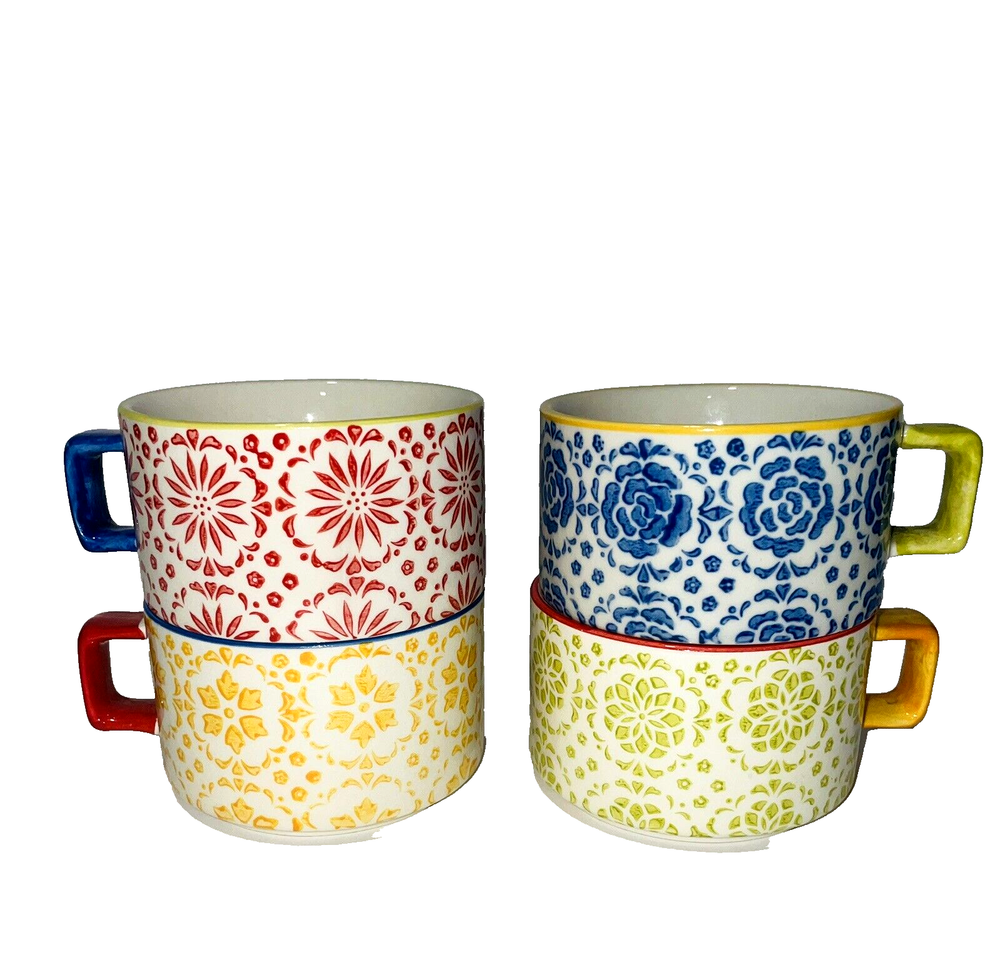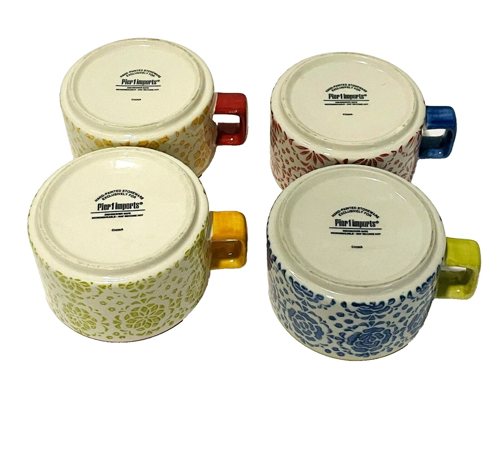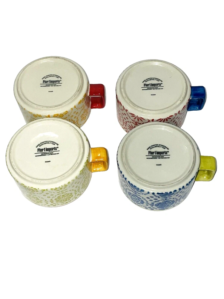 PIER ONE IMPORTS Stacking Coffee Tea Mugs Hand painted Stoneware N331 Set of 4 2" x 3.5" Discontinued Rare Find! Condition: Clean, Normal Light Wear, Small Tiny Chip On Yellow Handles Hardly Noticeabl...