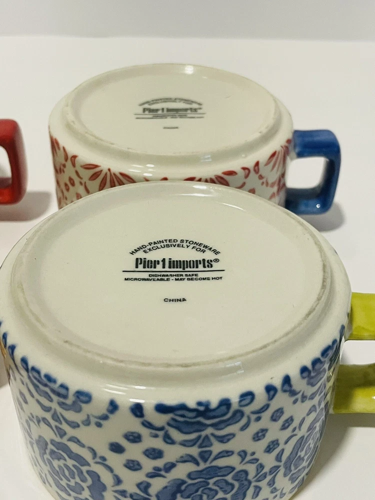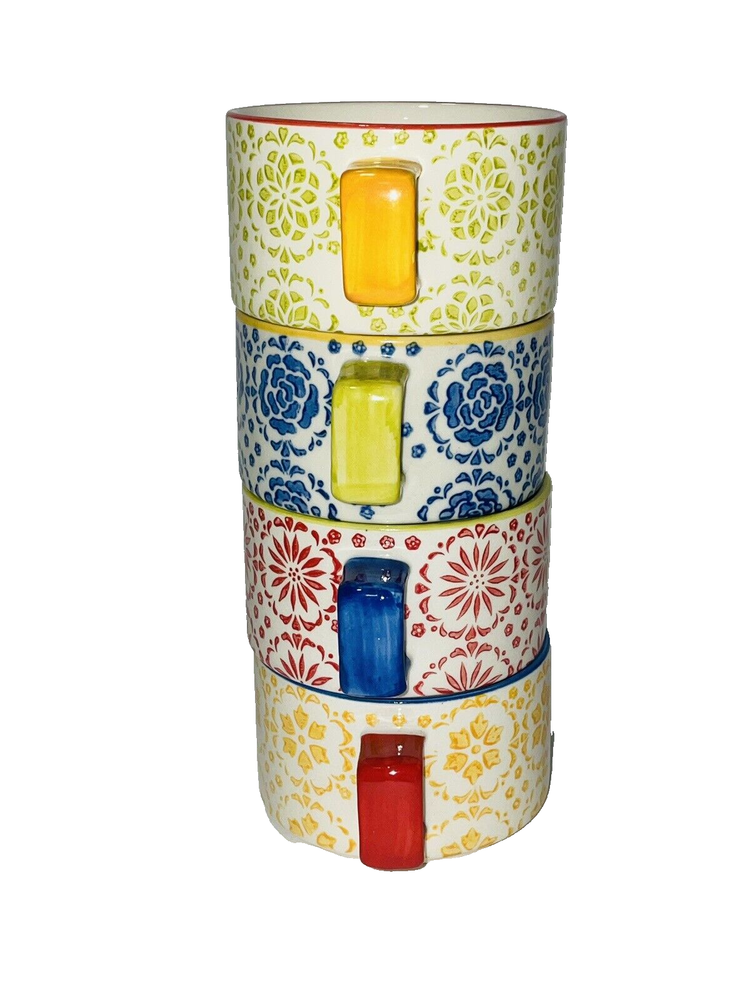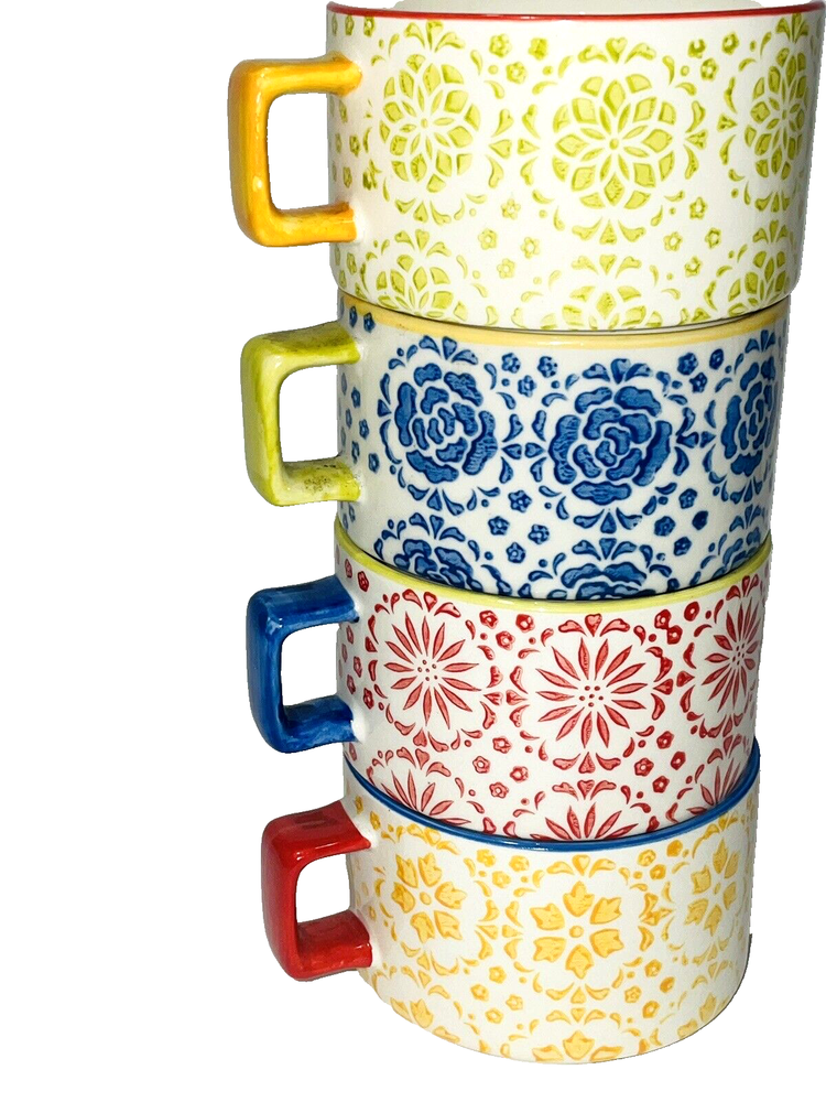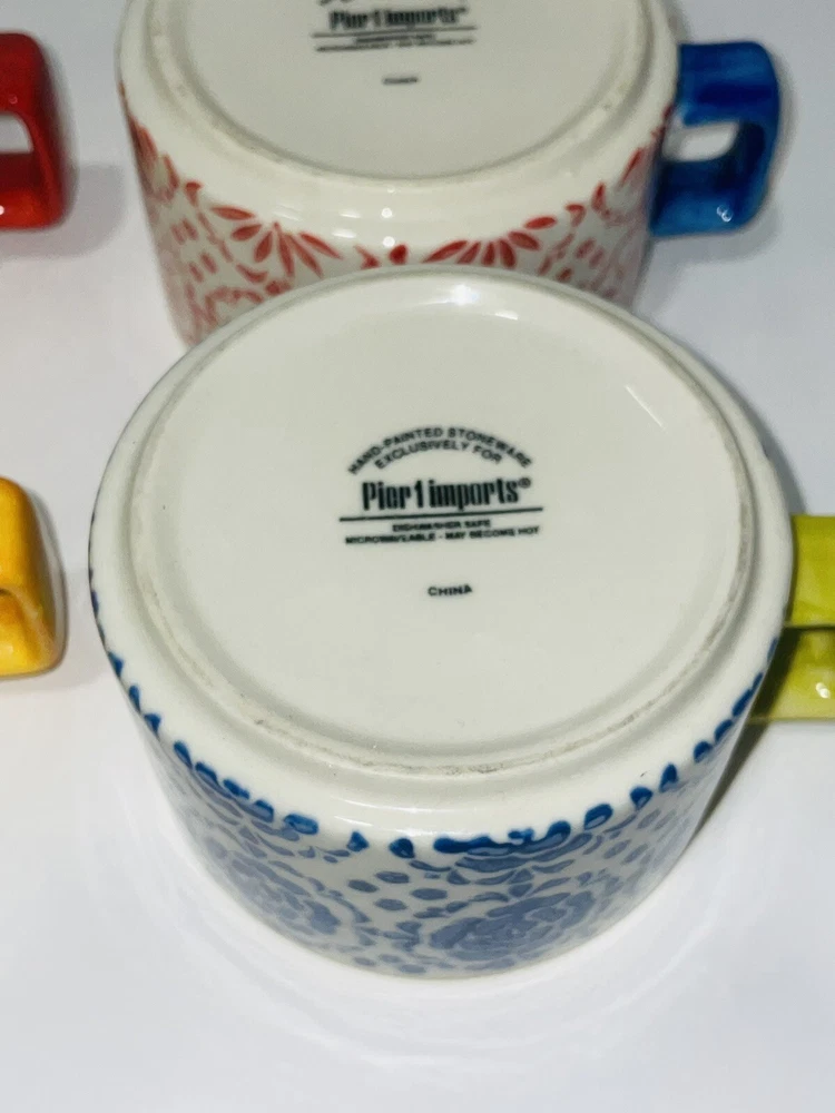PIER ONE IMPORTS Stacking Coffee Tea Mugs Hand painted Stoneware N331 Set of 4 2" x 3.5" Discontinued Rare Find! Condition: Clean, Normal Light Wear, Small Tiny Chip On Yellow Handles Hardly Noticeable