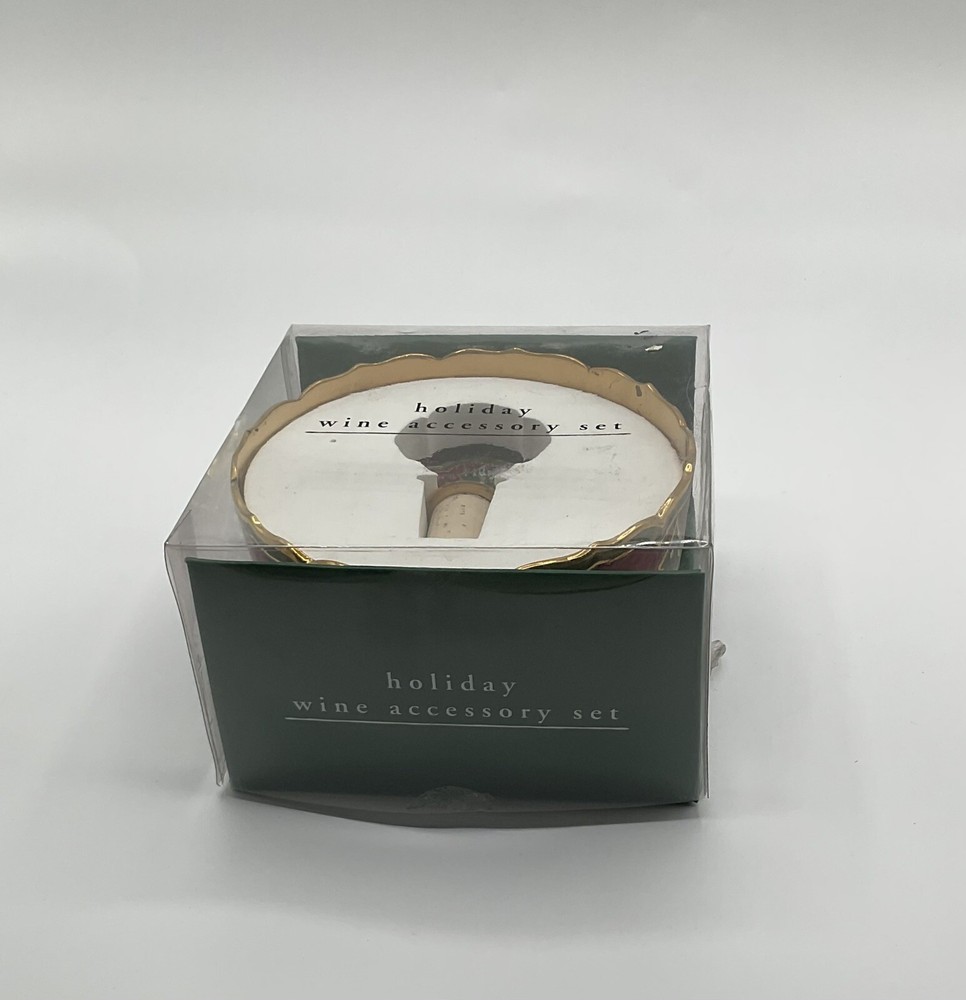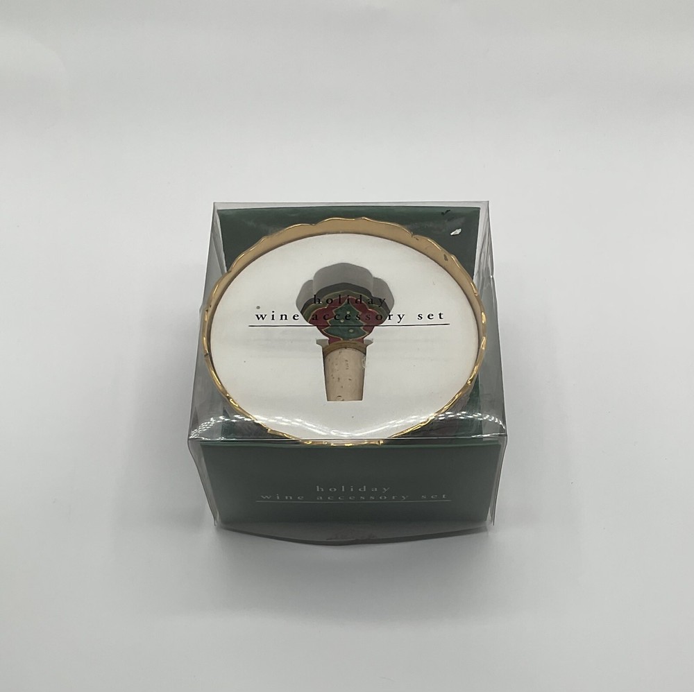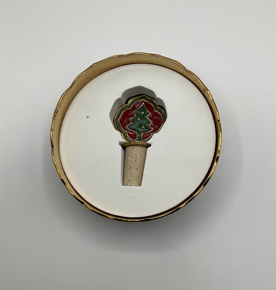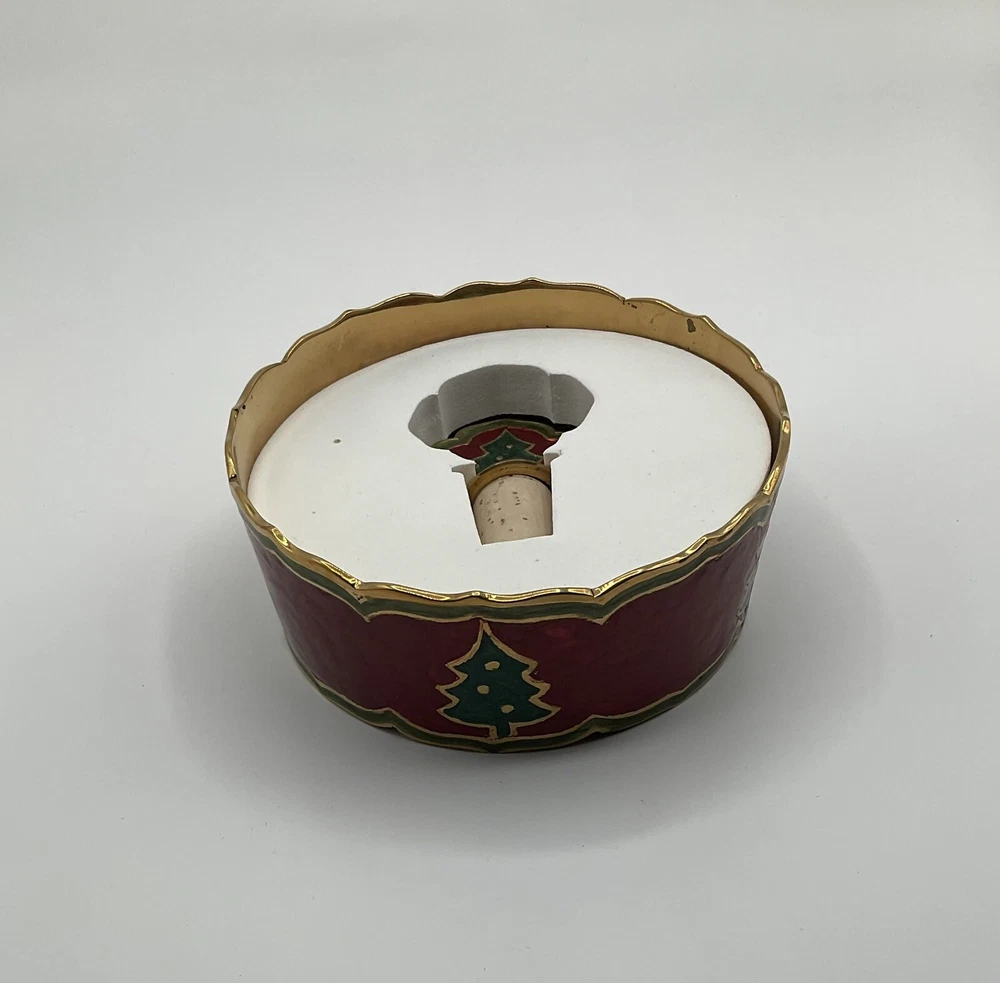 Pier 1 Imports holiday wine accessories with bottle holder and cork stopper, Christmas tree design, red, green and gold color.