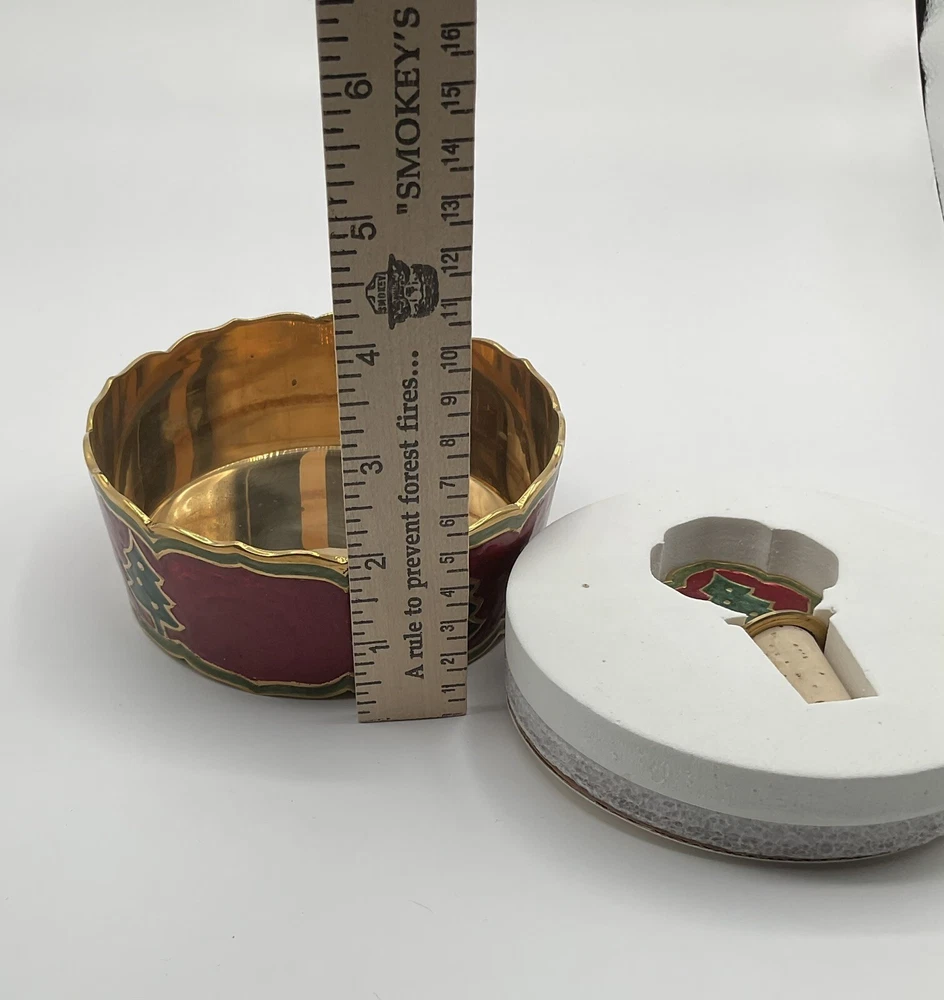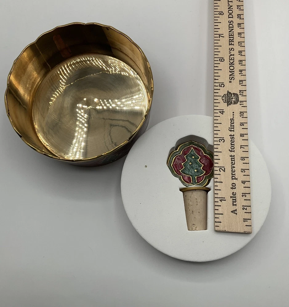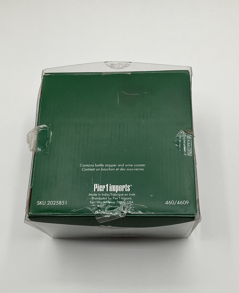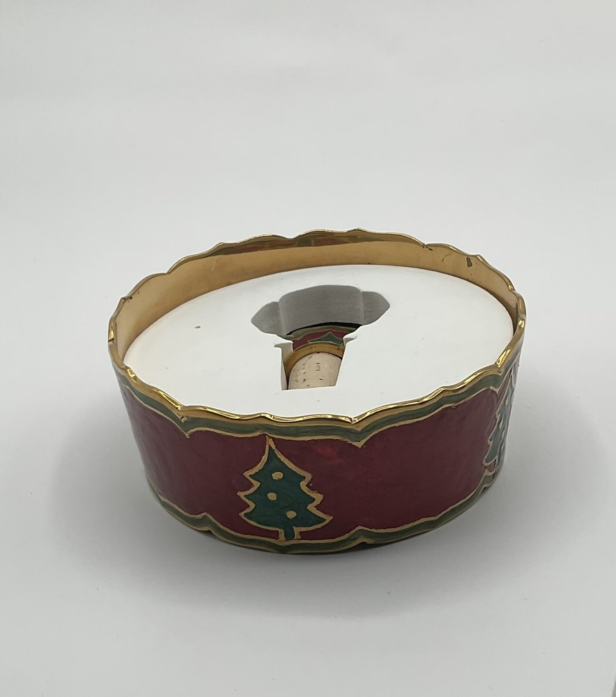 Pier 1 Imports holiday wine accessories with bottle holder and cork stopper, Christmas tree design, red, green and gold color.