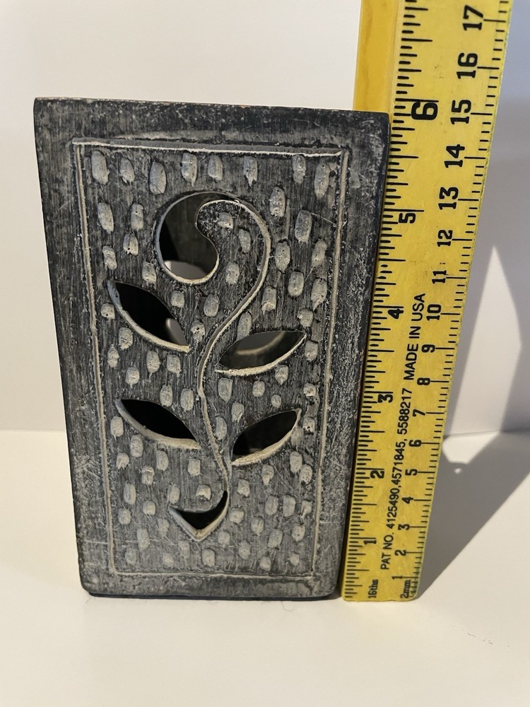 The Pier 1 Imports Candle & Plant Holder is a decorative piece with a gray leaf cut out design, perfect for adding a touch of nature to your home. Measuring 6" x 3" x 3", this rectangular candle holder is suitable for both candles and plants, making it a versatile and stylish addition to any room. The brand Pier 1 Imports ensures quality and craftsmanship, while the nature-themed design brings a calming and organic feel to your decor. The bottom has cloth for smooth sliding. Send me an offer I cannot refuse.