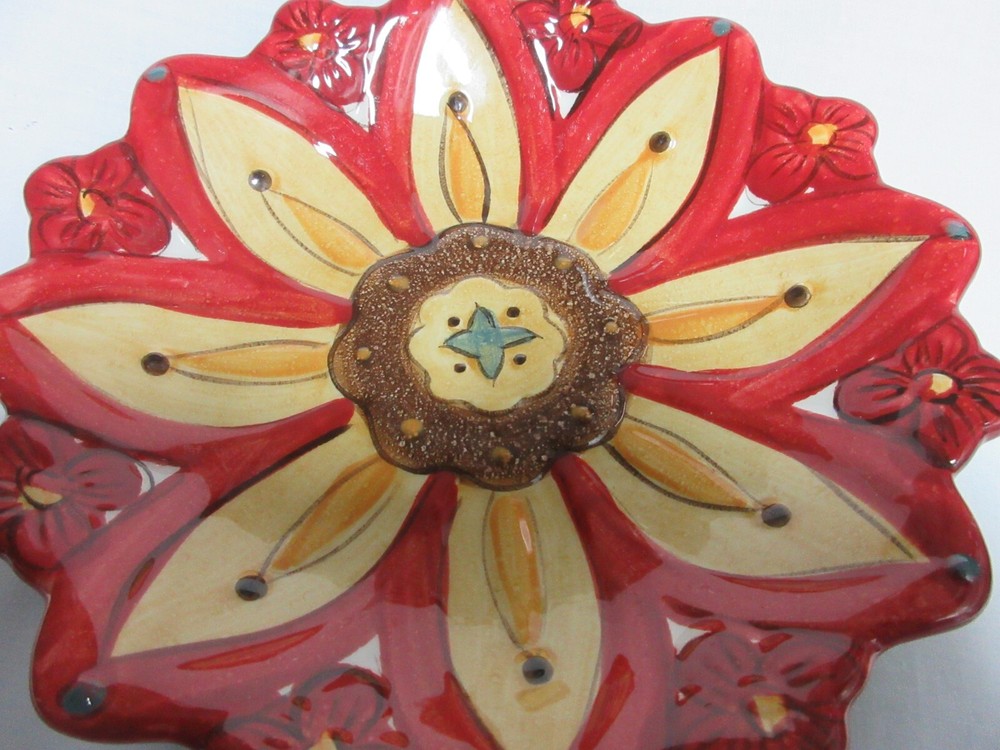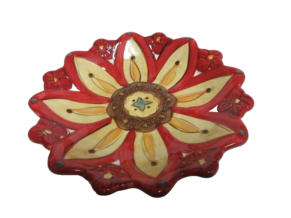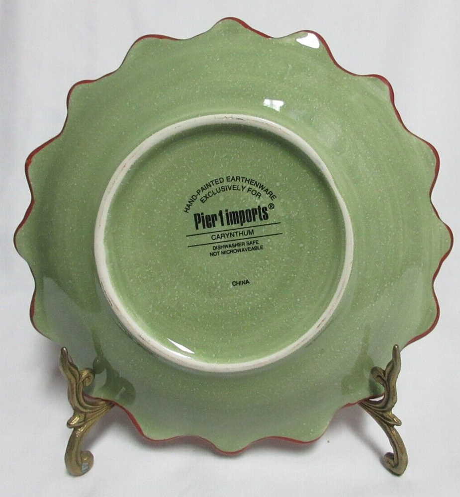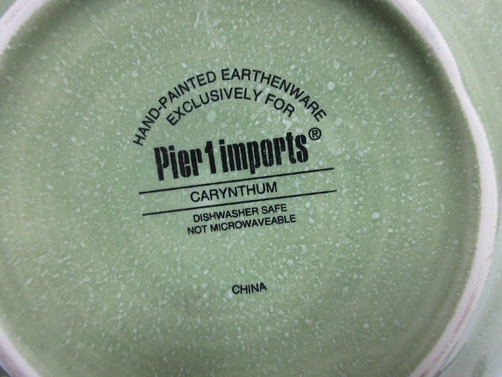 This Pier 1 Imports Carynthum 8" Flower Petal Shaped Salad Dessert Plates Replacement set includes two round stoneware plates with a floral pattern. They are microwave and dishwasher safe, hand-painted, and have a glossy finish. Each plate is 8 inches wide and features a contemporary design. Ideal for all occasions, these plates are part of the Carynthum collection and are made in China using pottery production techniques. y789