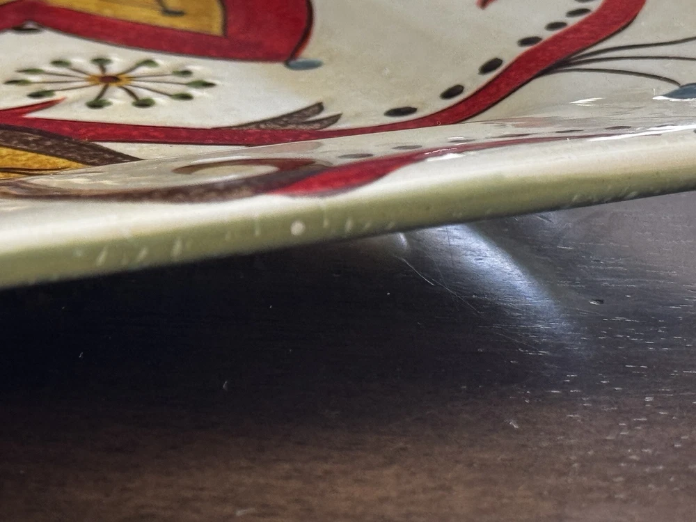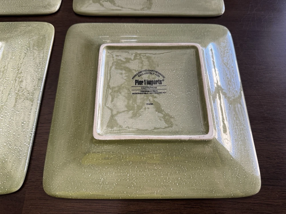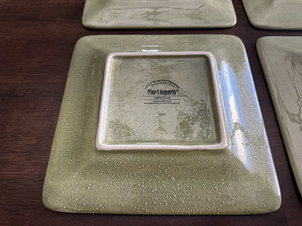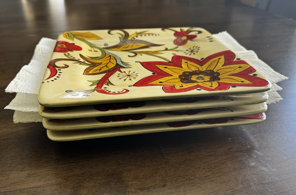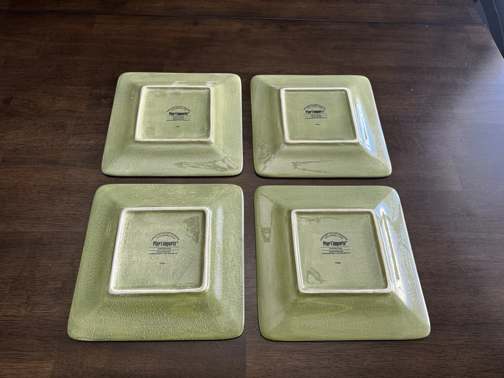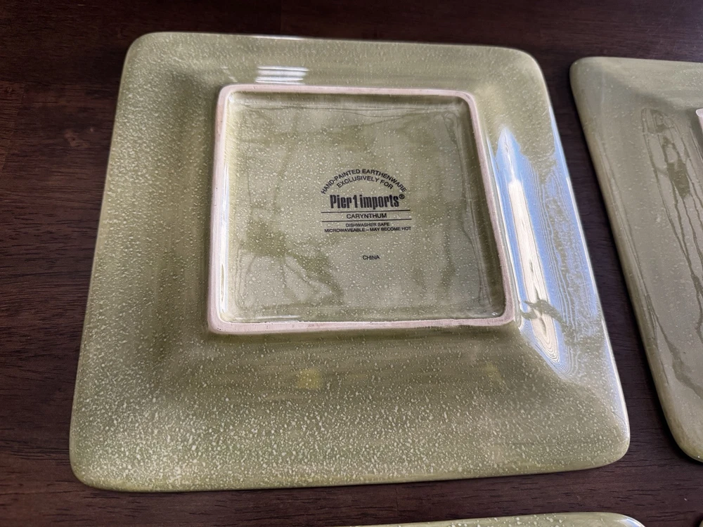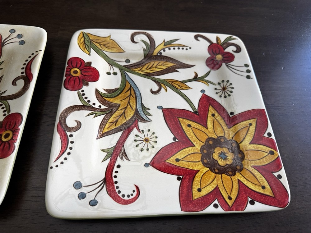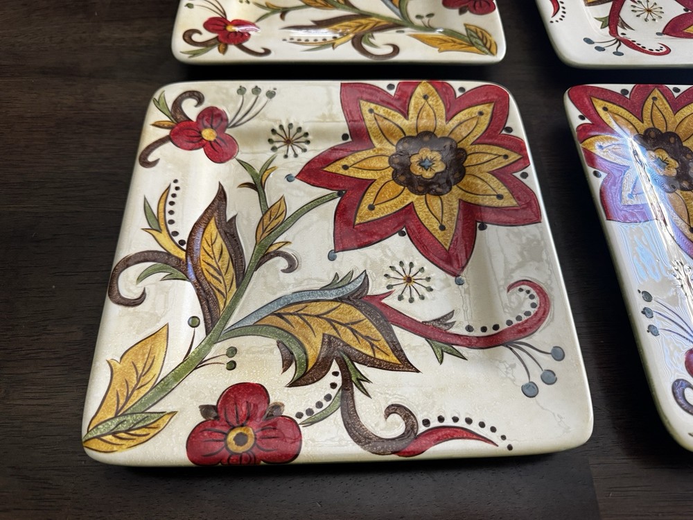 Pier 1 Imports Carynthum Floral Hand Painted Square Salad Plates 8 3/4” Set Of 4 Plates are in good, pre-owned condition One of the plates has two small pen sized nicks on the edge which can be seen in the photos Thank you for looking