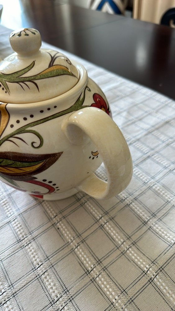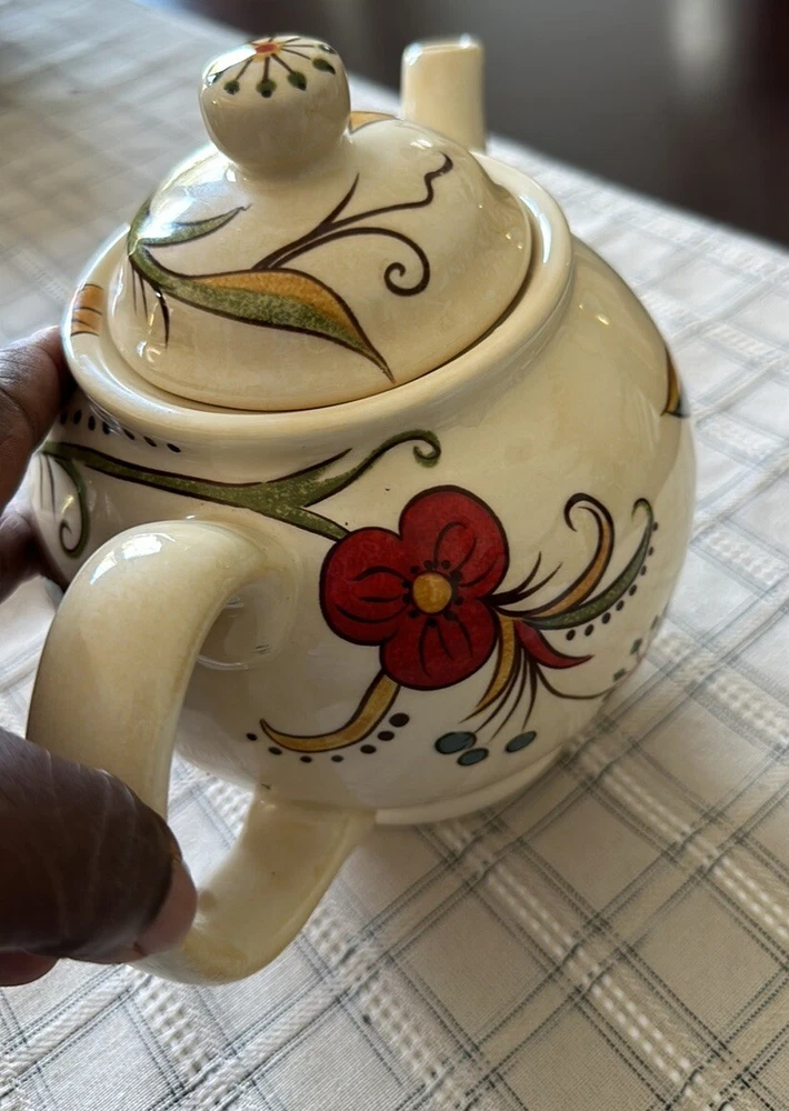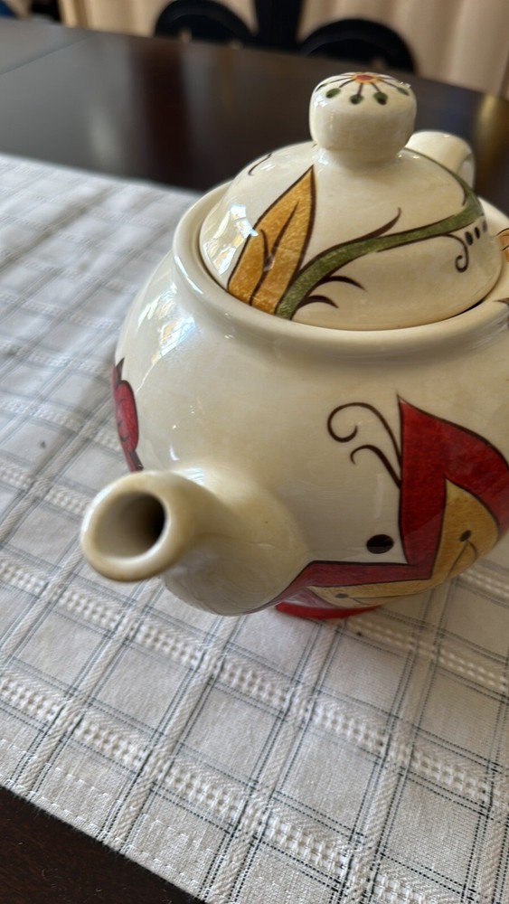 10.5”x7.5”Tx5”D Beautiful ceramic vibrant floral Teapot w/lid Ceramic Cream, red, gold, blue, green Would look great in a kitchen behind glass cabinet or on a shelf.