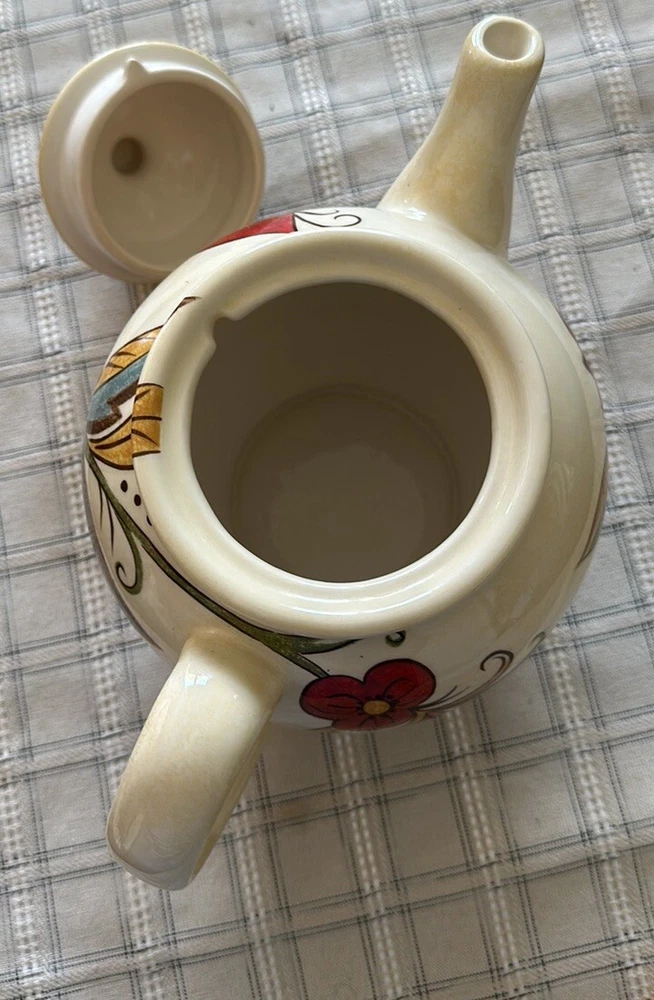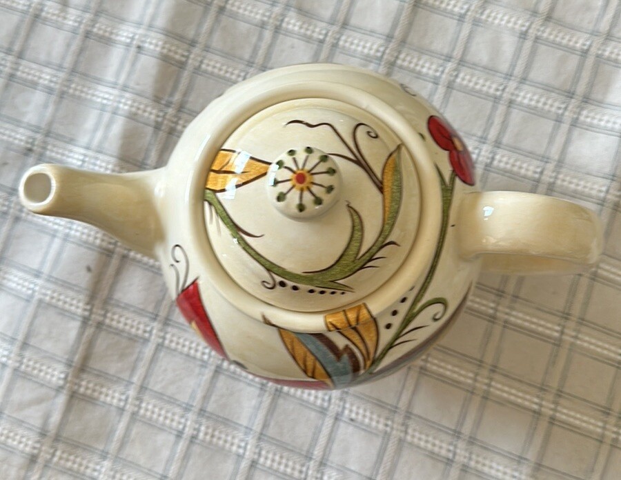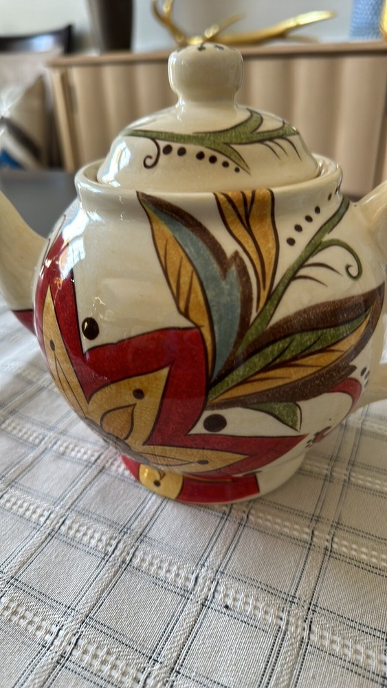 10.5”x7.5”Tx5”D Beautiful ceramic vibrant floral Teapot w/lid Ceramic Cream, red, gold, blue, green Would look great in a kitchen behind glass cabinet or on a shelf....