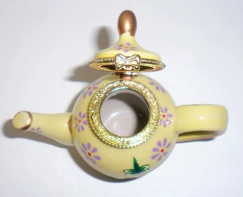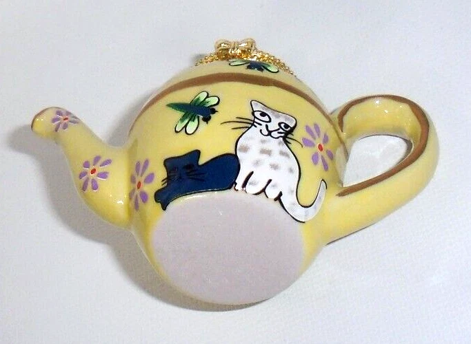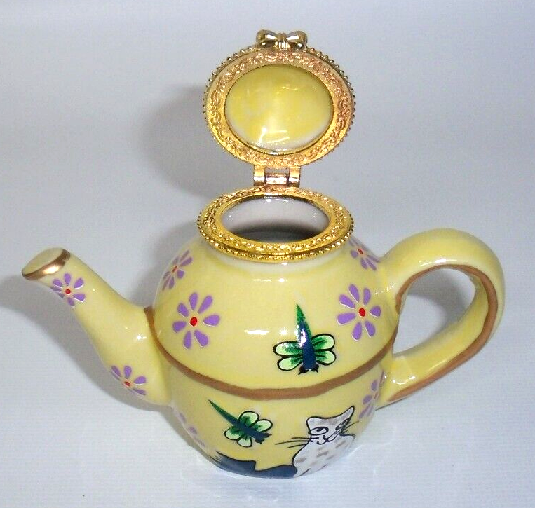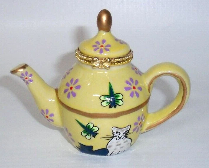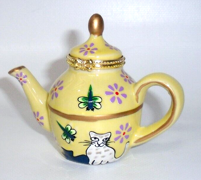 Pier 1 Imports Cats & Dragonflies Teapot Trinket Box Yellow Blue Green Gold, New! Never used. Perfect in every way.