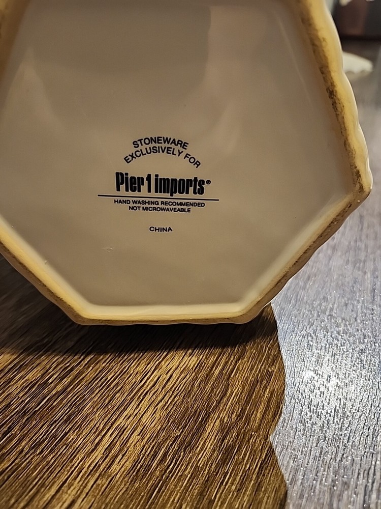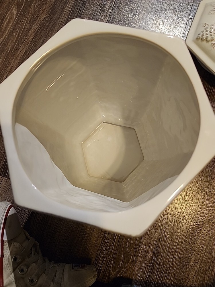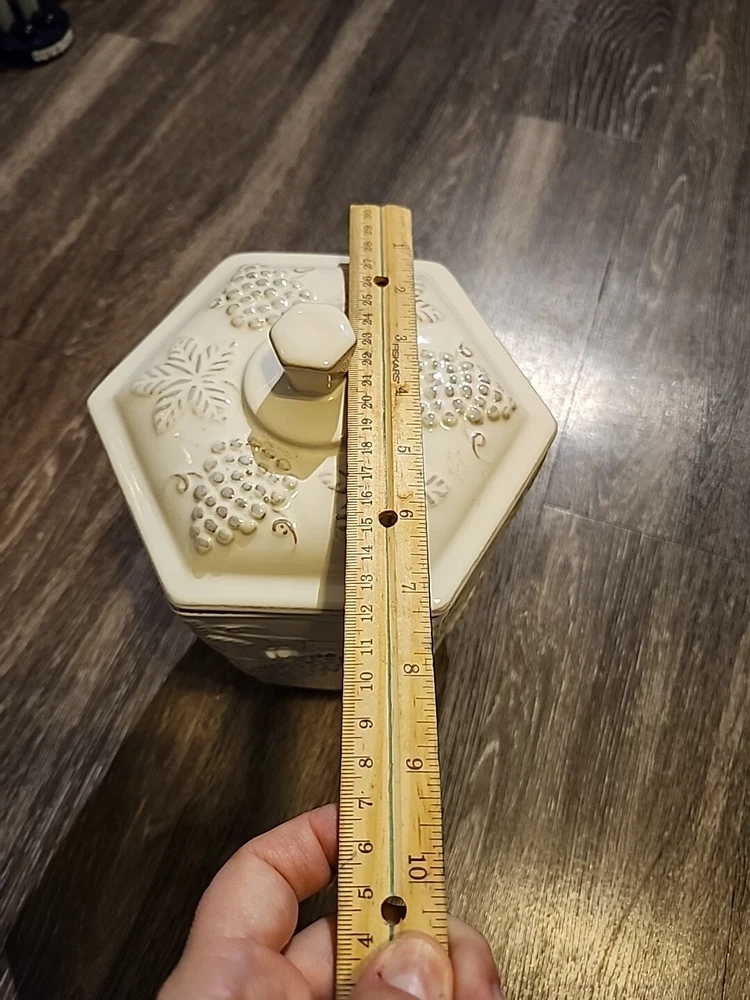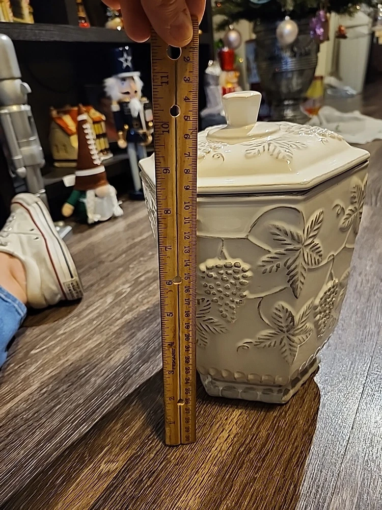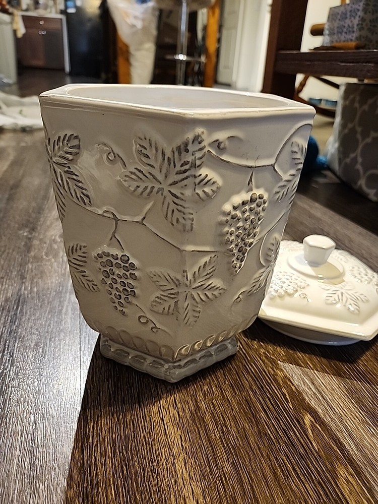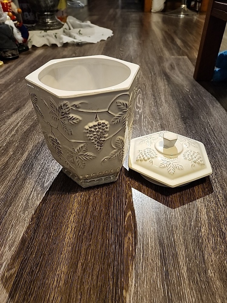 This Pier 1 Imports Ceramic Cookie Jar features a grapevine design in a large size, measuring 10.5 inches in both length and height. The jar is made of ceramic & porcelain, with a twist-off lid for easy access to the single compartment inside. The white color and Art Deco style add a touch of elegance to any kitchen or home decor. This original Cookie Jar by Pier 1 Imports is a charming addition for storing your favorite treats or serving as a decorative piece in your home.
