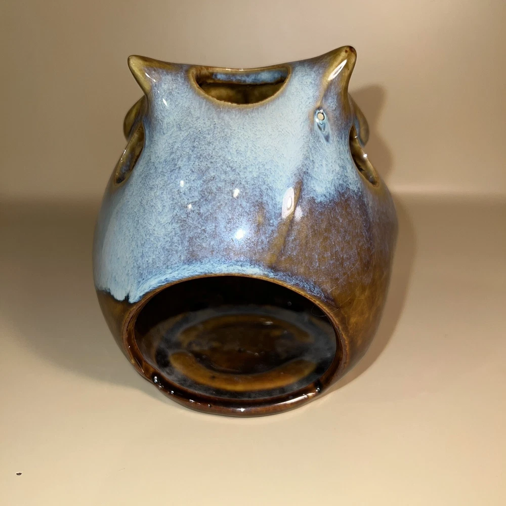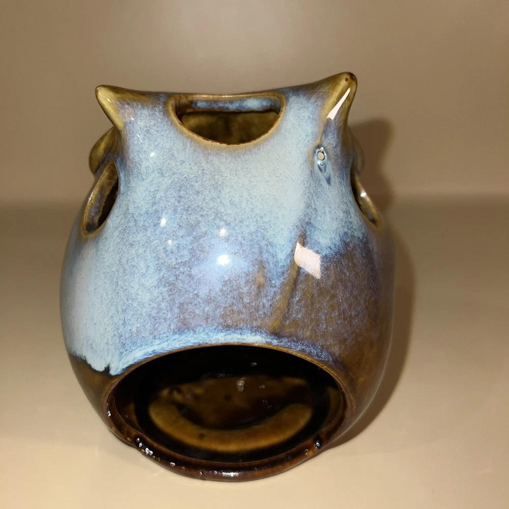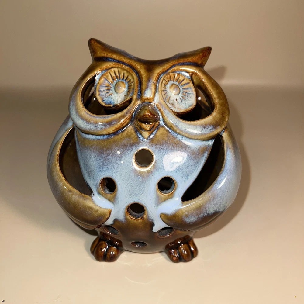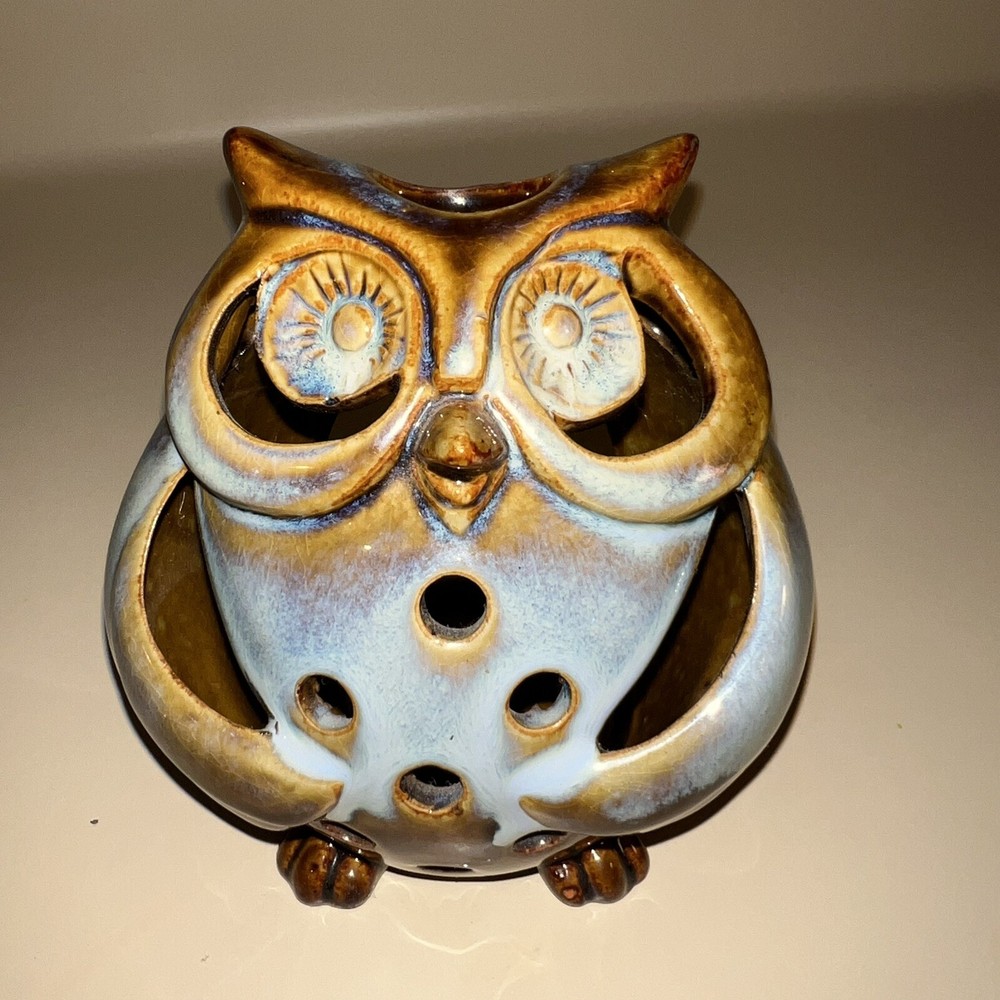 This Pier 1 Imports ceramic owl candle holder is the perfect addition to any room. With its rustic, bohemian style, it is suitable for all occasions and suitable for holding mini candles or being placed on window sills or furniture. The blue pottery and high gloss finish give it a unique, glazed look that adds a 3D effect. Its size is medium, measuring 5 inches in height, and it is made of high-quality ceramic. This candle holder is perfect for those who love animals and dinosaurs, fantasy and periods/styles, and wildlife. It features a beautiful, mystical owl design that is perfect for adding a touch of magic to any space. All Pier 1 items are discontinued - if you are an owl collector, pottery lover or cottagecore, boho style fan, then you will adore this owl in your home. Small glaze inclusion on back of owl, behind ear. Clearly photographed.