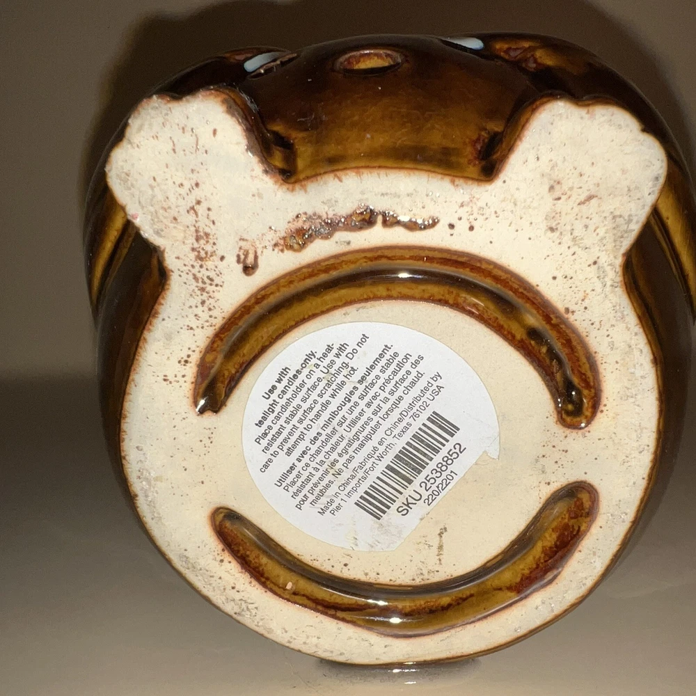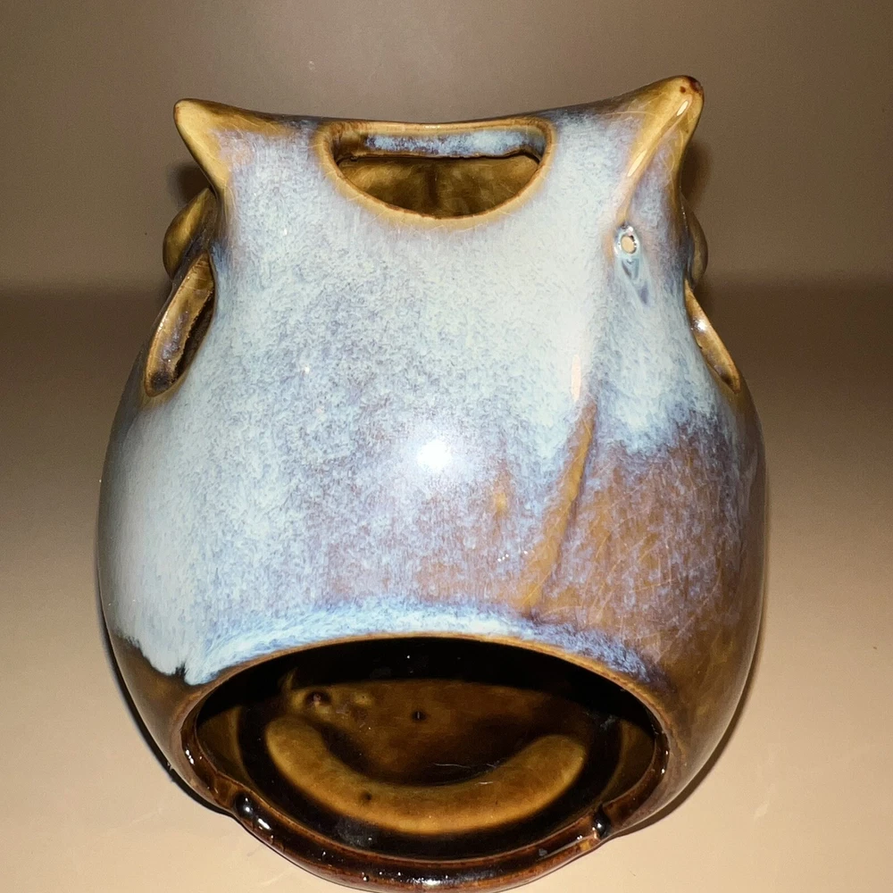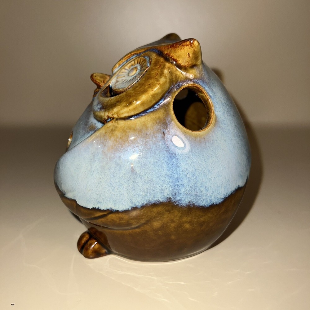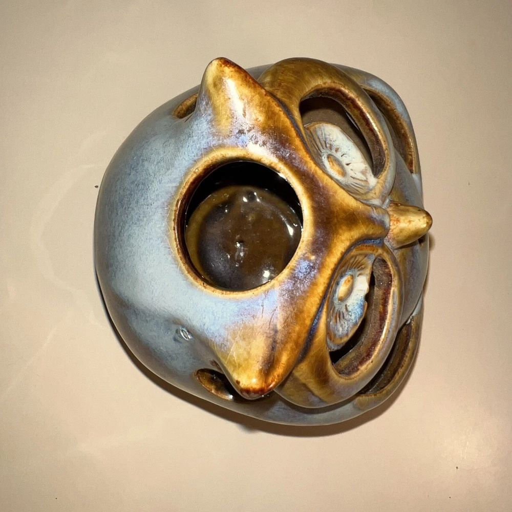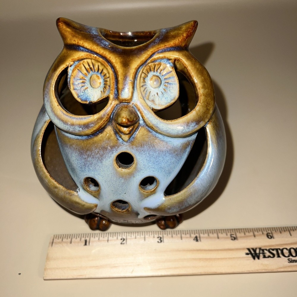 This Pier 1 Imports ceramic owl candle holder is the perfect addition to any room. With its rustic, bohemian style, it is suitable for all occasions and suitable for holding mini candles or being placed on window sills or furniture. The blue pottery and high gloss finish give it a unique, glazed look that adds a 3D effect. Its size is medium, measuring 5 inches in height, and it is made of high-quality ceramic. This candle holder is perfect for those who love animals and dinosaurs, fantasy and periods/styles, and wildlife. It features a beautiful, mystical owl design that is perfect for adding a touch of magic to any space. All Pier 1 items are discontinued - if you are an owl collector, pottery lover or cottagecore, boho style fan, then you will adore this owl in your home. Small glaze inclusion on back of owl, behind ear. Clearly photographed.