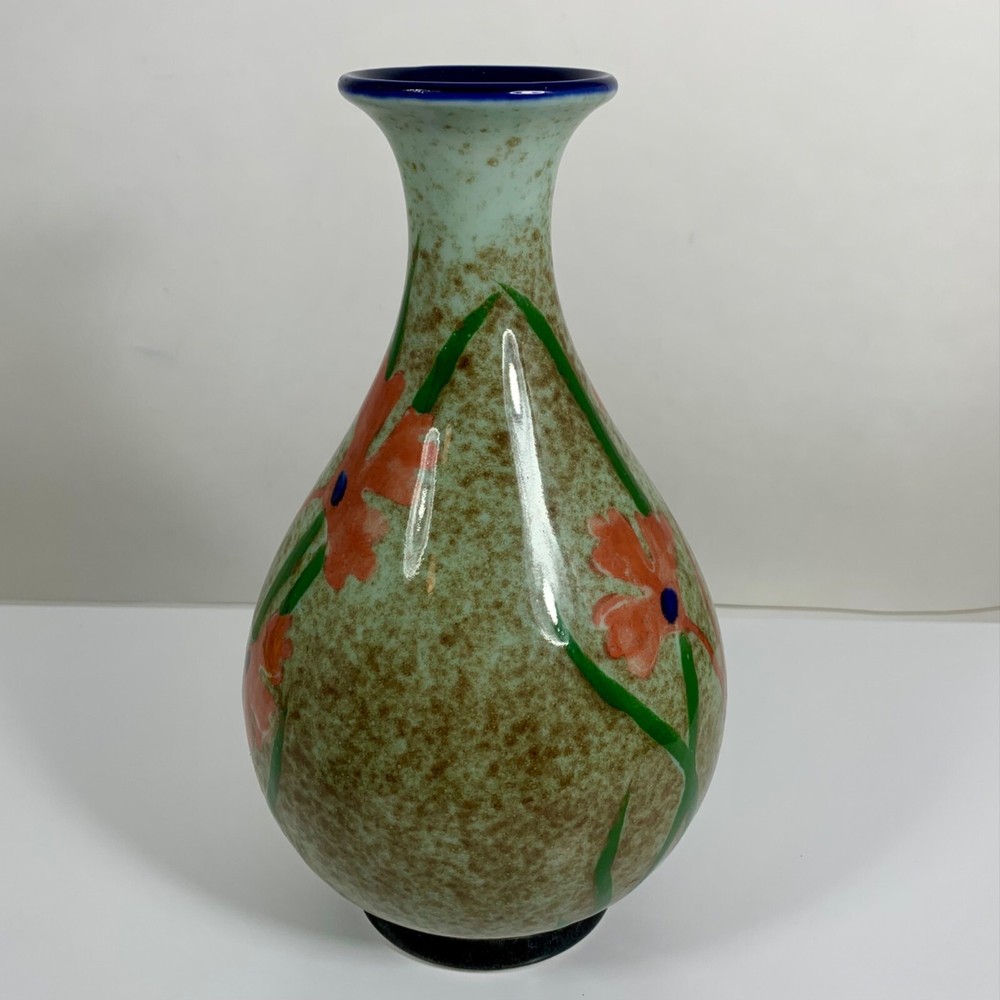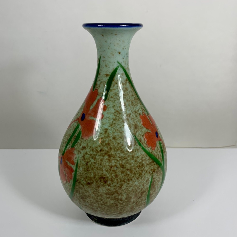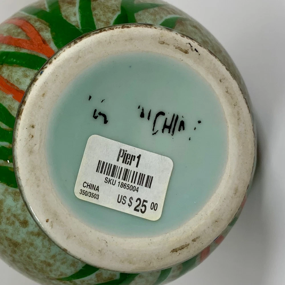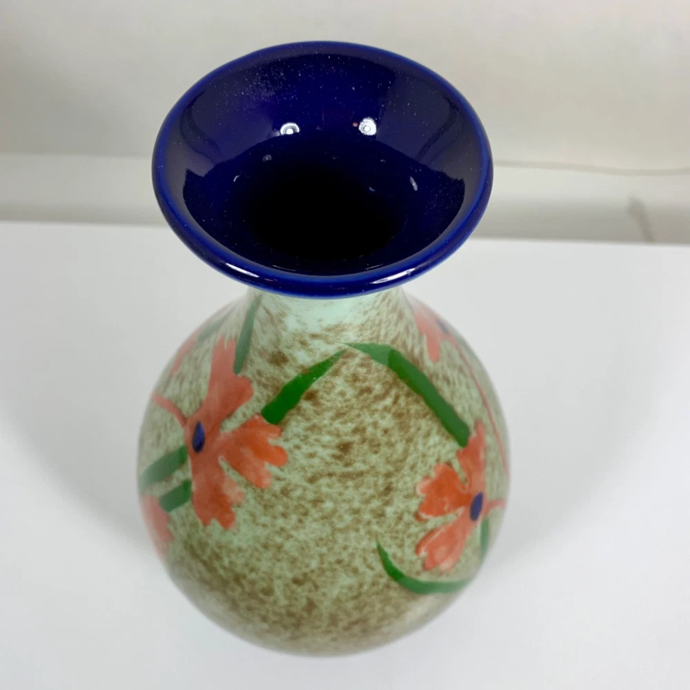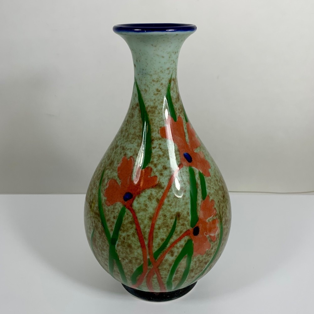 This vintage Pier 1 ceramic vase showcases a hand-painted design of bright poppies. Ideal for adding a touch of elegance to your home decor. The vase's unique color palette and craftsmanship reflect its timeless appeal, making it a sophisticated accent piece. Height: 10.25" Bottom Diameter: 2.75" • Hand-painted floral design • Elegant teardrop shape • Blue rim accent • Textured ceramic finish No visible flaws. Features: • Decorative Condition: Pre-Owned Good