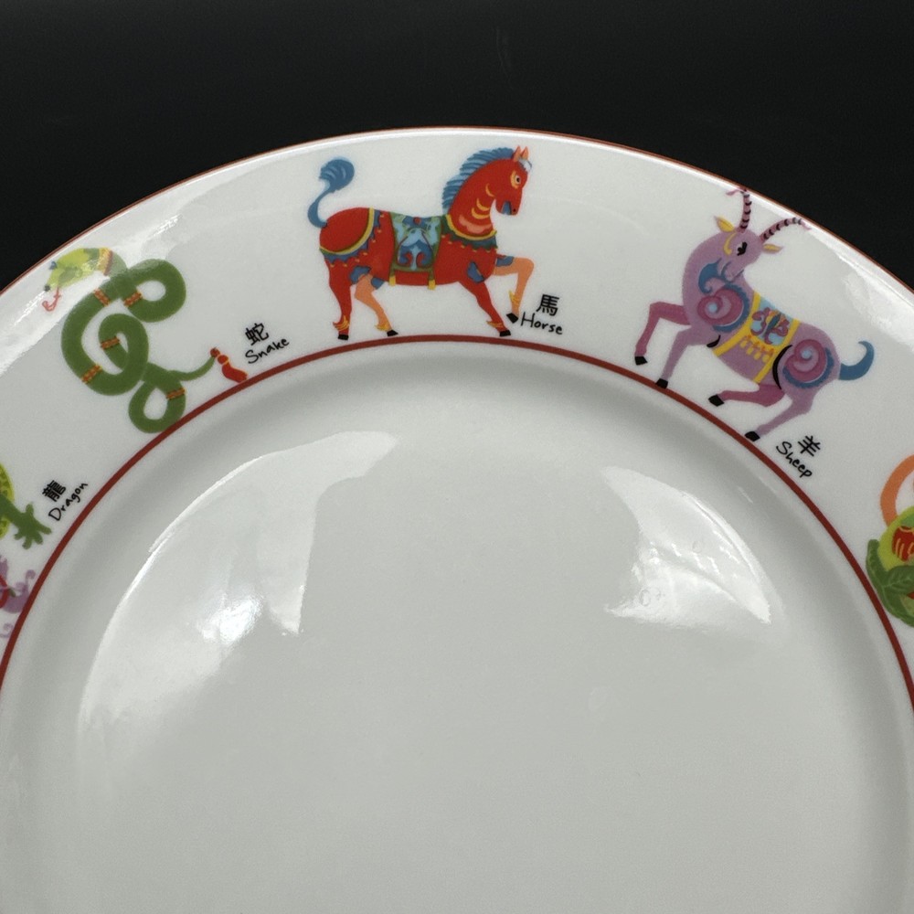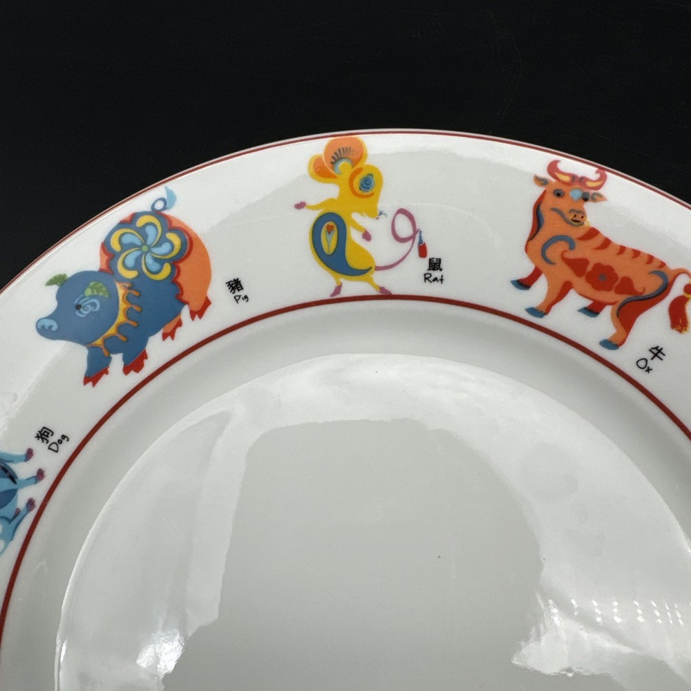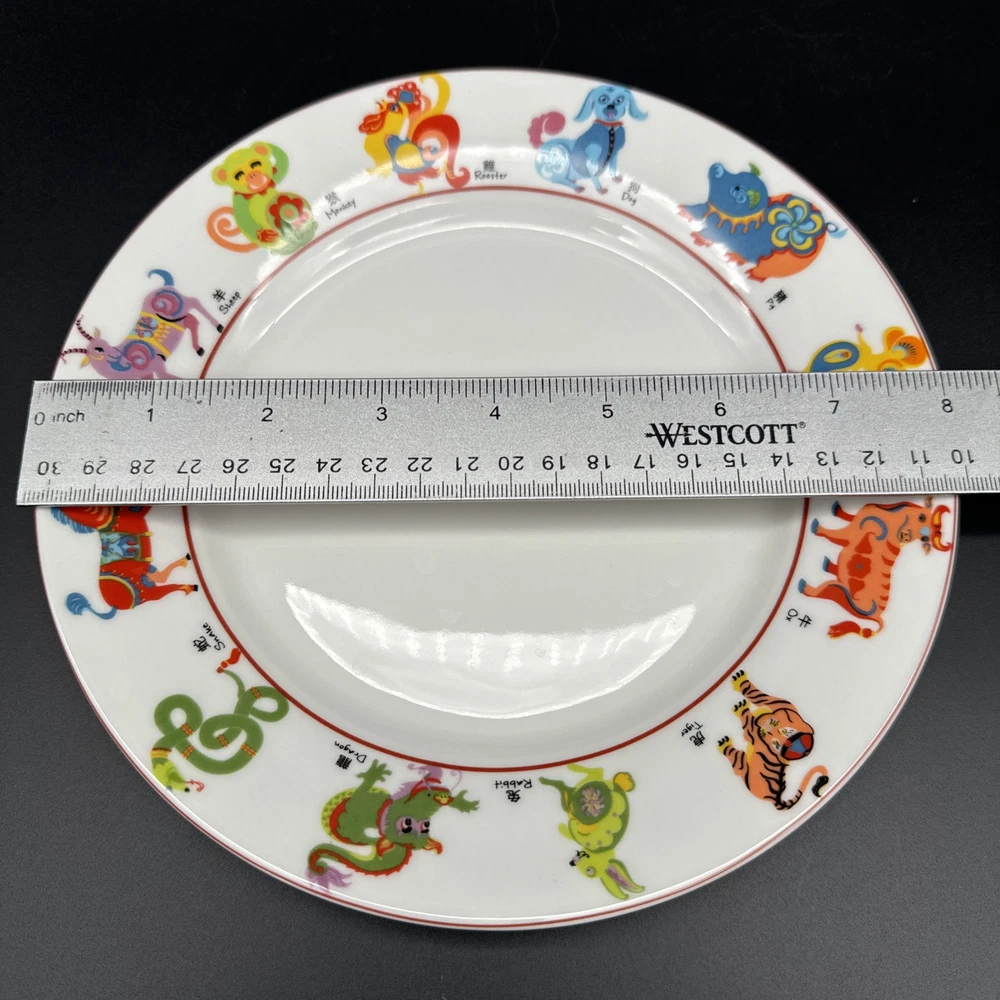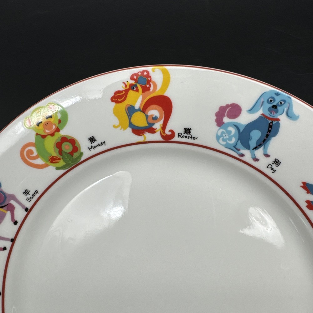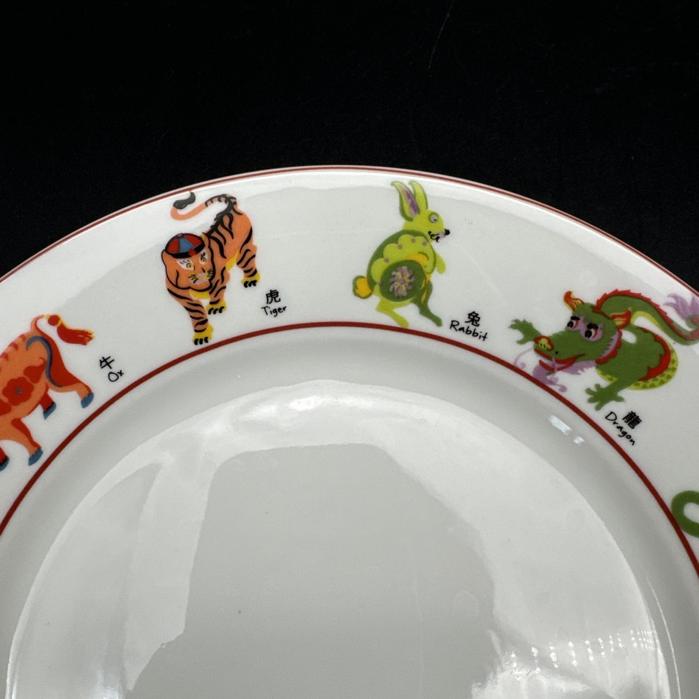 This Pier 1 Imports dessert plate features a multicolor design with Chinese Zodiac animals around the rim, including the Tiger. Made of ceramic, it is dishwasher and microwave safe. The plate has a round shape with a red trim and measures 8 inches in diameter. It is part of a set that includes salad and dessert plates, and was manufactured in 2009 in China.