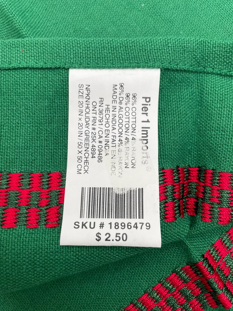 Pier 1 Imports Christmas Napkins Green with Red Trim 20" x 20" Set of 12 NOS Condition: New without tags, never used, excellent condition (please see all photos) Set of 12 Measures 20 inch x 20 inch Items come from a smoke free environment FAST SHIPPING!