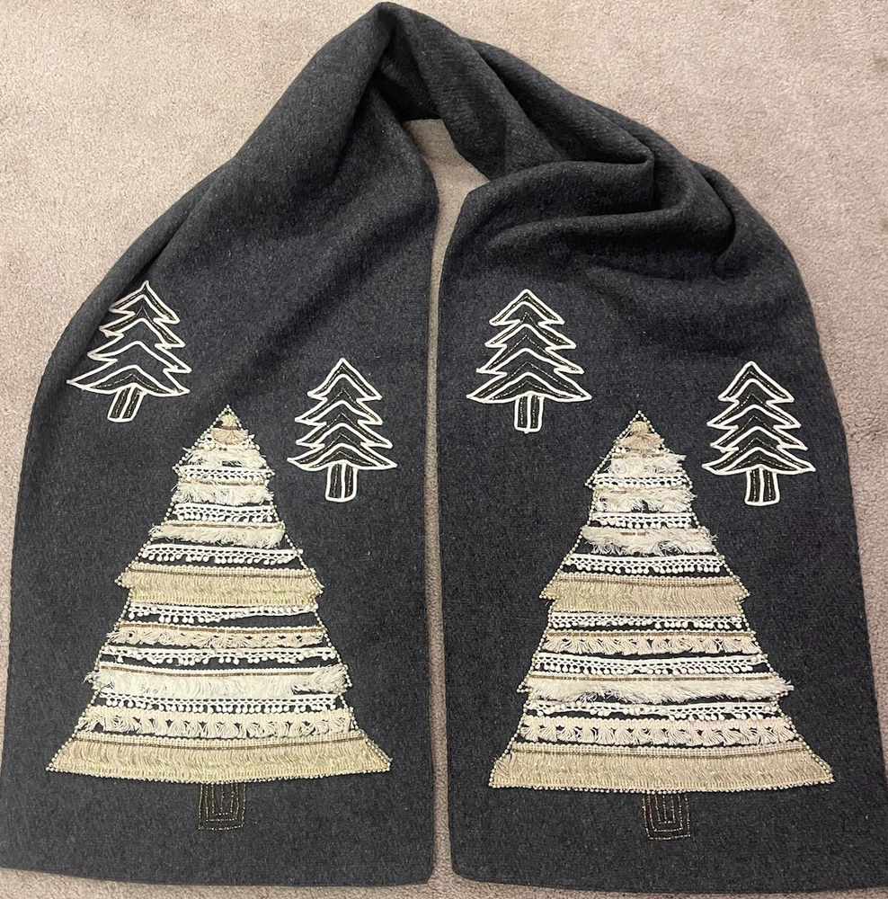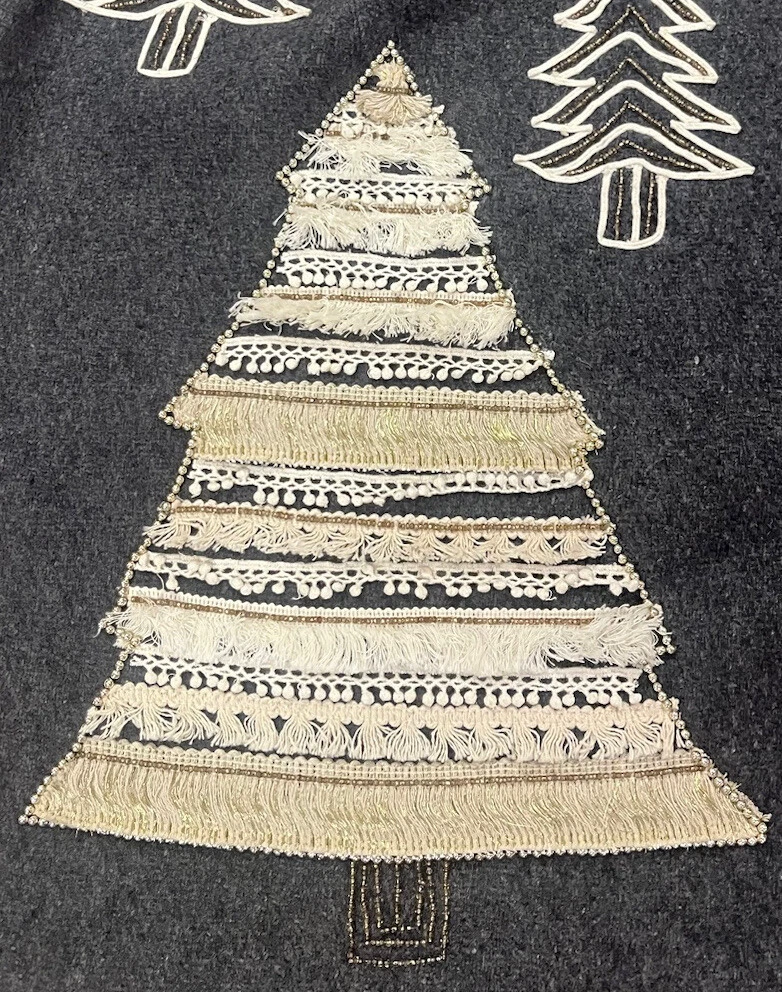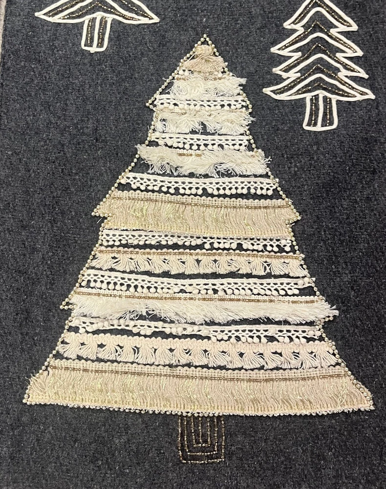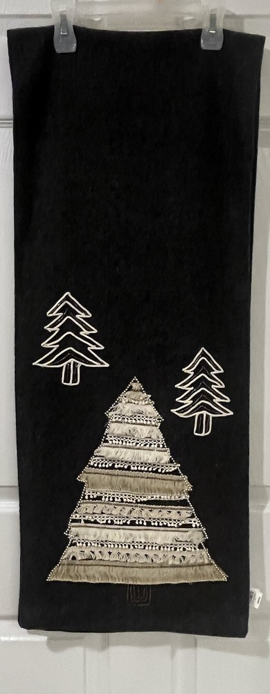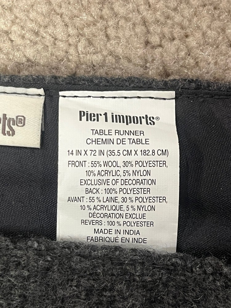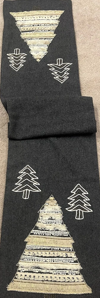 This festive table runner instantly elevates holiday decor with its cozy pine tree design in elegant gray and cream tones. The generous 73" length drapes beautifully across tables, while the wool-blend fabric adds warmth and durability. Easy to spot clean and versatile enough for Christmas or winter gatherings, it brings rustic charm without being overly seasonal. The neutral colors pair well with any tableware, making it a timeless piece you'll reach for year after year. Perfect condition with no odors—just pure holiday magic!