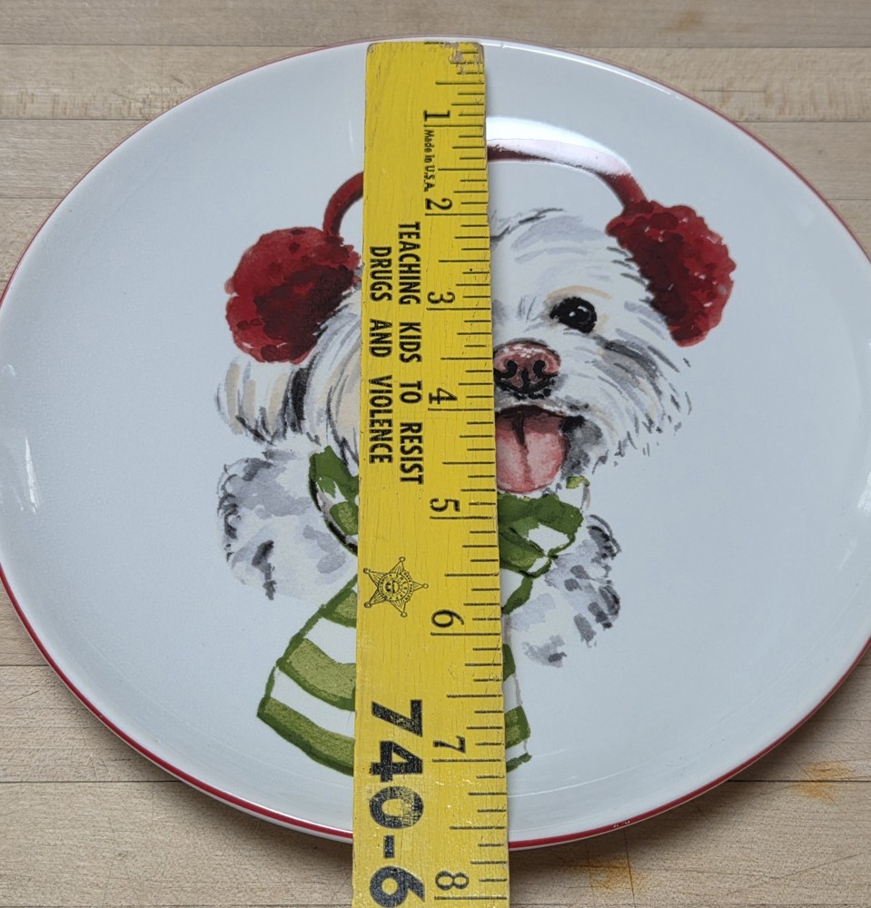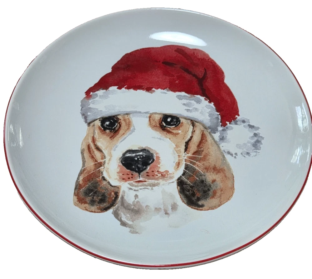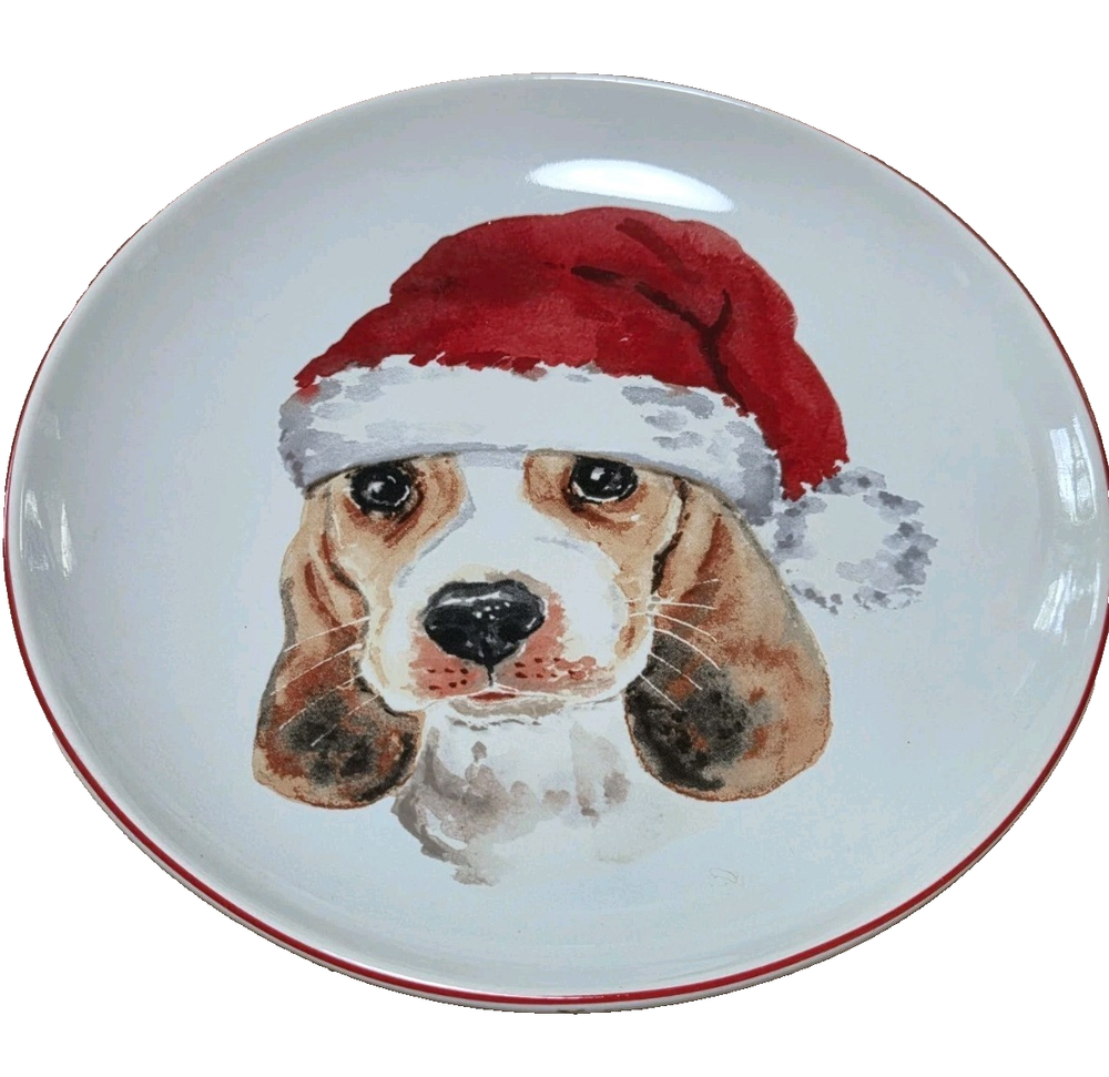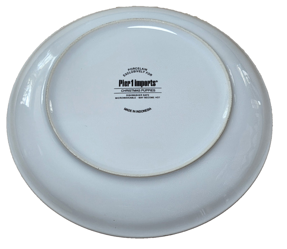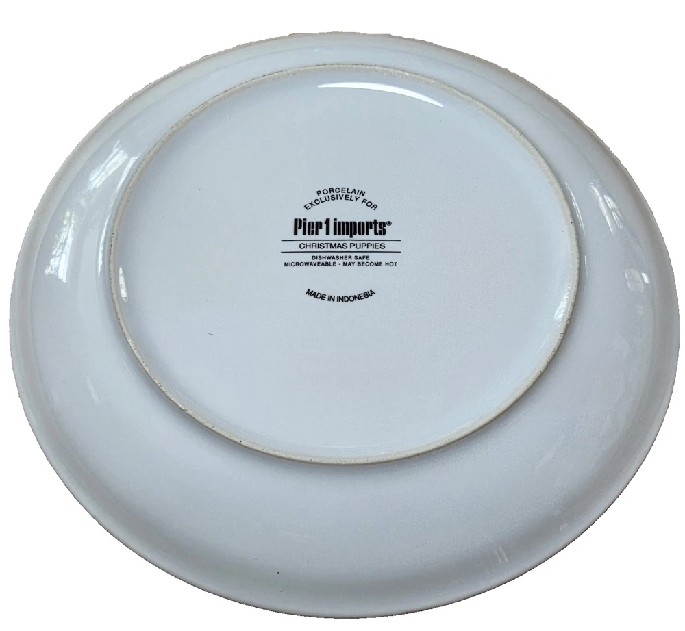 Celebrate the holiday season with the charming Pier 1 Imports Christmas Puppies Plate. This 7.75-inch round ceramic salad plate features an adorable beagle design that is sure to delight dog lovers and add a touch of whimsy to your festive table settings. The plate's multicolor pattern is perfect for Christmas, with hues that bring the joy of the occasion to your dining experience. Crafted in Indonesia, the plate is designed for contemporary use and is dishwasher safe for easy cleanup. Its unique style is complemented by a printed backstamp authenticating its quality. Whether you're hosting a holiday dinner or enjoying a meal with family, this Pier 1 plate is a delightful addition to your holiday collection. Condition: Pre-owned. No chips, cracks, or scratches. Nice pre-owned condition.