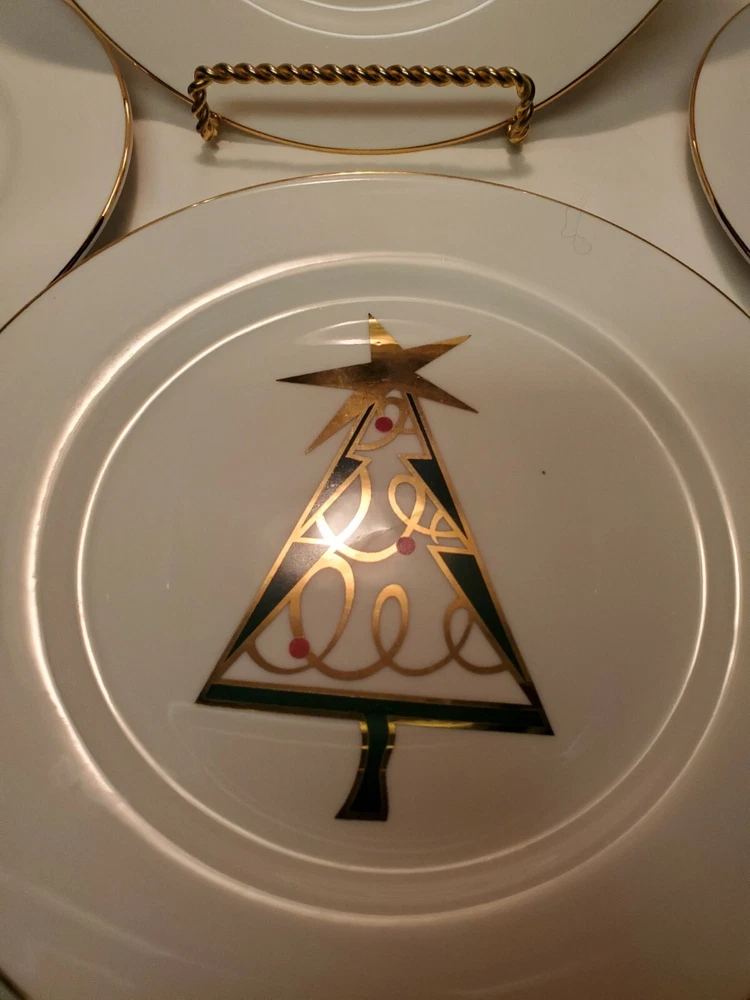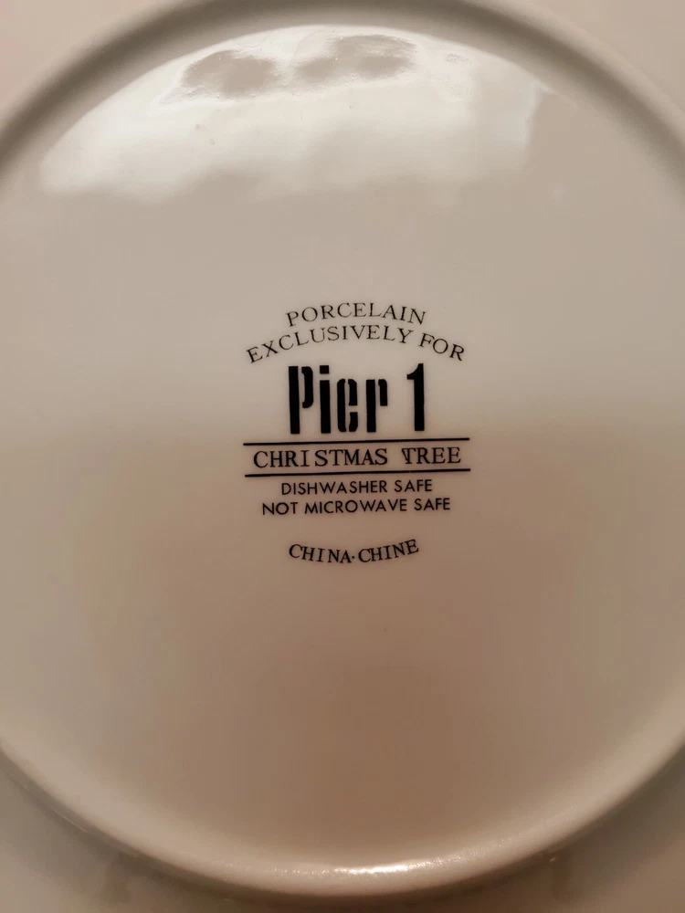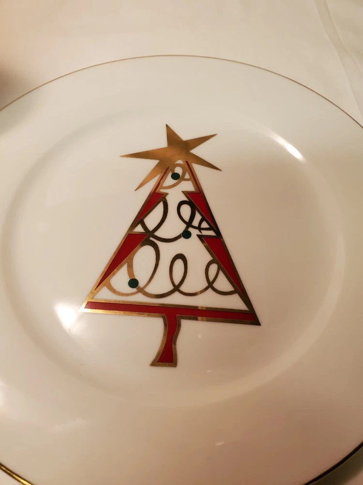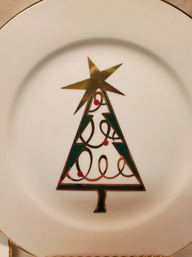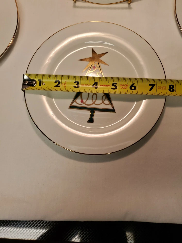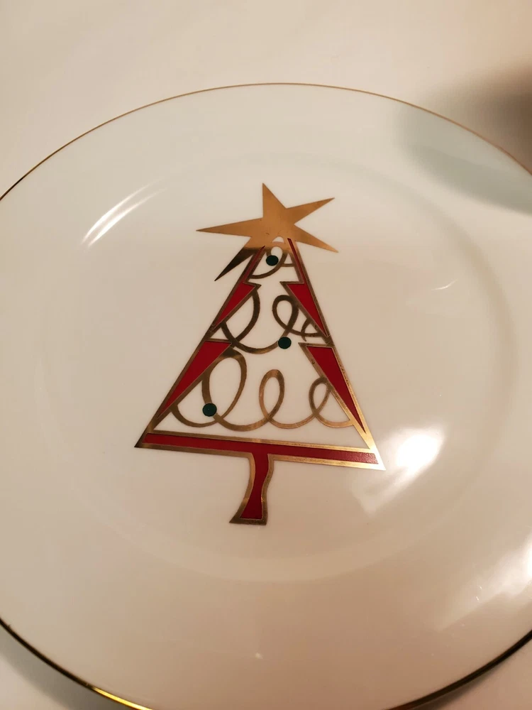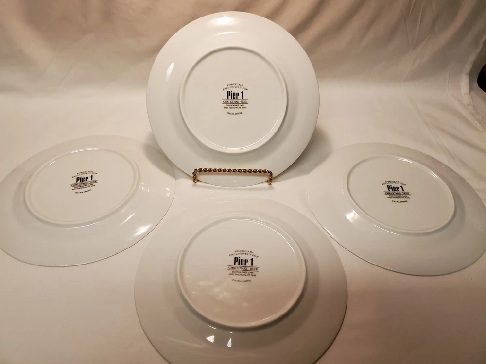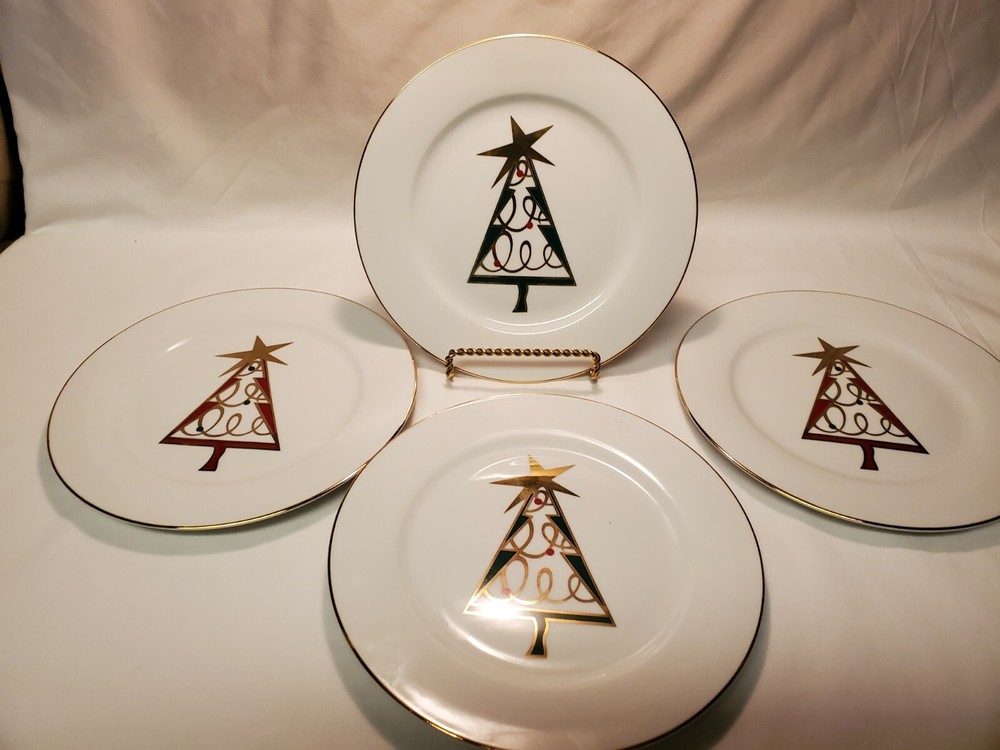 Pier 1 Christmas Tree Green Red & Gold Salad Appetizer Plates Set Of 4. Each plate measures approximately 7.5 inches across. 2 have red abd gold trees and 2 have green and gold trees. Each trimmed in gold- the gokd is worn in a few places but overall good condition. No cracks or chips. See pictures. Used items may have wear and tear and are sold as is. Item#404