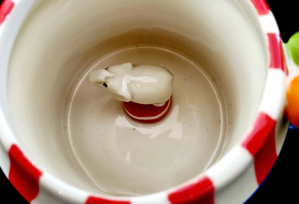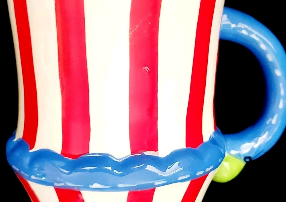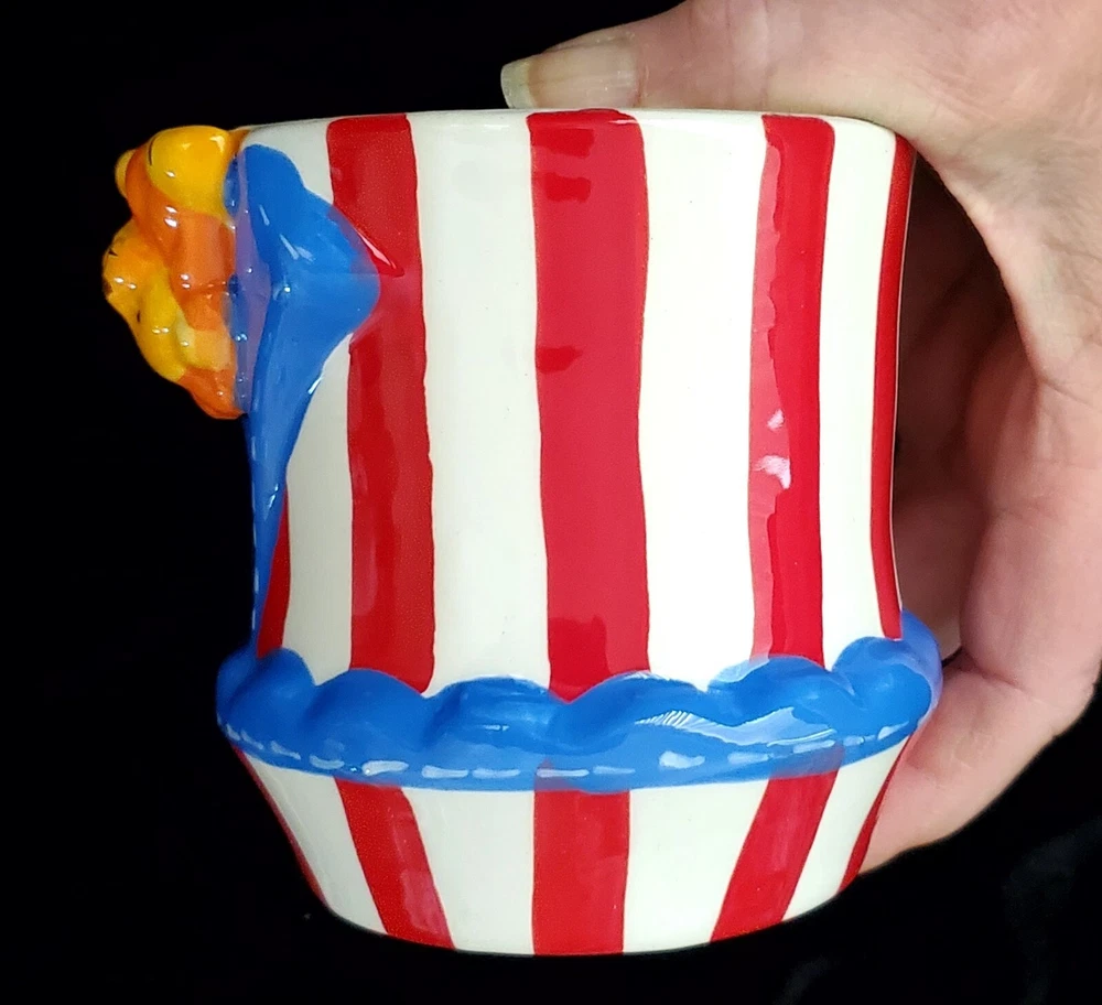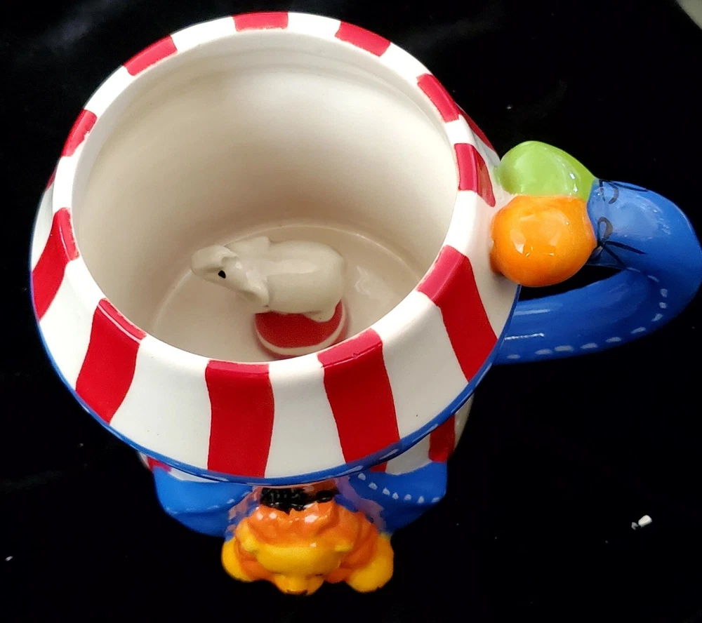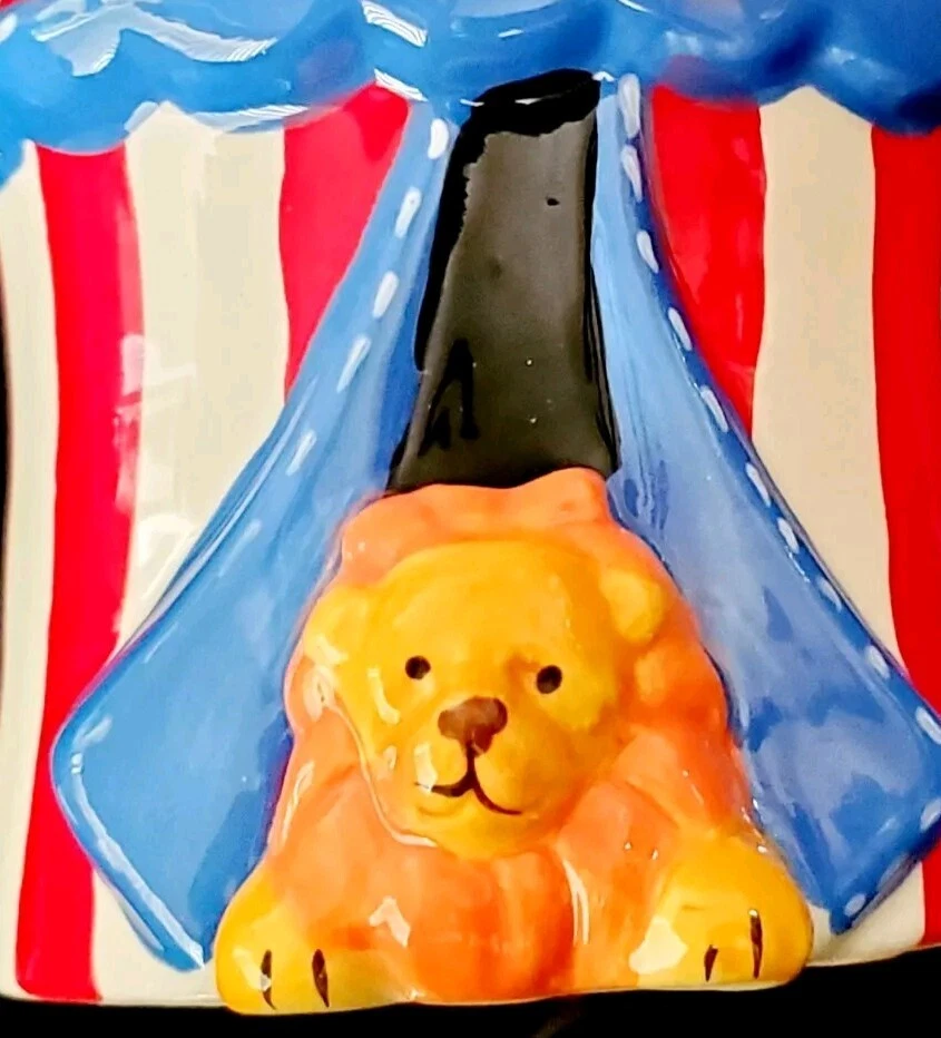 Pier 1 Imports Circus Tent Lion Elephant Peek-A-Boo Coffee Mug 3D Cartoon Style. This unique coffee mug from Pier 1 Imports features a delightful circus-themed design, complete with a peek-a-boo lion and elephant. The hand-painted earthenware material adds a touch of contemporary style to your morning routine. With a capacity of 14 ounces, this mug is perfect for both hot and cold beverages. The mug measures 4.3 inches in height, 3 inches in width, and has a diameter of 3 inches. It is a licensed reproduction and comes with care instructions to ensure long-lasting use. This coffee mug is perfect for all occasions and is sure to add a touch of whimsy to your day.