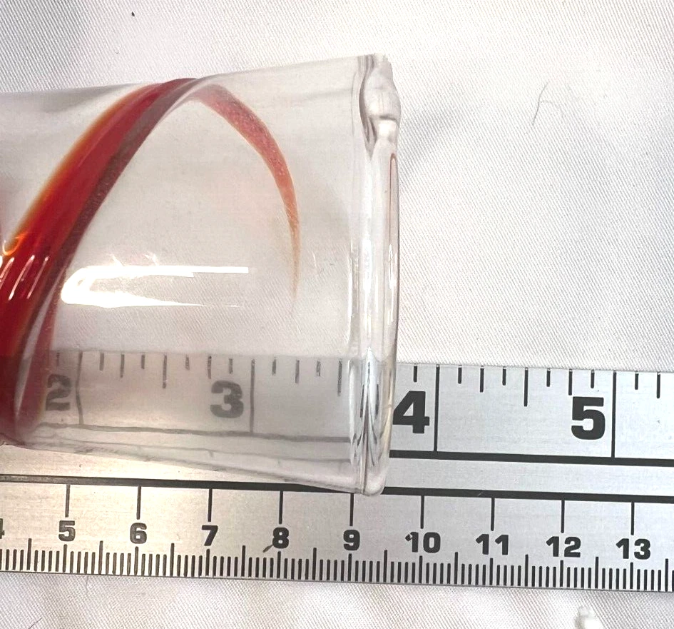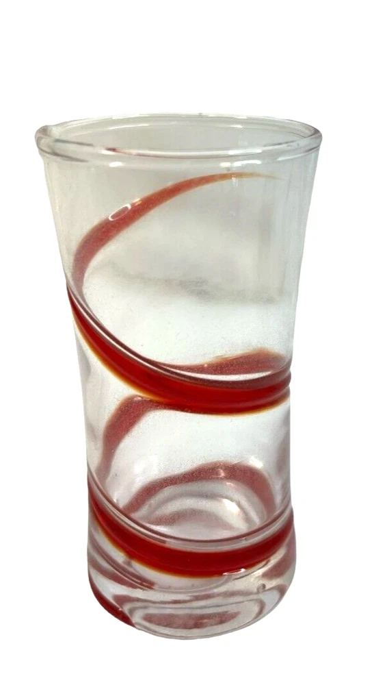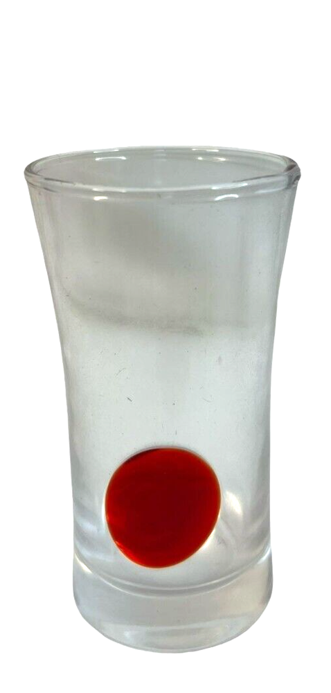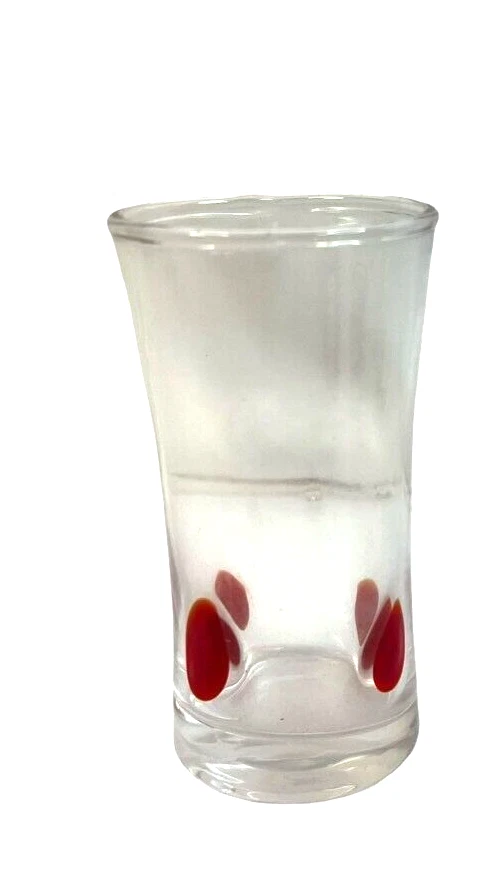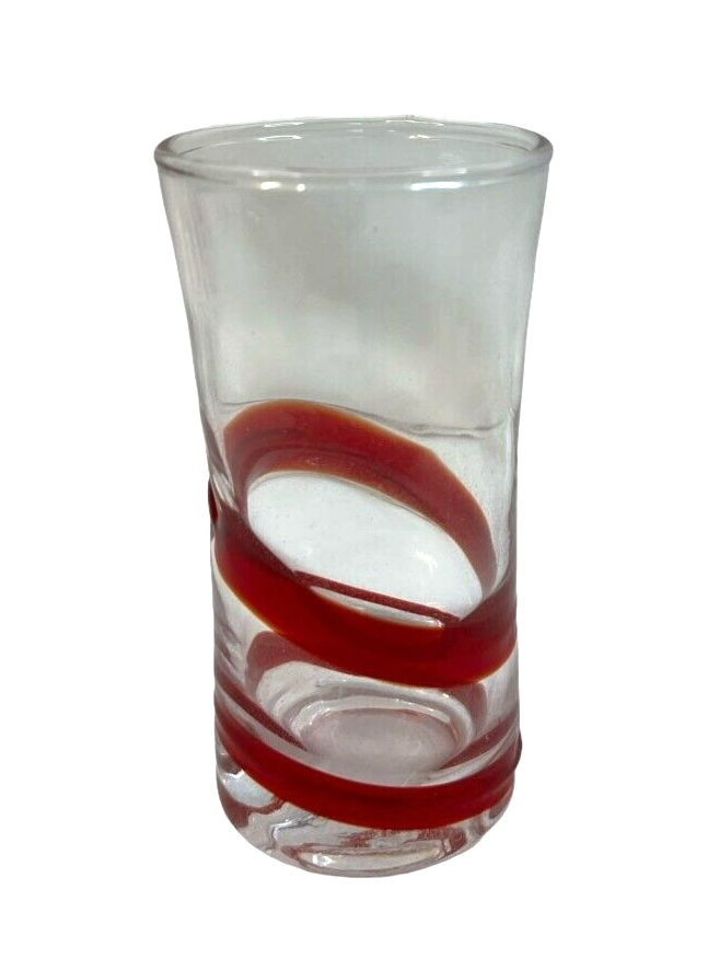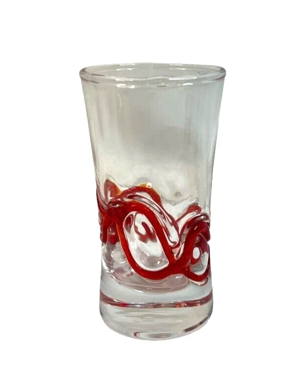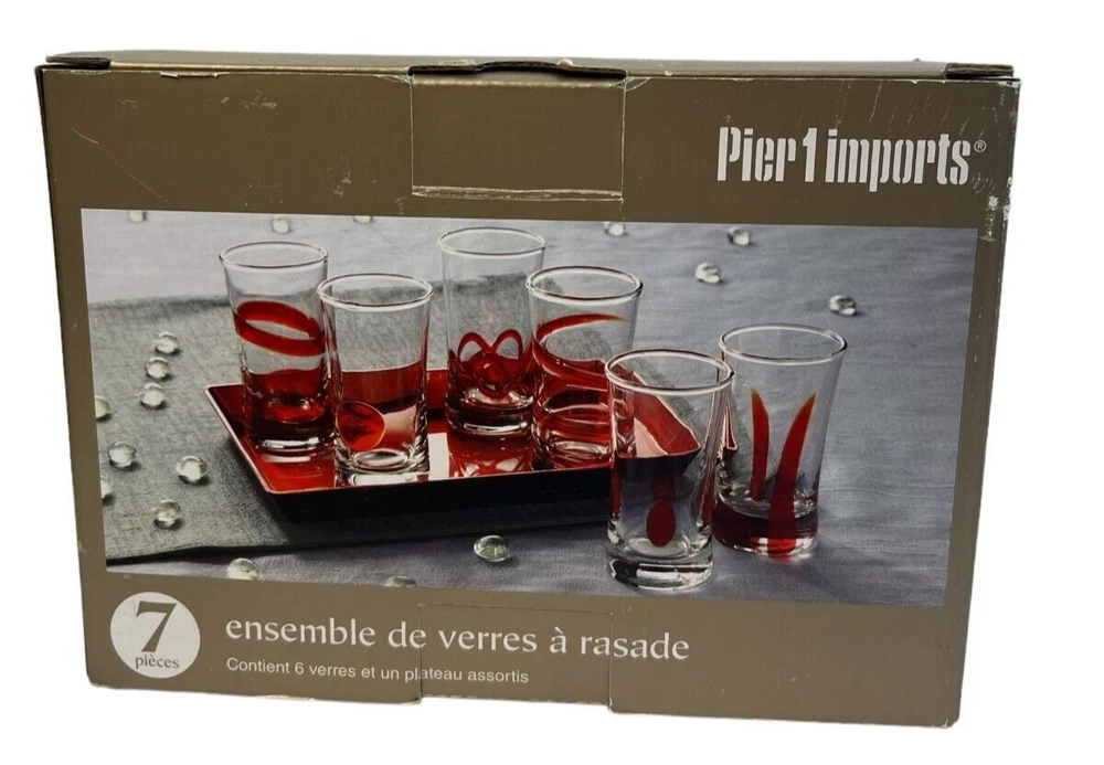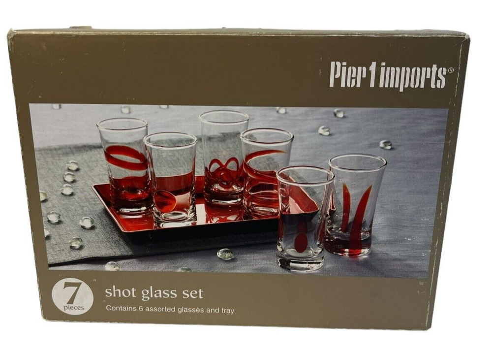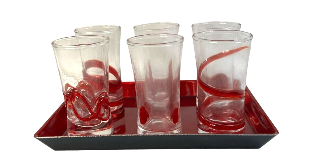 Pier 1 Imports Clear Red Geometric Shot Glasses Assorted Set Of 6 & Red Tray Length: 4 in The set includes six distinct shot glasses, each with its own geometric pattern, allowing for a varied and visually appealing presentation. The accompanying red tray not only enhances the aesthetic appeal but also provides a convenient way to serve and display the glasses.