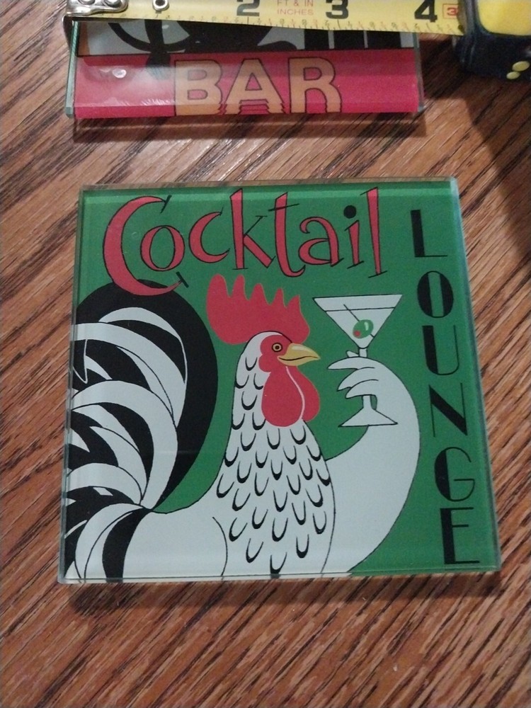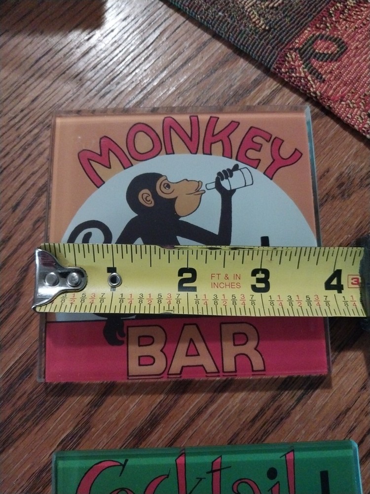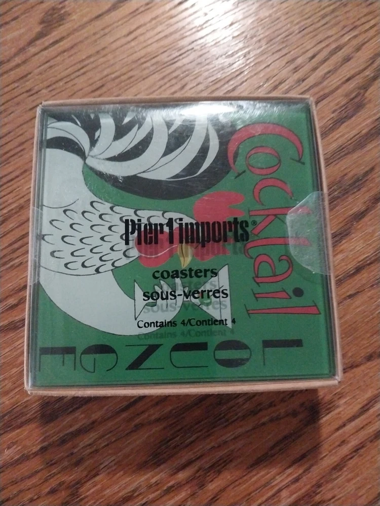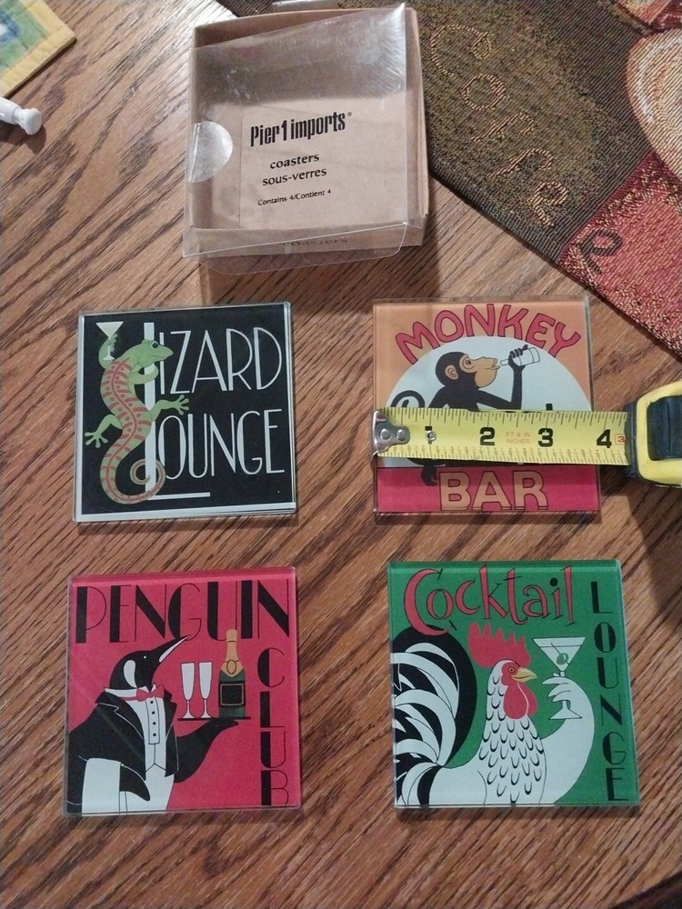 Enhance your barware collection with this set of four Pier 1 Imports coasters. The tropical palm leaf pattern and multicolor design allow for use on all occasions and add a modern touch to any home decor. Made of lightweight glass, these square coasters are stackable and multifunctional. Measuring 4 inches in length and width, this coaster set is perfect for protecting your furniture from any beverage spills. Hand wash only for long-lasting use. The LOUNGE Collection coasters are a must-have addition to any home bar and are made in the United States. NEW in box, i opened the box to take photos of these beauties.
