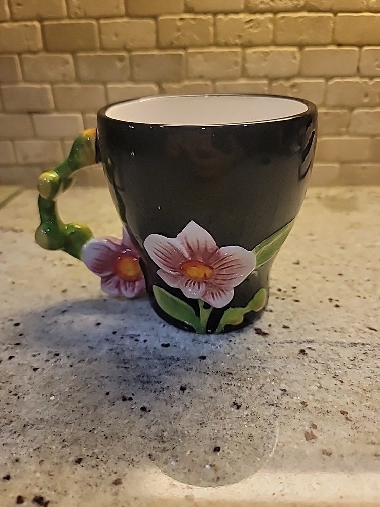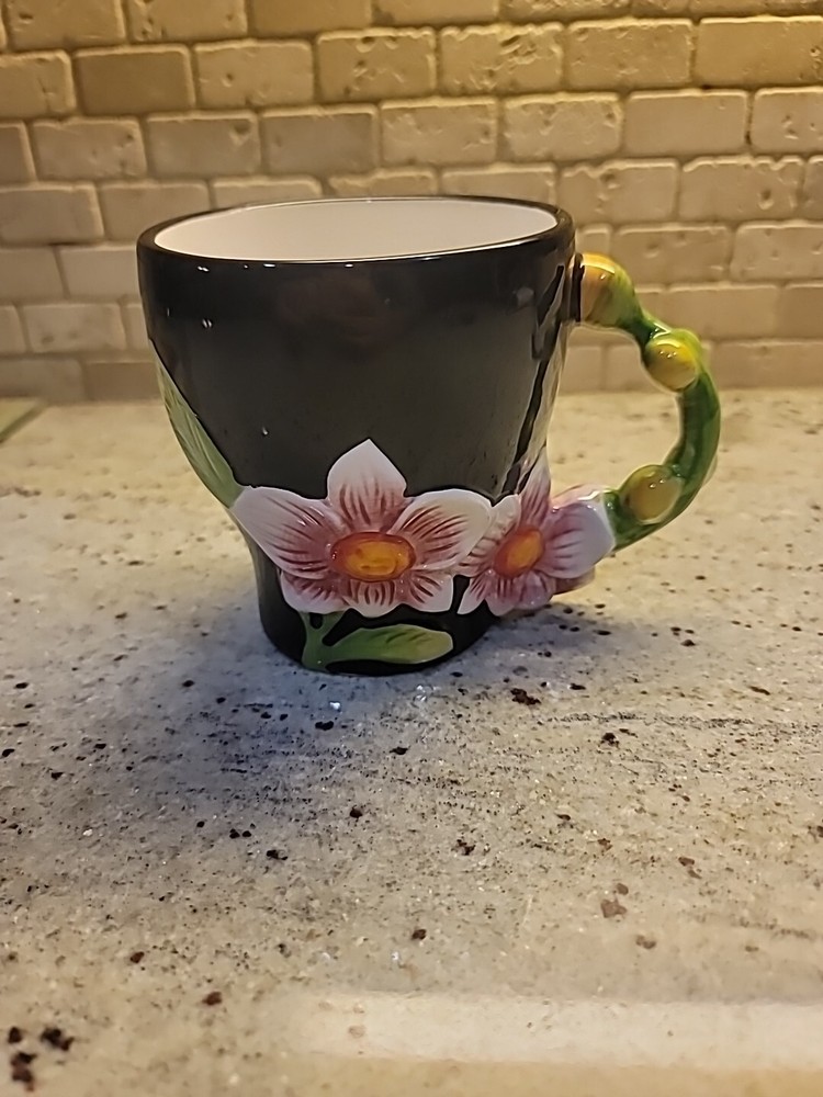 Add a touch of tropical flair to your morning coffee routine with this hand-painted Pier 1 Imports coffee mug. The vibrant floral design is sure to brighten up your day, while the sturdy stoneware construction ensures durability for everyday use. This rare and unique coffee cup is a must-have for any collector or coffee lover looking to add some personality to their kitchenware. Ideal for sipping your favorite hot beverage, this mug is a colorful addition to any home decor.