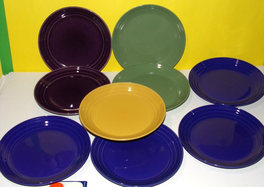 Pier 1 Imports Color Essentials 7 3/4" Salad Plates Bands Rings Set of 9 Mixed - 4 Blue, 2 Green, 2 Purple, 1 Yellow - No chips or cracks. In good shape, Glossy and bright. Normal use wear, Nothing heavy / Deep - NO SHIPPING TO ALASKA, HAWAII, US TERRITORIES OR PO BOXES