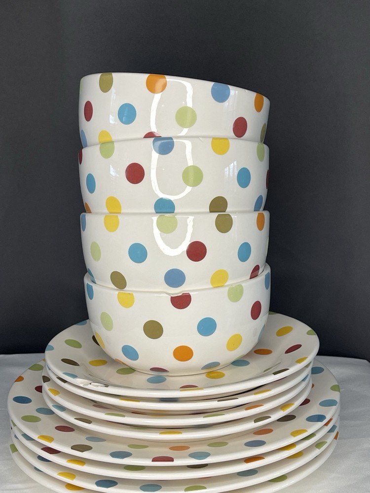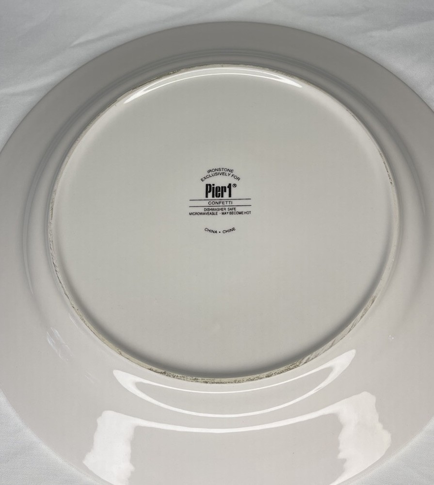 This Pier 1 Imports Confetti 11” Dinner Plate Replacement features a vibrant multicolor polka dot pattern on a round stoneware plate. With a glossy finish, this dinner plate is part of the Ironstone product line and is microwave and dishwasher safe for convenient use. Manufactured in 2010, this original piece from the 21st Century brings a playful touch to all occasions with its cheerful design. Perfect for adding a pop of color to your table setting, this dinner plate is a stylish and functional addition to your kitchen collection. This listing is for one plate only! Other items available in my listings. Will combine shipping.