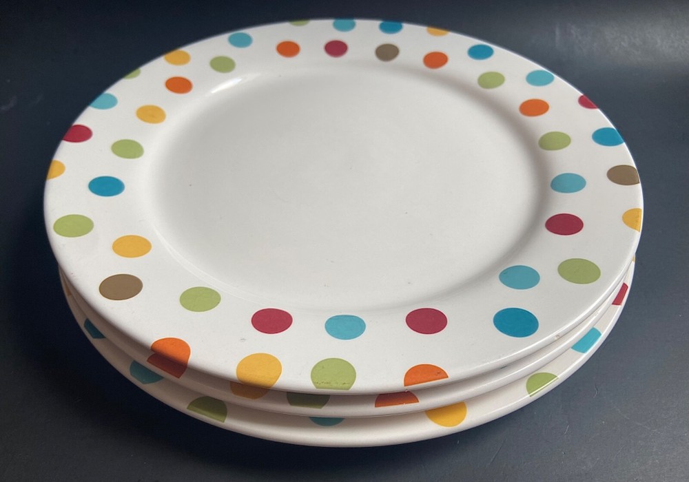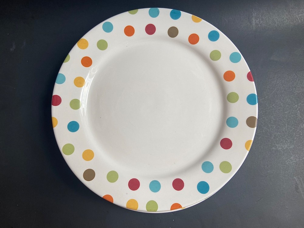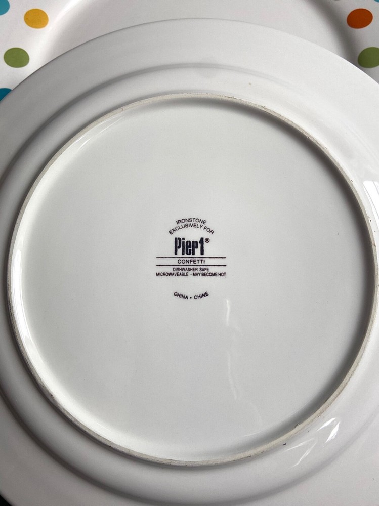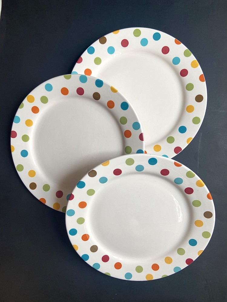 Up for auction is a Lot of THREE (3) Pier 1 Imports Confetti Ironstone Dinner Plates with Polka Dots around the rim. Approximately 11" Diameter. All are in great condition,no Chips or Cracks or visible Scratches; only light signs of prior ownership, and light scuffs from shelf life. Shipped USPS.