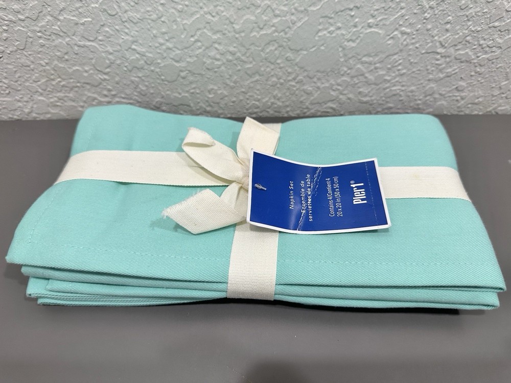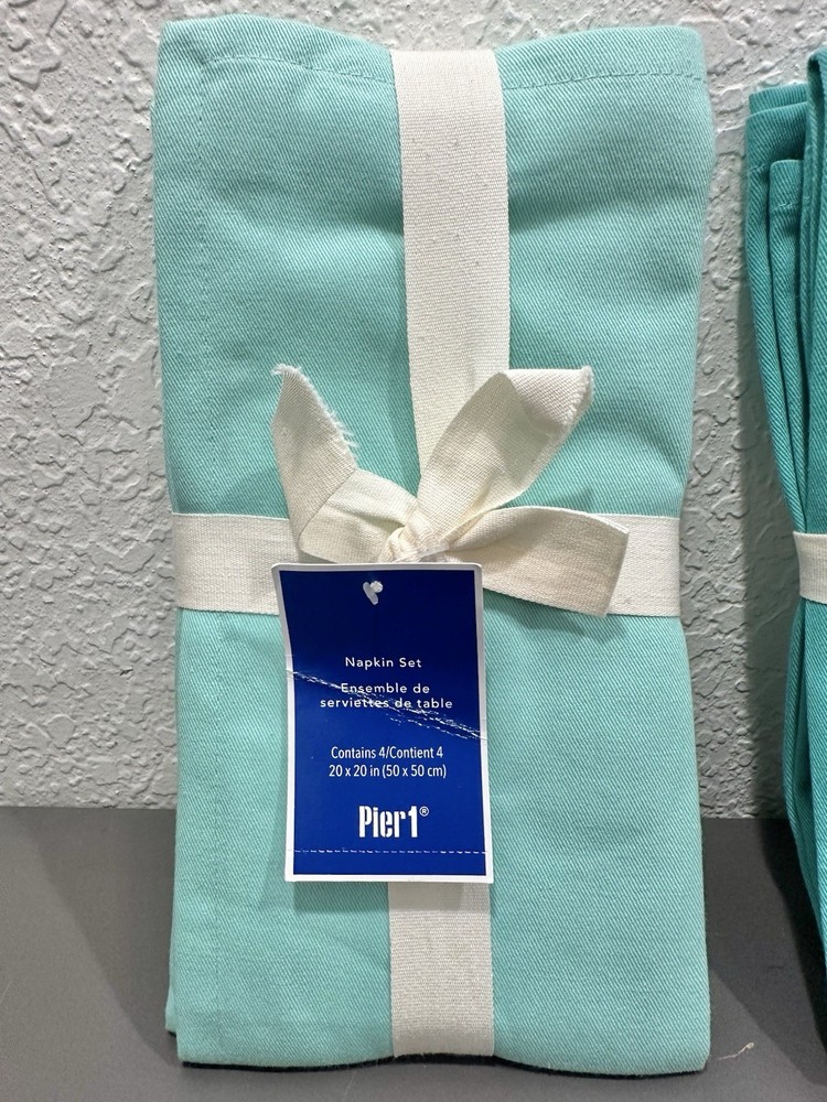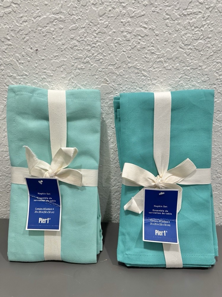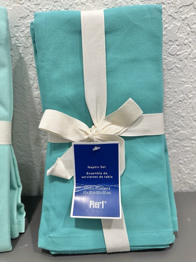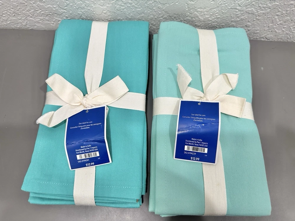 Please look at the pictures as the lot has two sets and they are both slightly different in shades of aqua/teal. Also please note there are small specs on the bow part of the napkins. Lot will bring 8 napkins total. The Pier 1 Imports Cotton Napkins in Aqua/Teal are a stylish addition to any dining table. Made from soft cotton and featuring a solid aqua/teal color, these square-shaped napkins are perfect for everyday use. With sets of 4 in each package, these machine washable napkins are ideal for various occasions and add a touch of transitional style to your kitchen or dining room decor. Made in India, these napkins are both practical and elegant, making them a must-have for any home. If you have any questions please feel free to ask and thanks for stopping by.