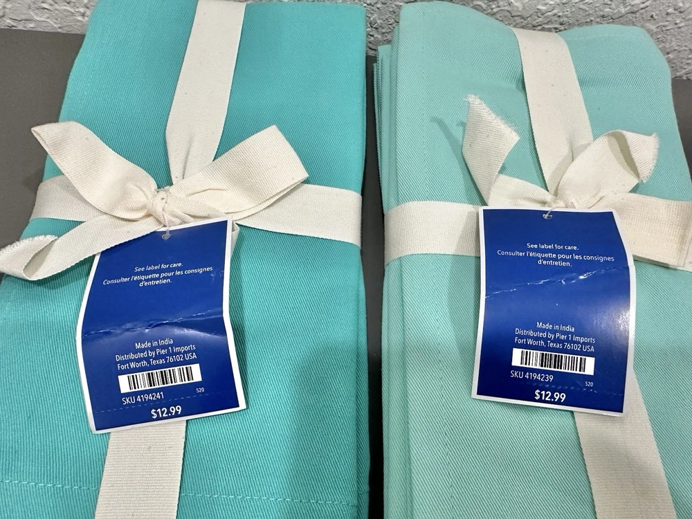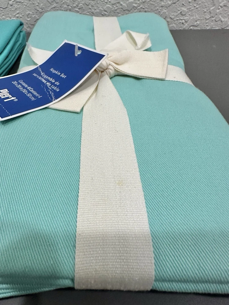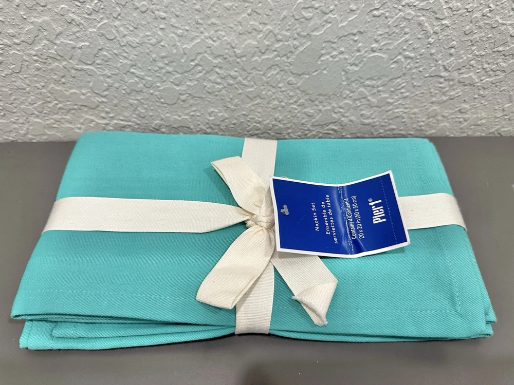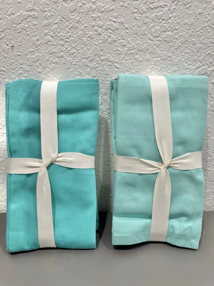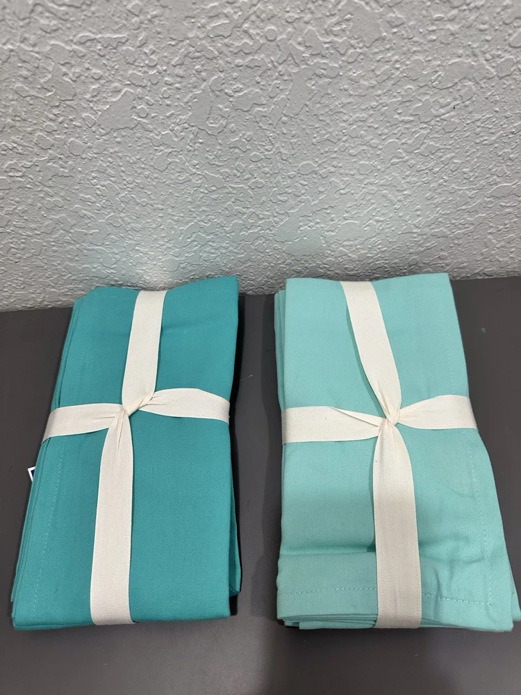 Please look at the pictures as the lot has two sets and they are both slightly different in shades of aqua/teal. Also please note there are small specs on the bow part of the napkins. Lot will bring 8 napkins total. The Pier 1 Imports Cotton Napkins in Aqua/Teal are a stylish addition to any dining table. Made from soft cotton and featuring a solid aqua/teal color, these square-shaped napkins are perfect for everyday use. With sets of 4 in each package, these machine washable napkins are ideal for various occasions and add a touch of transitional style to your kitchen or dining room decor. Made in India, these napkins are both practical and elegant, making them a must-have for any home. If you have any questions please feel free to ask and thanks for stopping by.