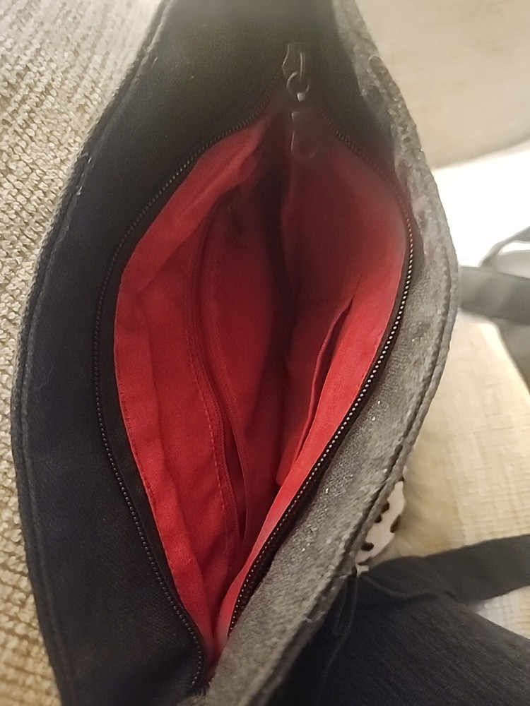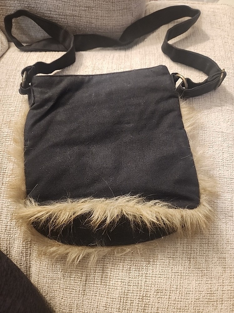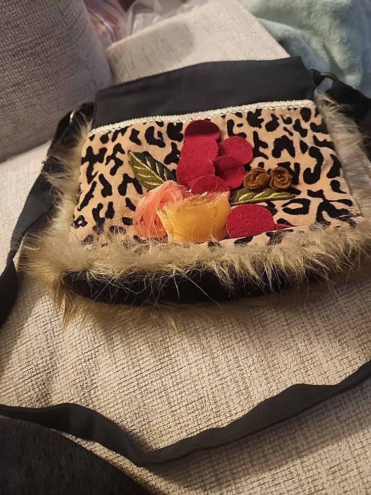 This beautiful crossbody bag from Pier 1 Imports features a stunning floral pattern in black, brown, red, and pink. It has a zip closure and a crossbody strap with a brown color. The bag is lined with pink, features fur trim accents, medium size.