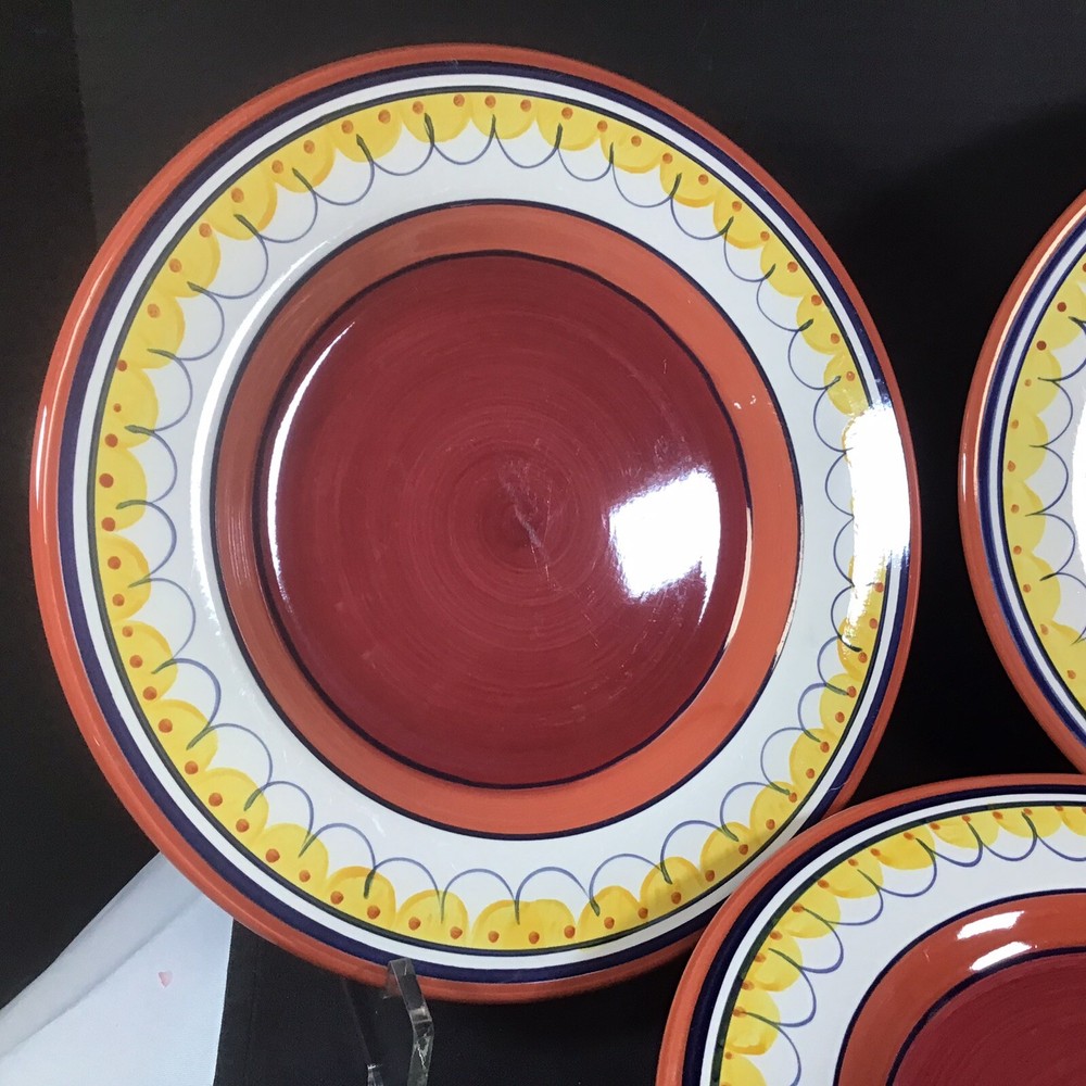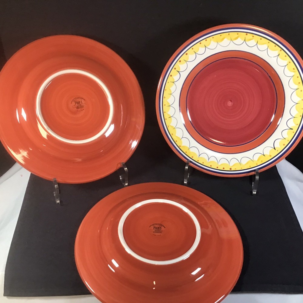 Up for your consideration is this ( lot of 3) Pier 1 Imports DEL SOL 11” Dinner Plate with Red Center. Selling three for the price of 2. One plate has a very small chip on the outside rim(see photo). plates are in good condition considering they were a used daily. Center of each plate has normal utensil scratches. Color is still very vibrant. As with all my listings if you’re not satisfied with my described condition, please take advantage of my return policy. Plates are packaged and ready to mail today or the next business morning. Thanks for looking at my listing. CEC-