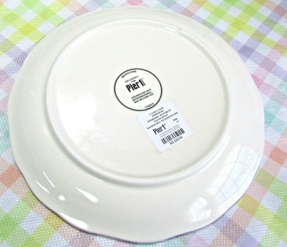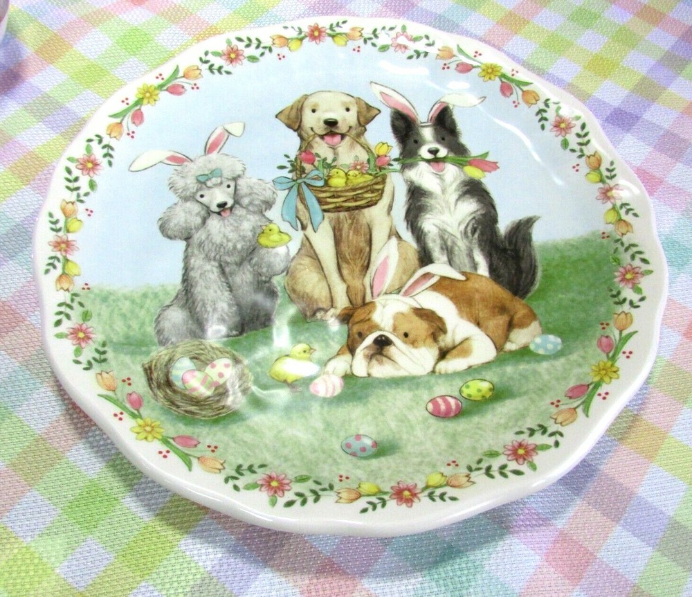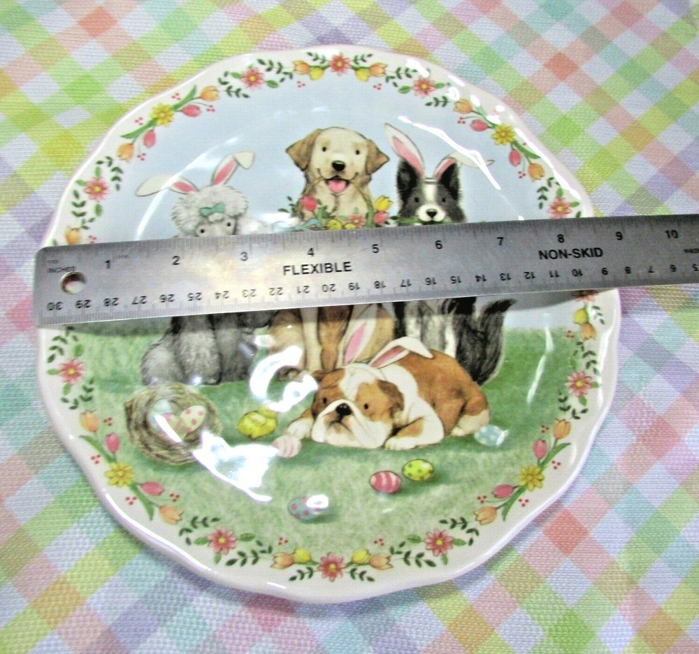 Adorable! NWT Pier 1 Imports DOG EASTER PARADE Dinnerware 9" Plate. The tag lists the diameter as 8.7". I have more new plates available, this listing is for just 1 plate. If you are interested in more than one, please message me before purchase so I can combine shipping and give you an accurate shipping quote. I also have new matching drinking glasses. All sales final, no returns, exchanges or refunds. I am not accepting offers on this item at this time.