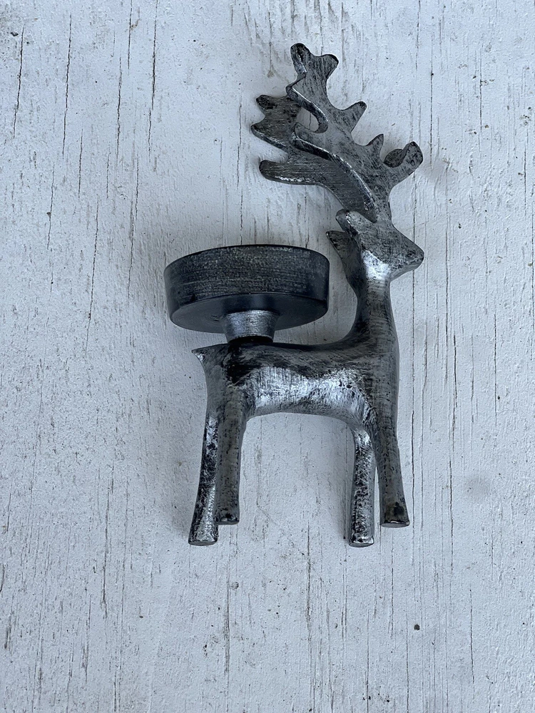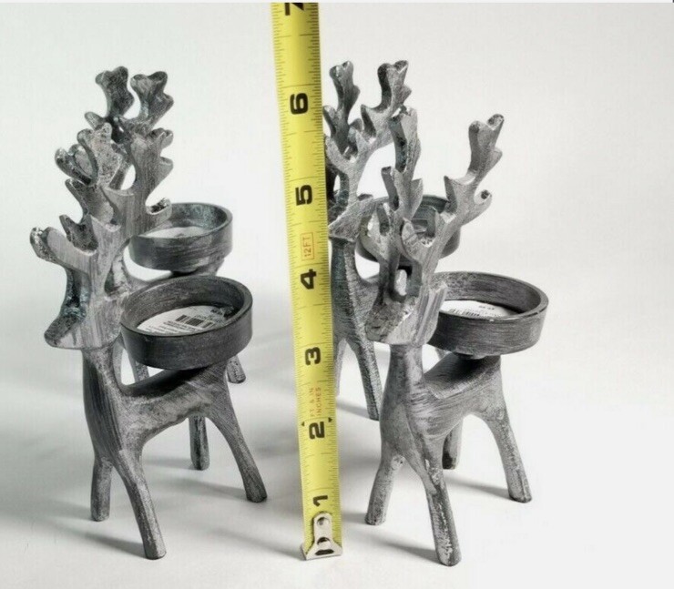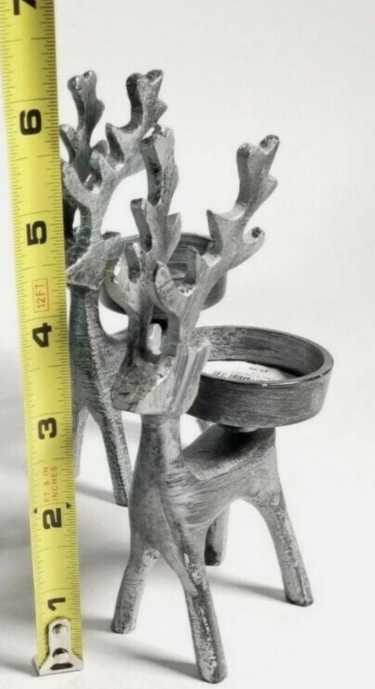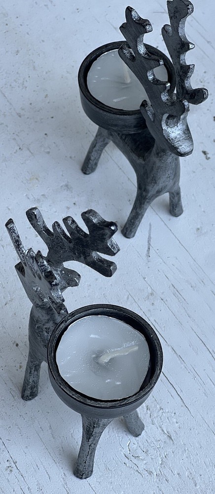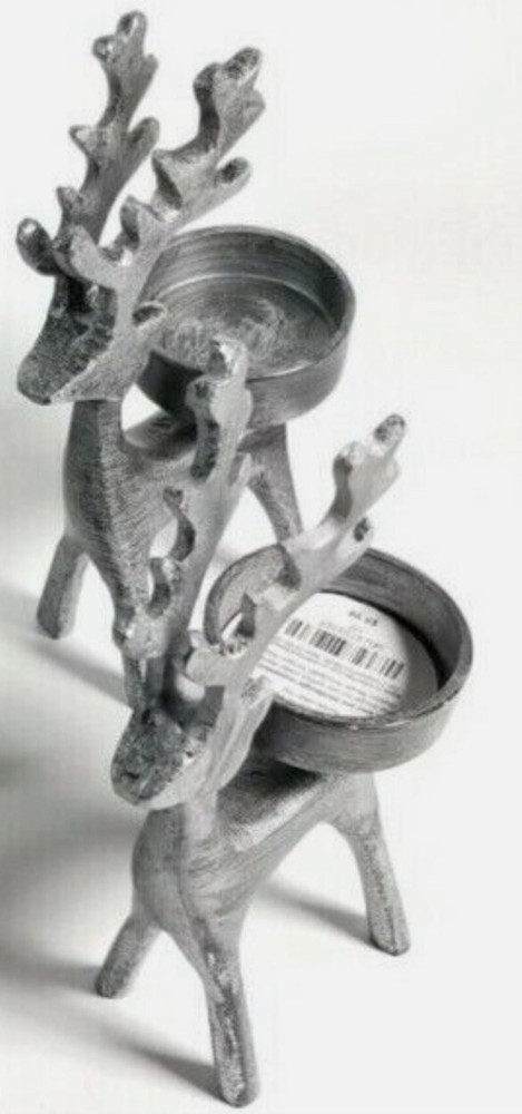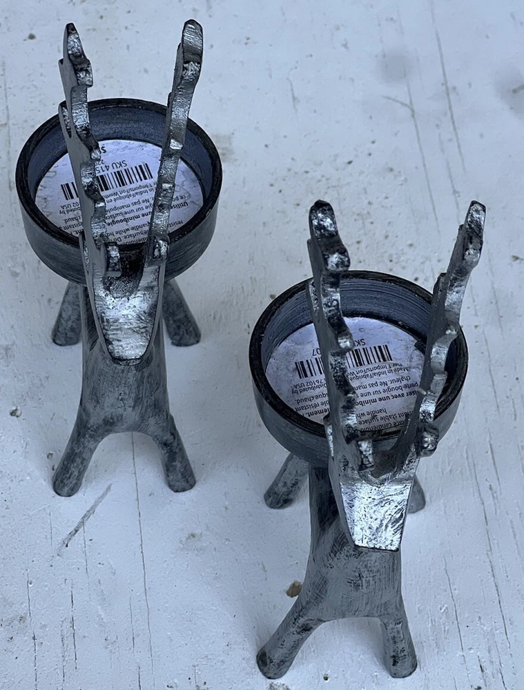 Add a touch of whimsy to your home decor with this set of two Pier 1 Imports deer/reindeer candle holders. Perfect for all occasions, these small, gray candle holders are textured and feature a charming deer theme. Measuring 5.5 inches in height and 3 inches in length, they are the ideal size for any candle. Whether you're looking to decorate your living room or add a cozy touch to your bedroom, these candle holders are a must-have.